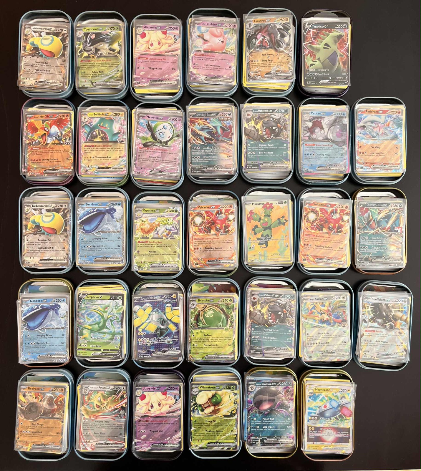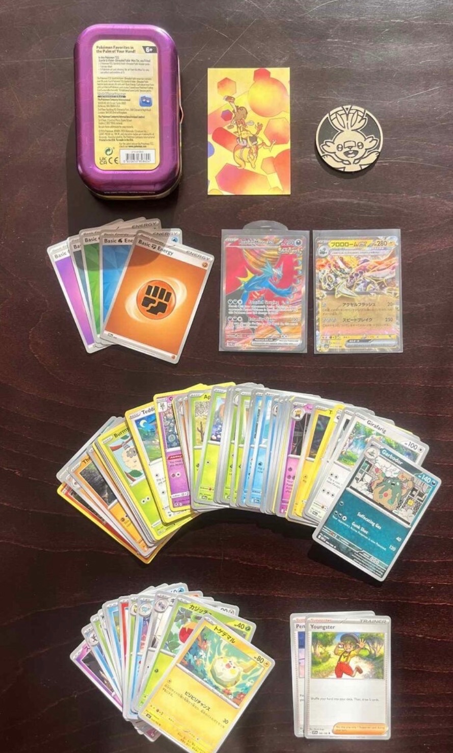 Zdravím,manžel končí s kartami a rozhodol sa urobiť malým/veľkým zberateľom radosť.Pripravil pár Tiniek(plechové krabičky) s Pokémon kartami.Všetky karty originál a bez poškodenia…Každá Tinka obsahuje 67 Pokémon kariet,prevažne zo sérii Destined Rivals,Journey Together,White&Black,ale aj staršie karty-KTORÉ SA NEOPAKUJÚ!!(v každej Tinke je 48 anglických a 12 japonských),jeden pin(žetón s motývom pokémona),5 energii,1x 🏴 hit(V,Vmax,Vstar,Ex,FullArt) a 1x🇯🇵 hit(V,EX,Holo)-Takže spolu 67 kariet….Na fotkách je vidno aké 🇯🇵a🏴Hity sa nachádzajú v Tinkách a čo môže napr obsahovať 1xTinka a aké karty v nej môžu byť…Končíme s kartami a dúfam,že takéto balíčky urobia niekomu radosť!!!…