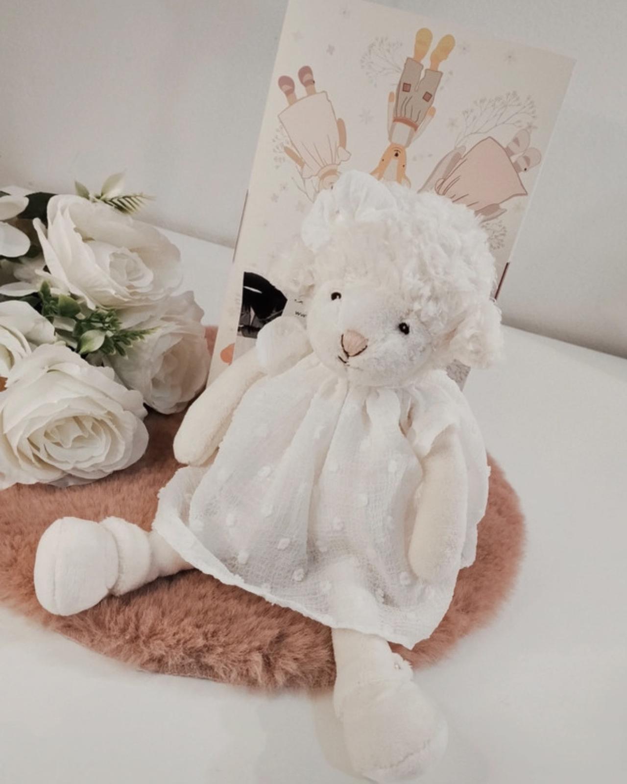 Oblečená v bielych mušelínových šatách z mäkkého materiálu, s láskavým výrazom a nežnými detailmi, pôsobí ako rozprávková spoločníčka pre malé i veľké duše.