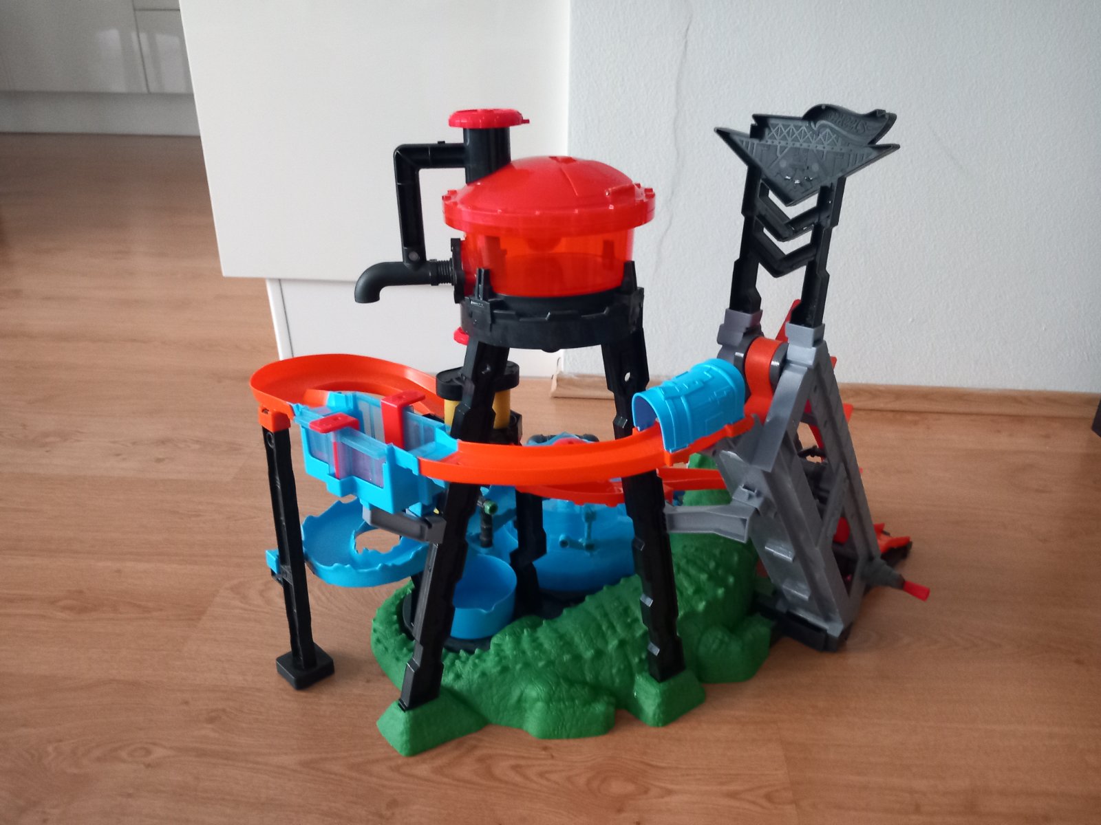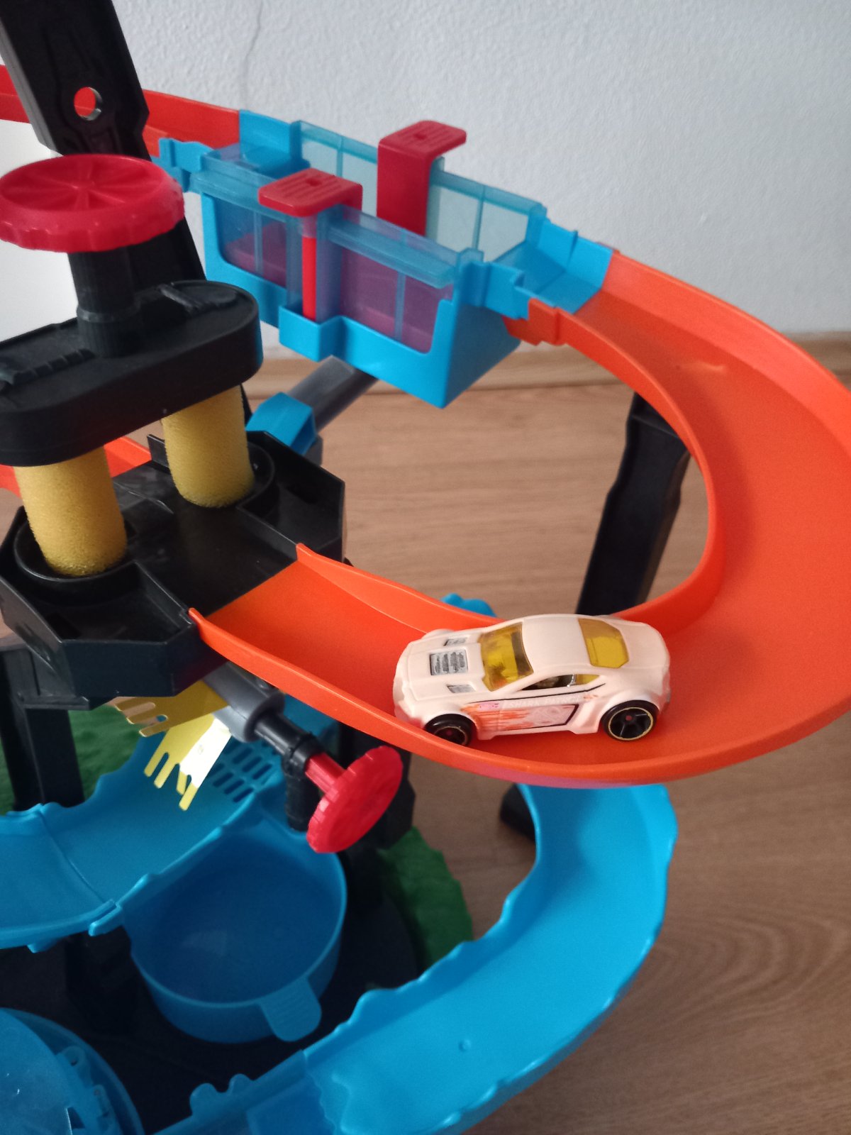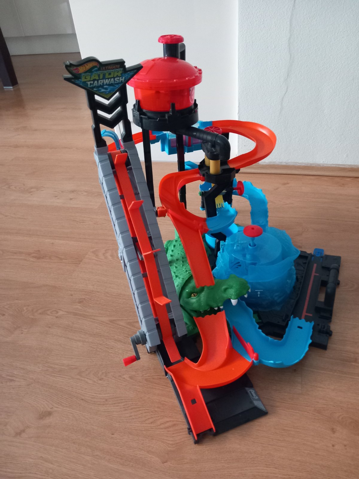 Predám autodráhu autoumývačku Hot Wheels aj s autíčkom. Do vrchnej červenej časti sa napustí teplá voda a do spodnej modrej časti sa napustí studená voda. Autíčka sa výťahom vľavo vyvezú a spúšťajú sa autodrahou kde sa najprv okúpu v teplej vode a potom idú do modrej časti, kde je studená voda a stláčaním červeného piestu v modrej časti ich vypumpujete do tlamy aligatora. Dráha je vo výbornom stave. Možný len osobný odber v Petržalke.