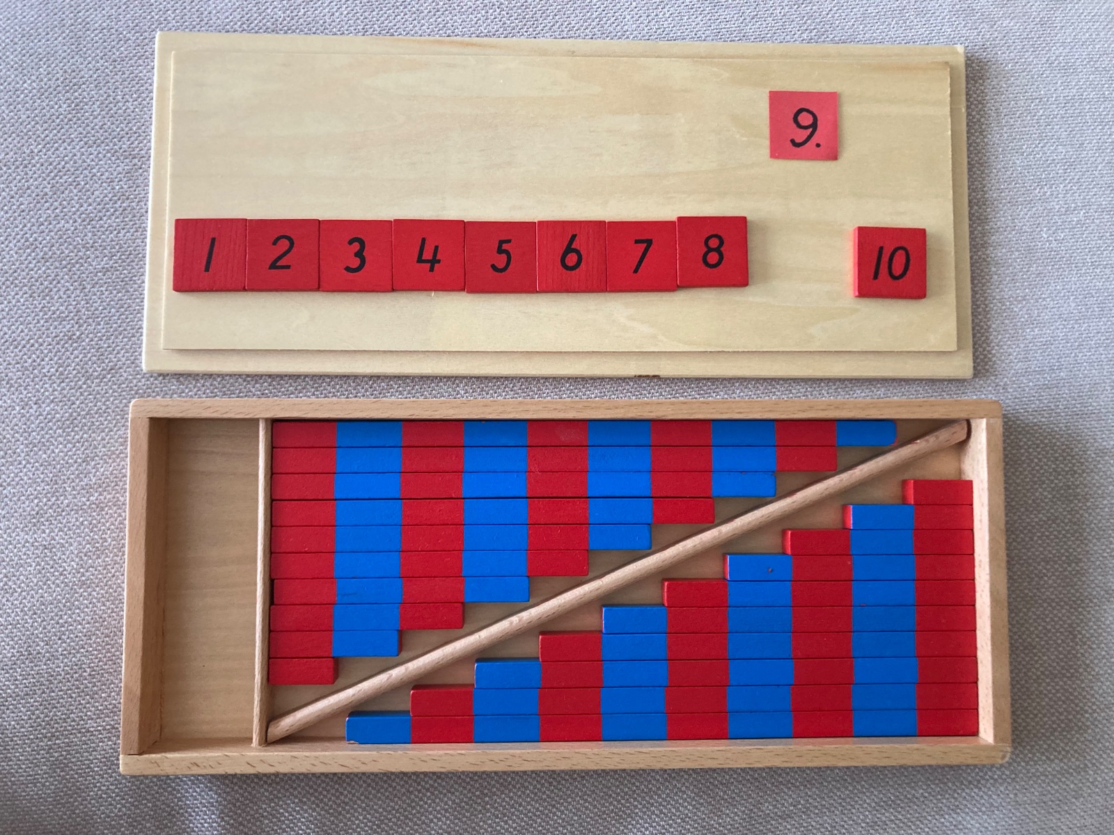 Montessori číselné, červenomodré, numerické tyče menšej veľkosti. Najdlhšia tyč má 25 cm. Vidno známky používania - vid foto. Tyče sú všetky, ale chýba číslica 9 - nahradená papierovým číslom - viď foto. Kupované z Číny.