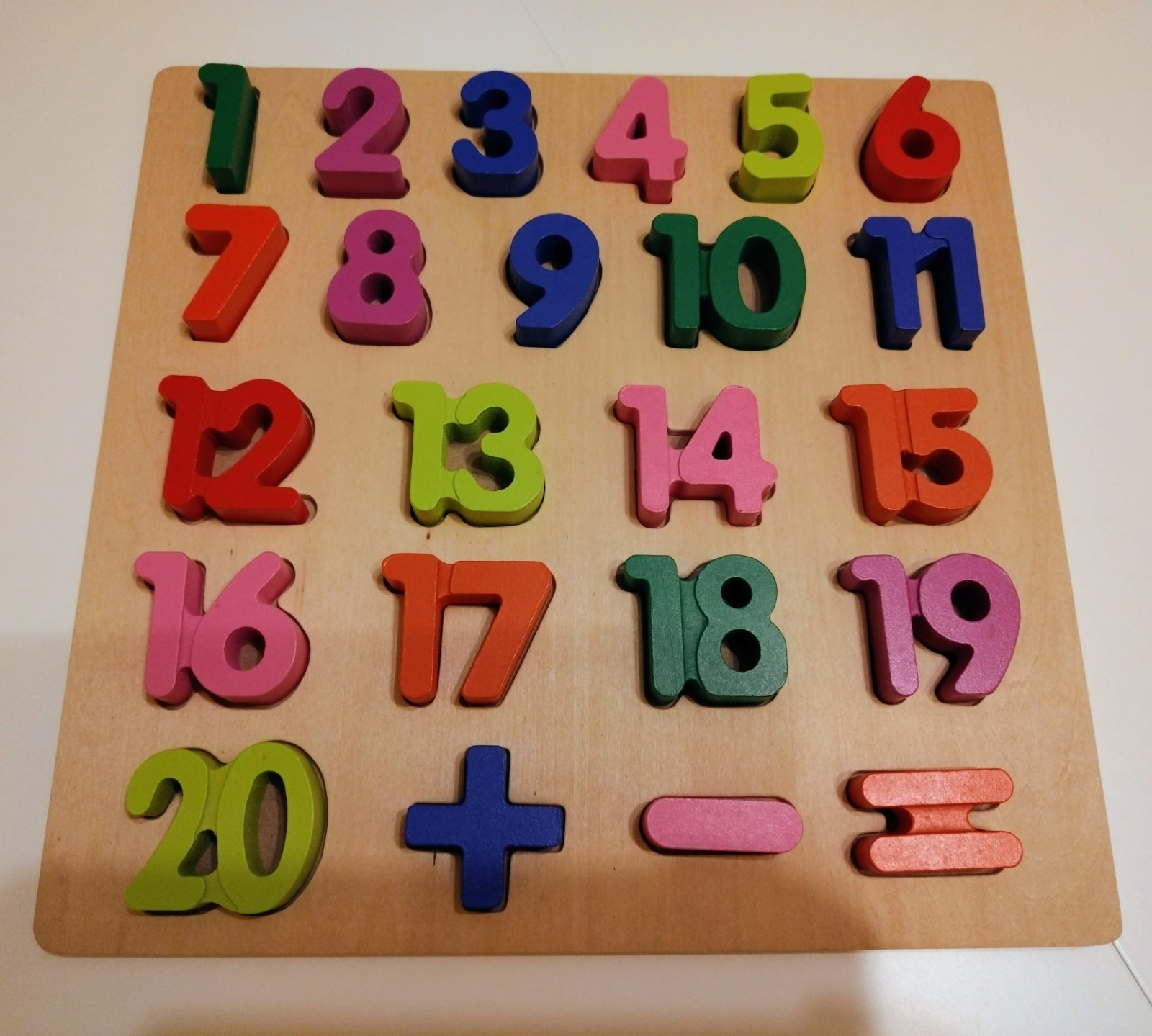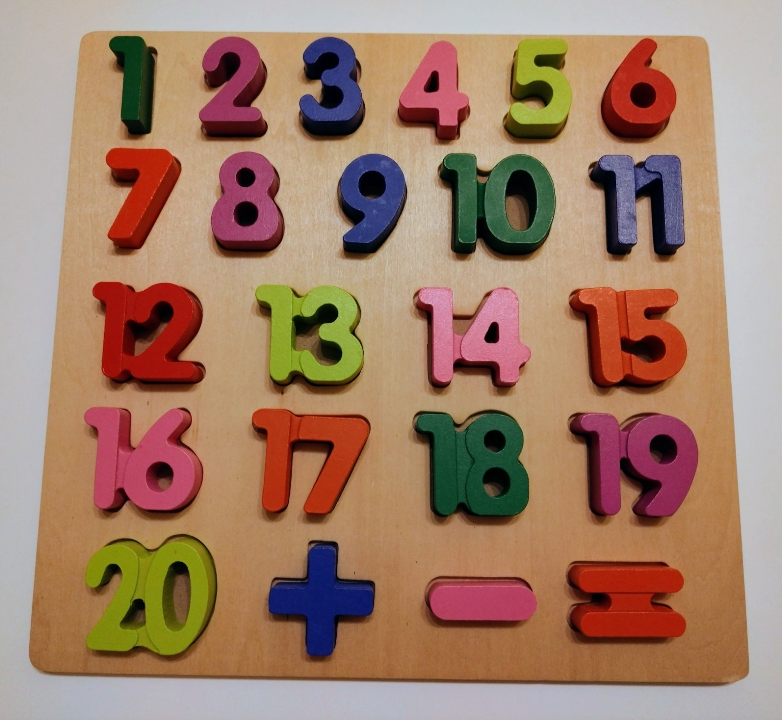 Drevená vkladačka s číslami, edukačná pomôcka určená pre deti (zvyčajne od 3 rokov), ktorá pomáha pri poznávaní čísel od 1 do 20 a základných matematických operácií. Tento typ hračky rozvíja jemnú motoriku, logické myslenie a koordináciu oko-ruka.