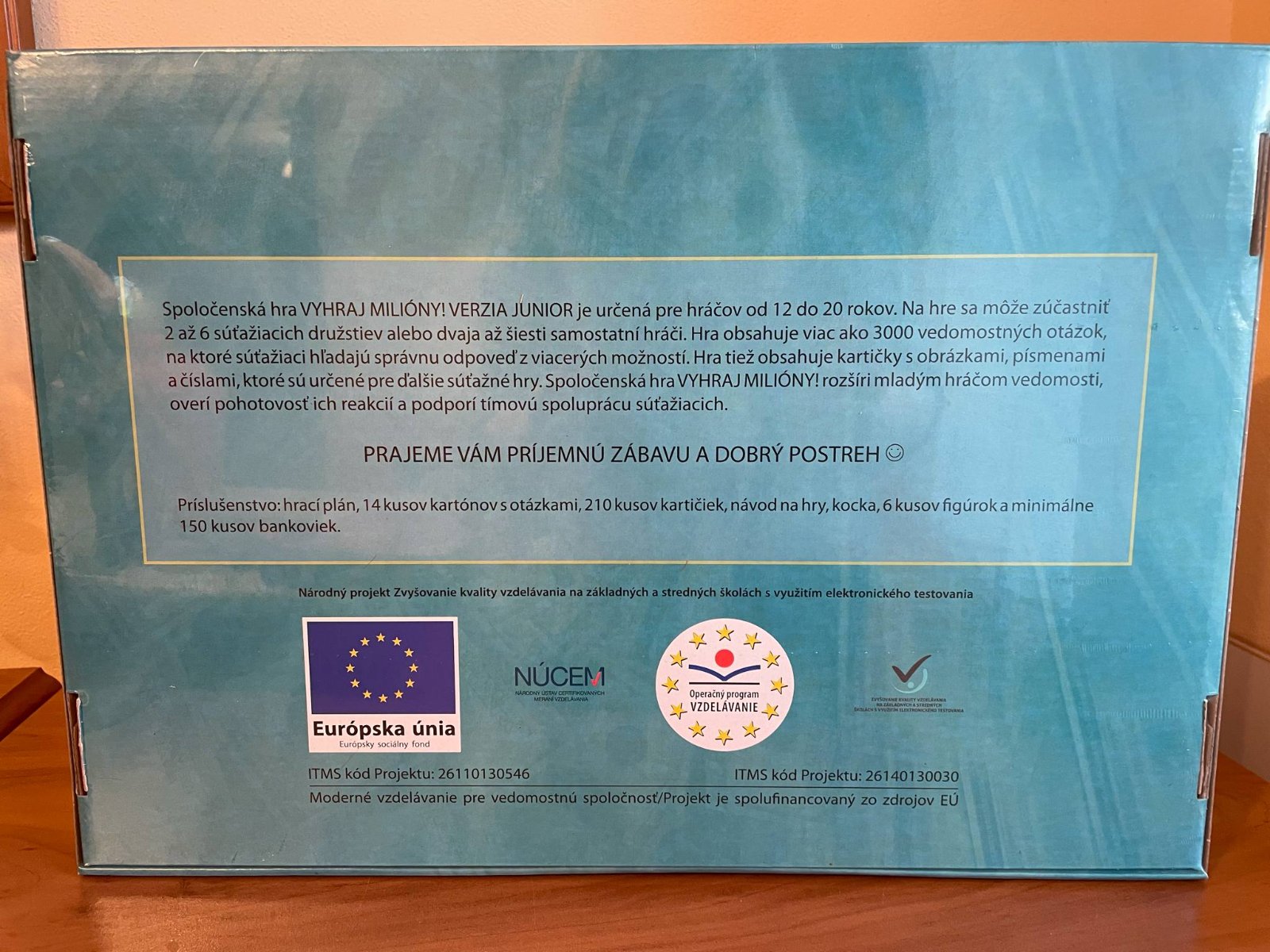 Spoločenská hra pre opakovanie si vedomostí u detí. Ideálna hra na prázdniny. Hra Vyhraj milióny vo verzii Junior je určená pre deti od 12 rokov. Obsahuje vyše 3000 vedomostných otázok, ktoré vychádzajú z učiva základnej školy. Za správne odpovede hráči získavajú body, vyhráva ten hráč, ktorý získa najviac bodov. Preverte deťom ich vedomosti hravou formou.