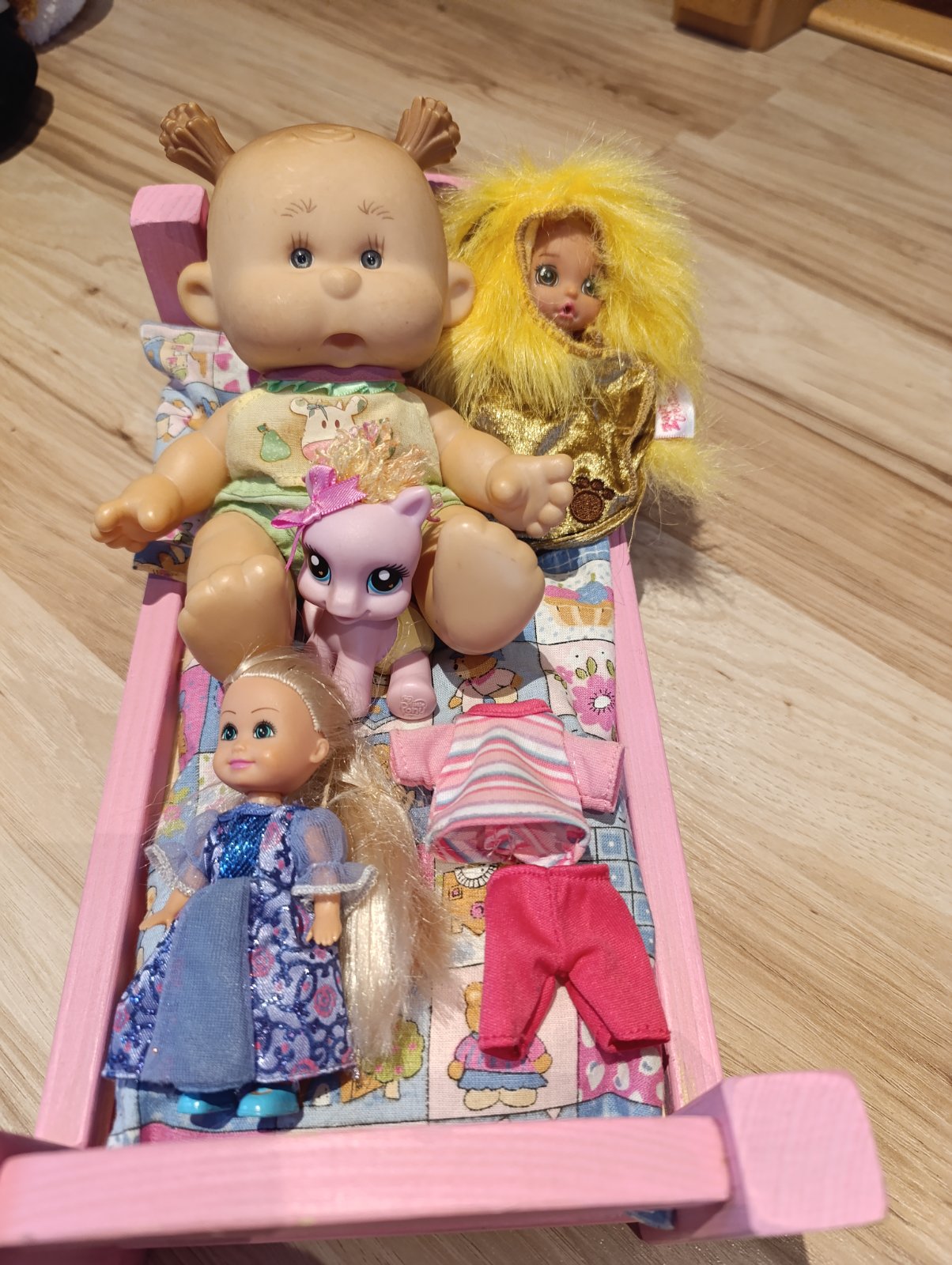 Drevená postieľka a bábiky -voňavá yogurteen, mini baby born, poník, Shelby, bábätko v stoličke. Všetko na foto.