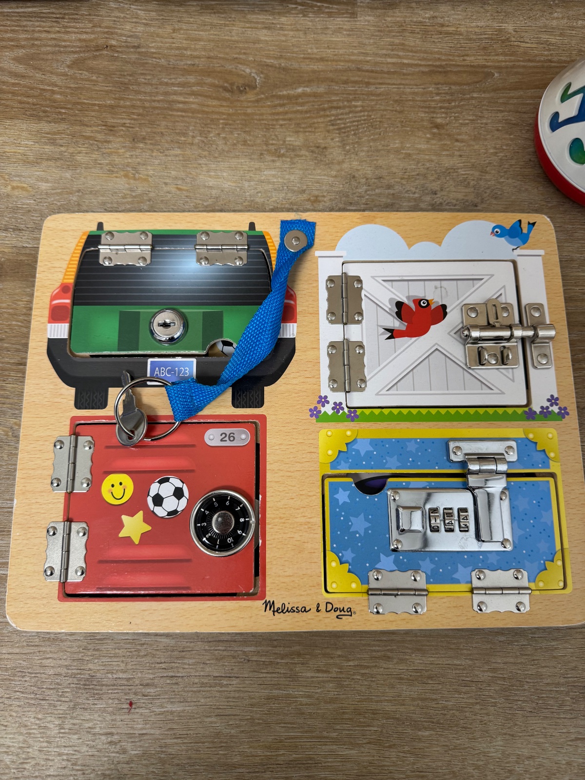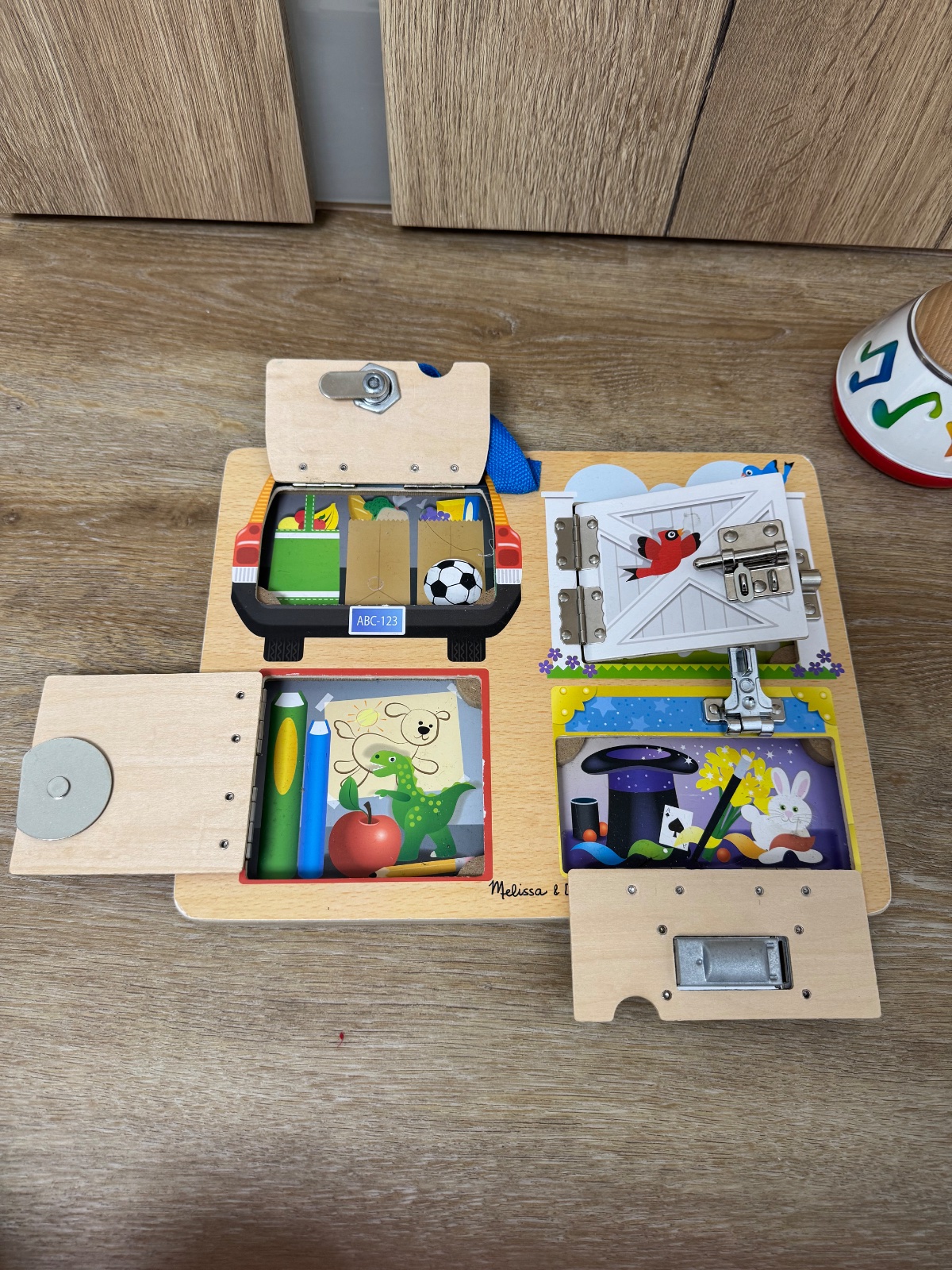 Ponúkam dve drevené hračky / prvá active board doska - rôzne zámky značky Melissa & Dough, kde treba otvoriť dvierka na základe správne otvoreného zámku, super na motoriku a druhé je hrací kužeľ značky Hape, ktorý má príjemnú melódiu, po natočení hrá a otáča sa. Poštovné podľa taríf.