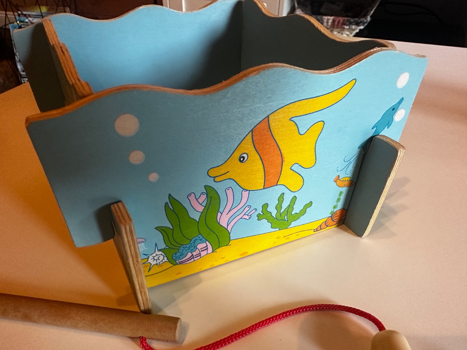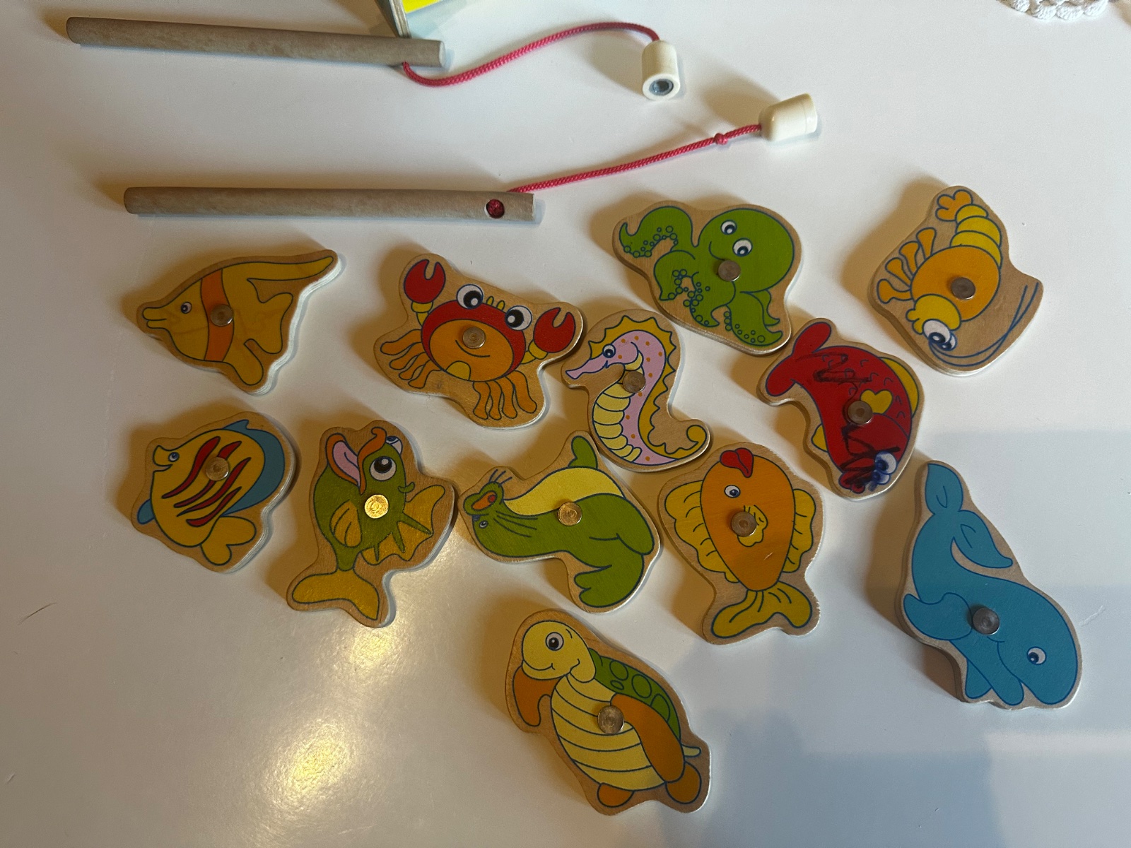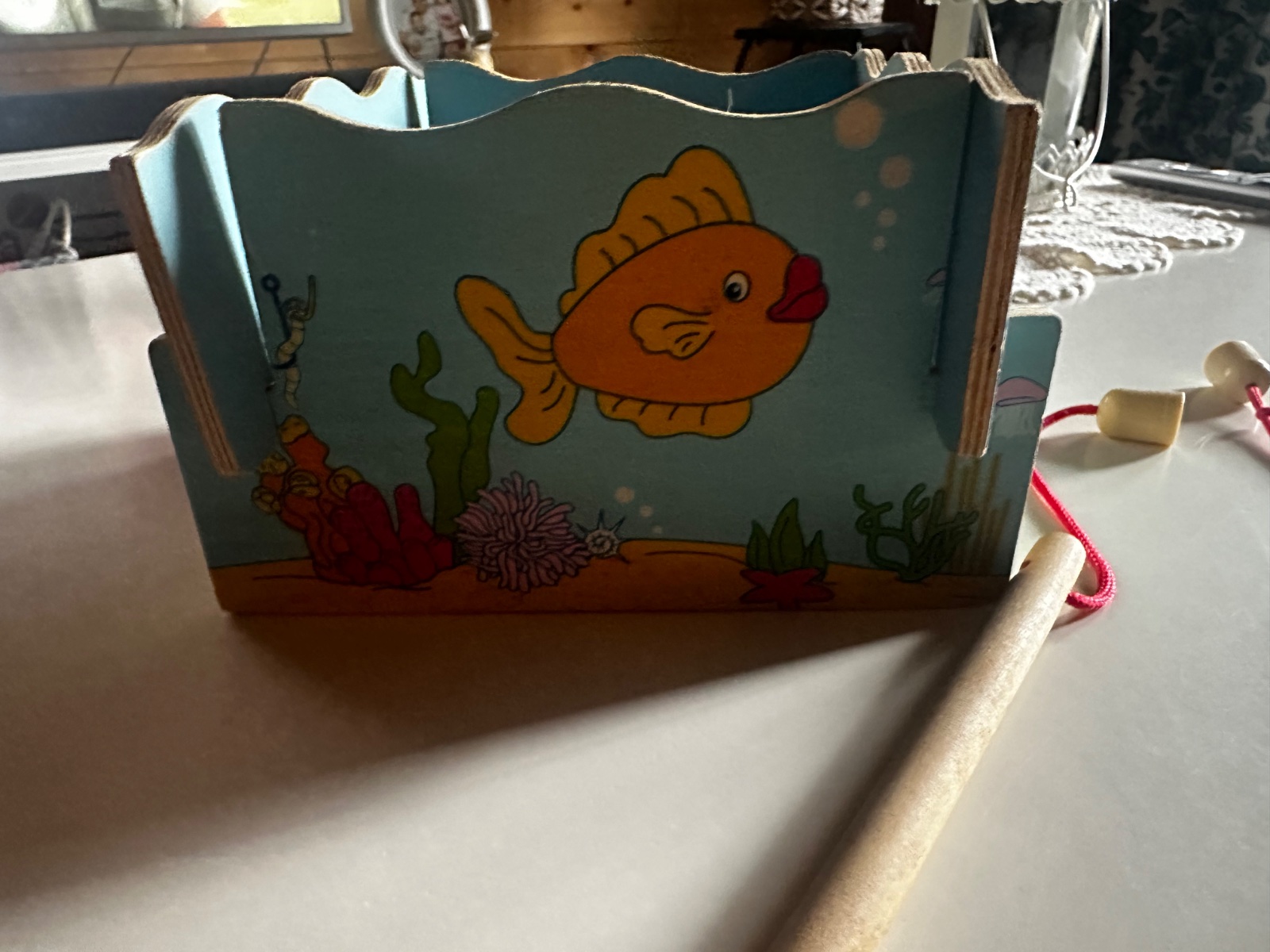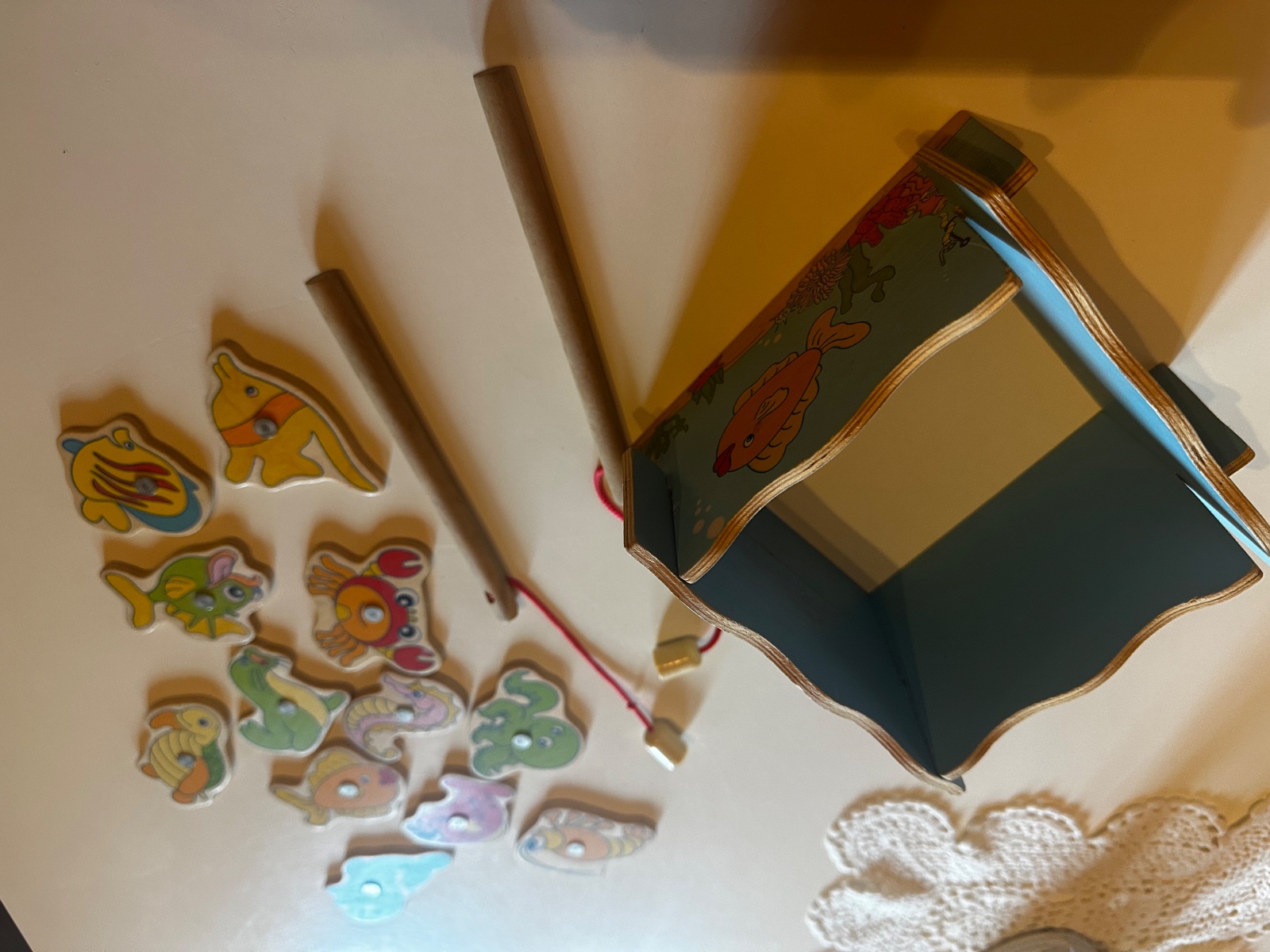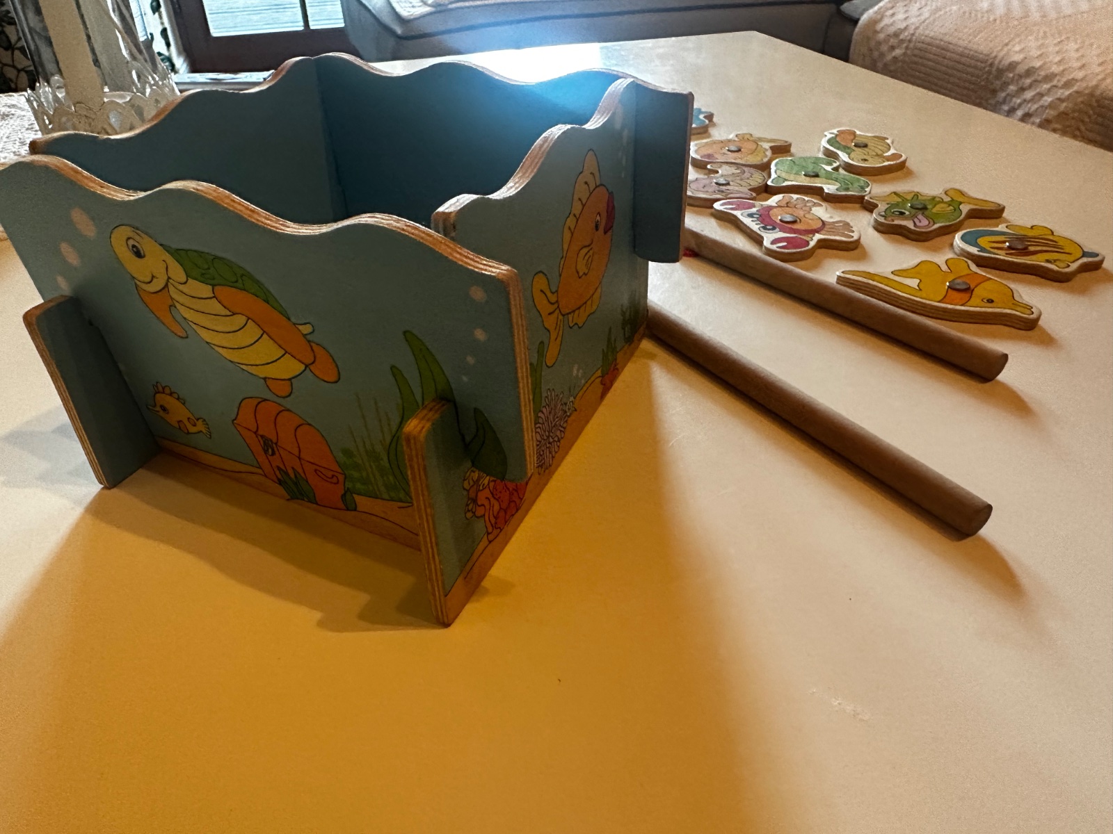 Drevený rybnik v zachovalom stave,12kusov rybičiek s magnetom,2 udice