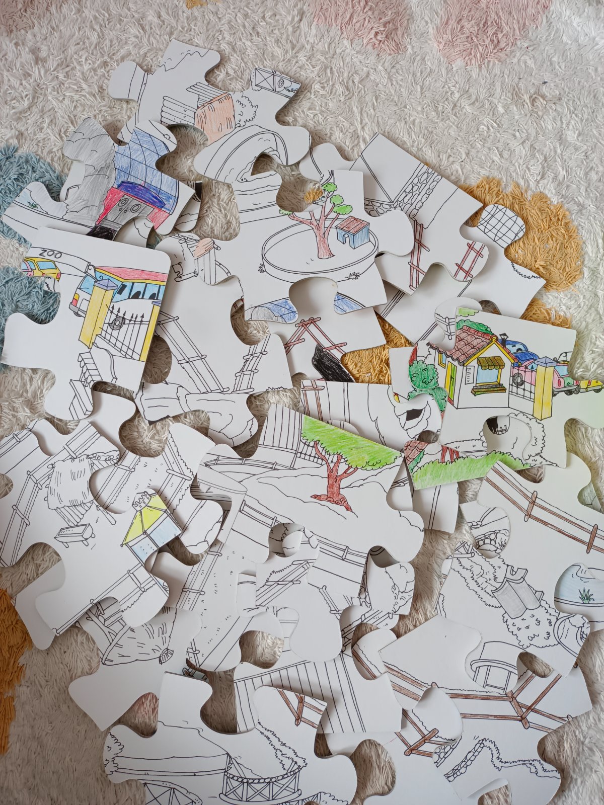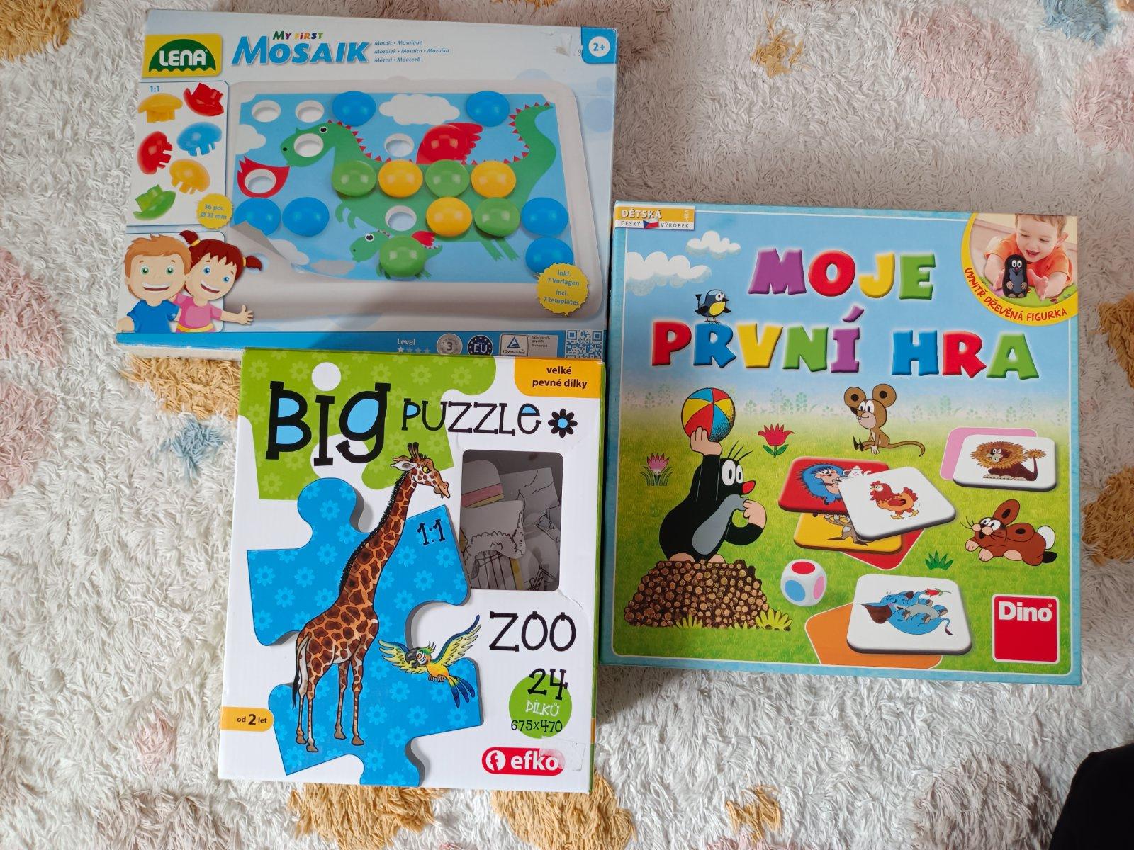 Pred rôzne hry vhodné od 3 rokov. Veľké puzzle Zoo všetky dieliky/ pár dielikov vymaľovaných (pekne ), vhodné na domaľovanie. Mozaic hra má na dvoch predlohách natrhnuté rohy inak funkčné so všetkými dielikmi. Cena spolu 15 eur