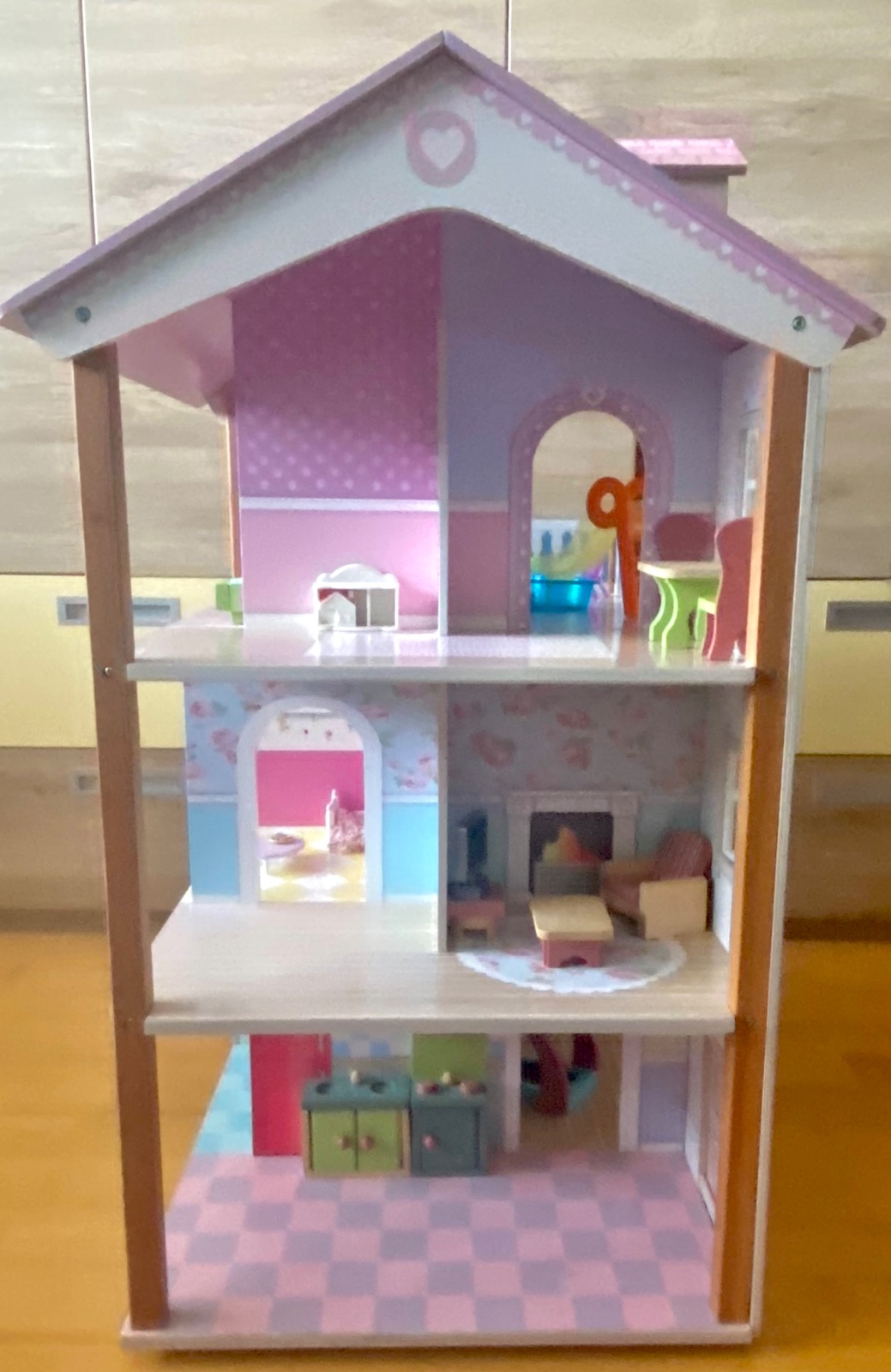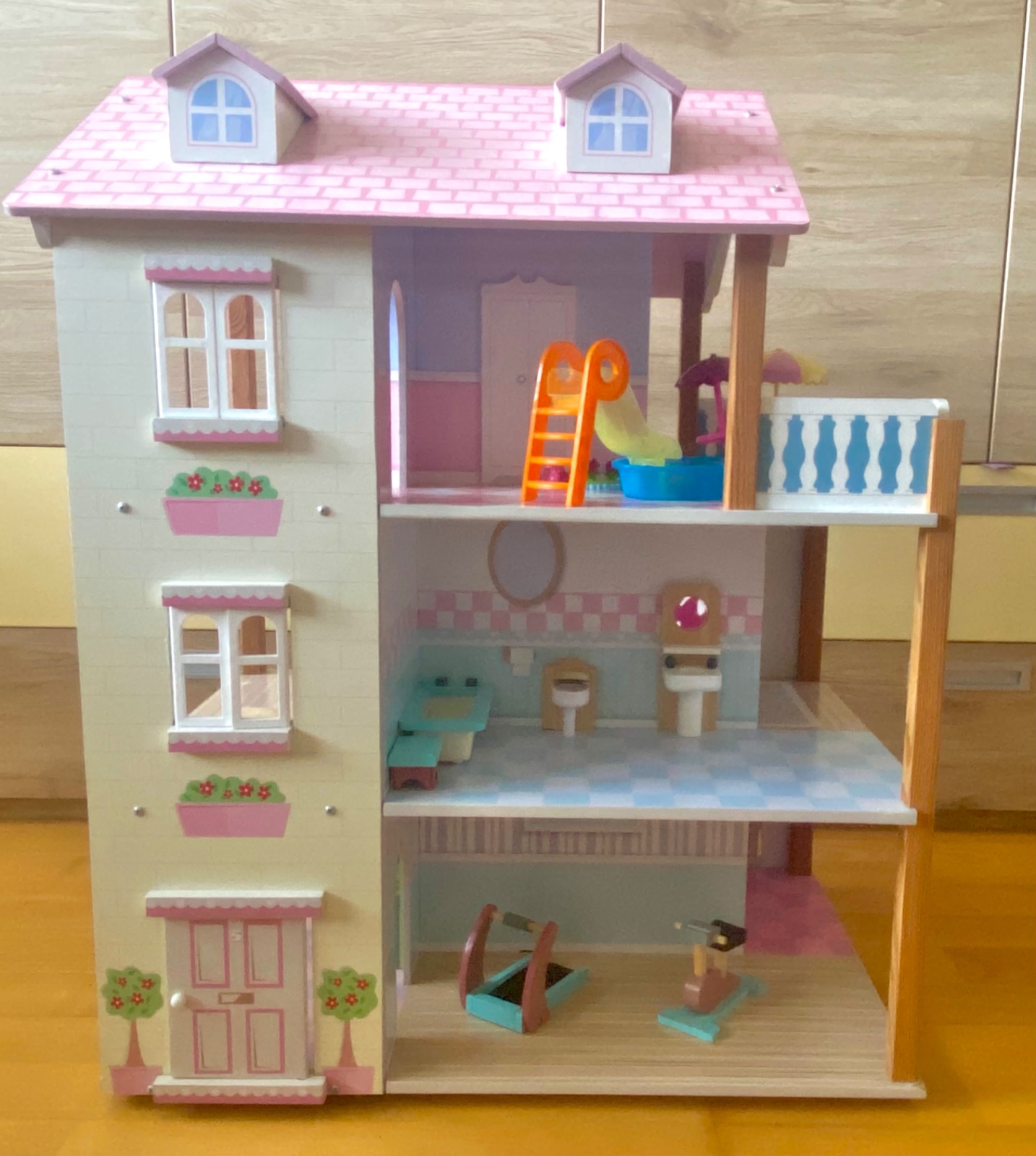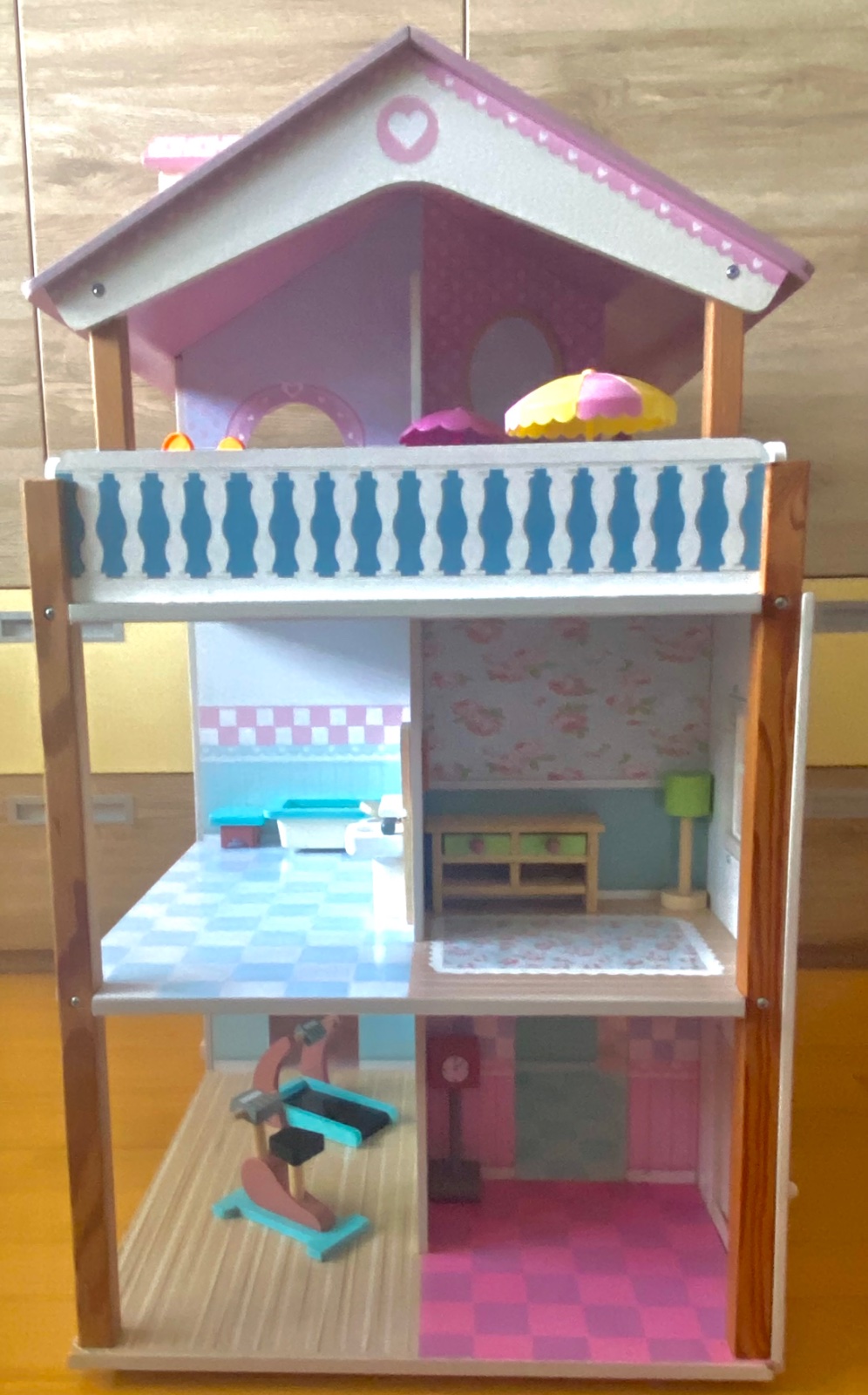 Domček pre bábiky vo výbornom stave, vrátane nábytku - viď foto. Okná, dvere sa dajú otvárať. Domček má otáčavú základňu.