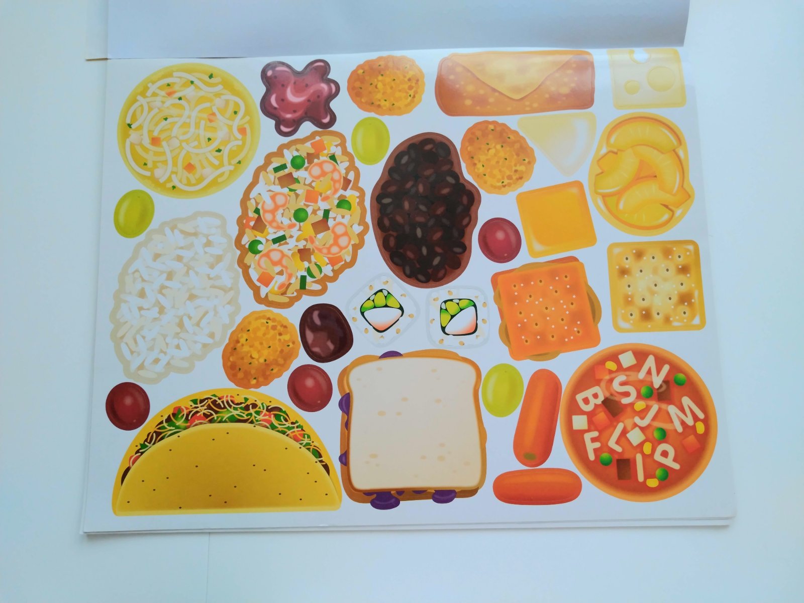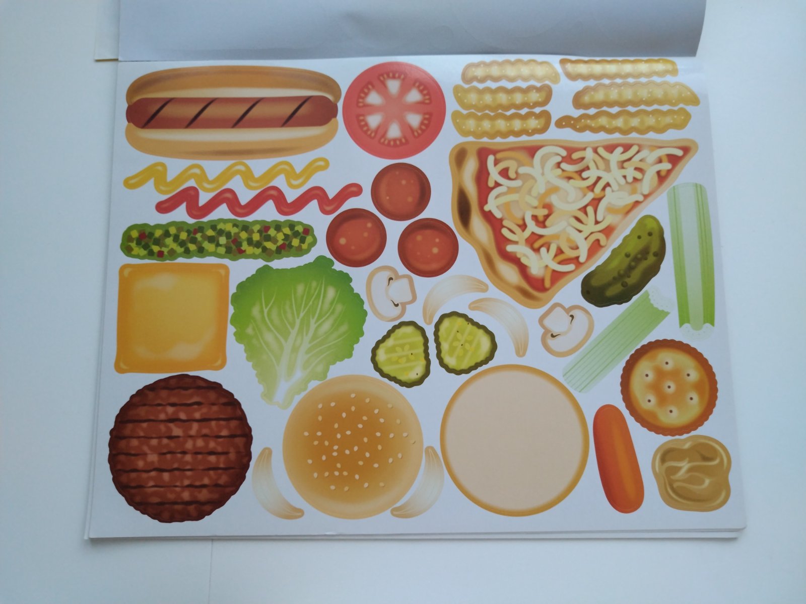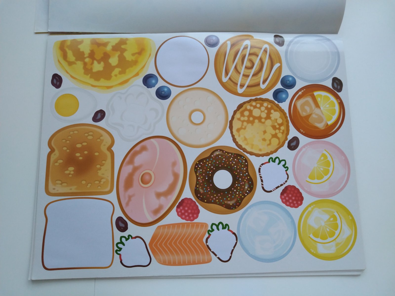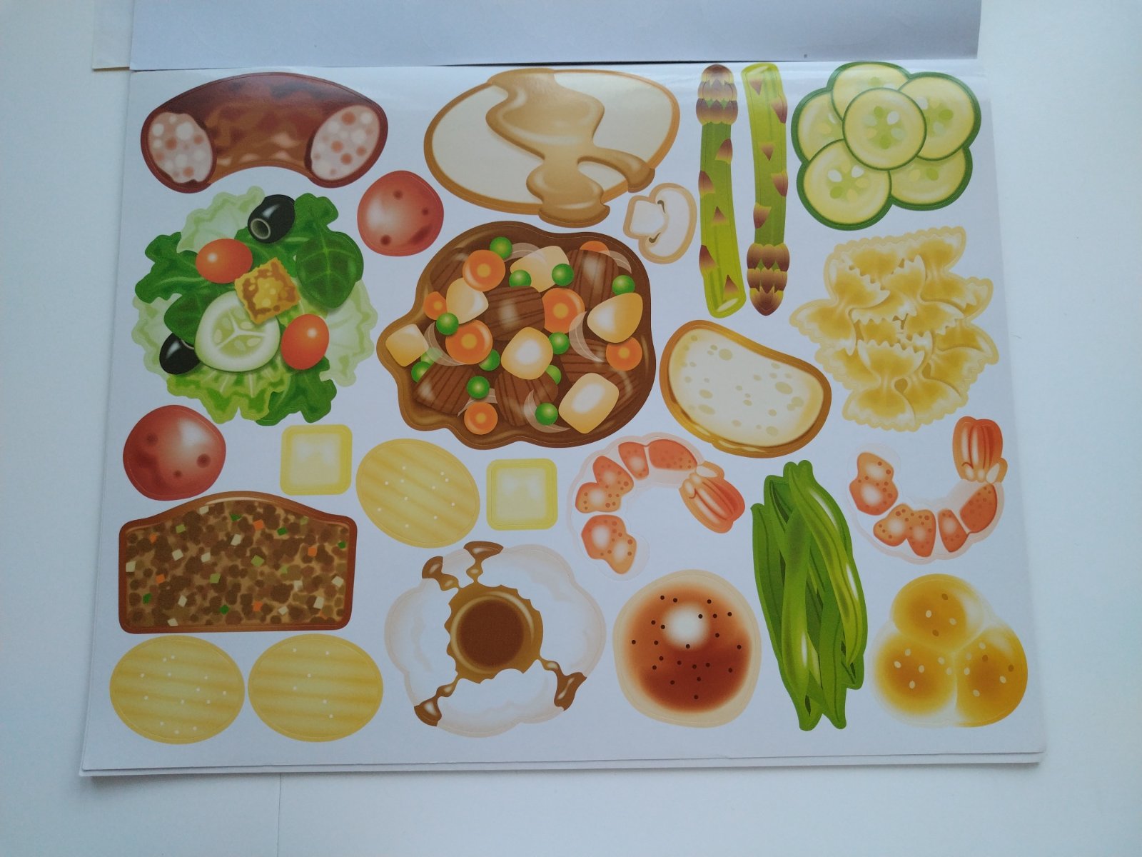 Balenie obsahuje 12 farebných hracích plôch s rôznymi prestieraniami a viac ako 172 samolepiek s motívom jedál (raňajky, obedy, dezerty atď.).