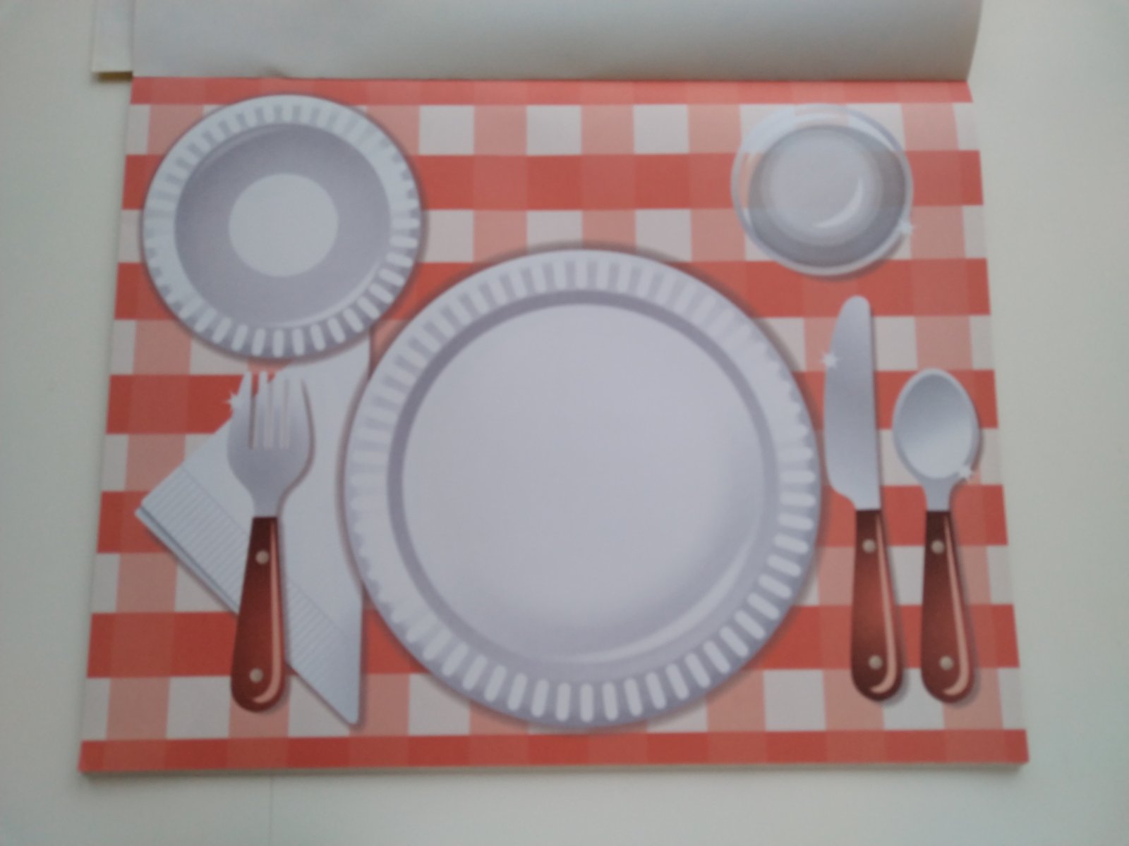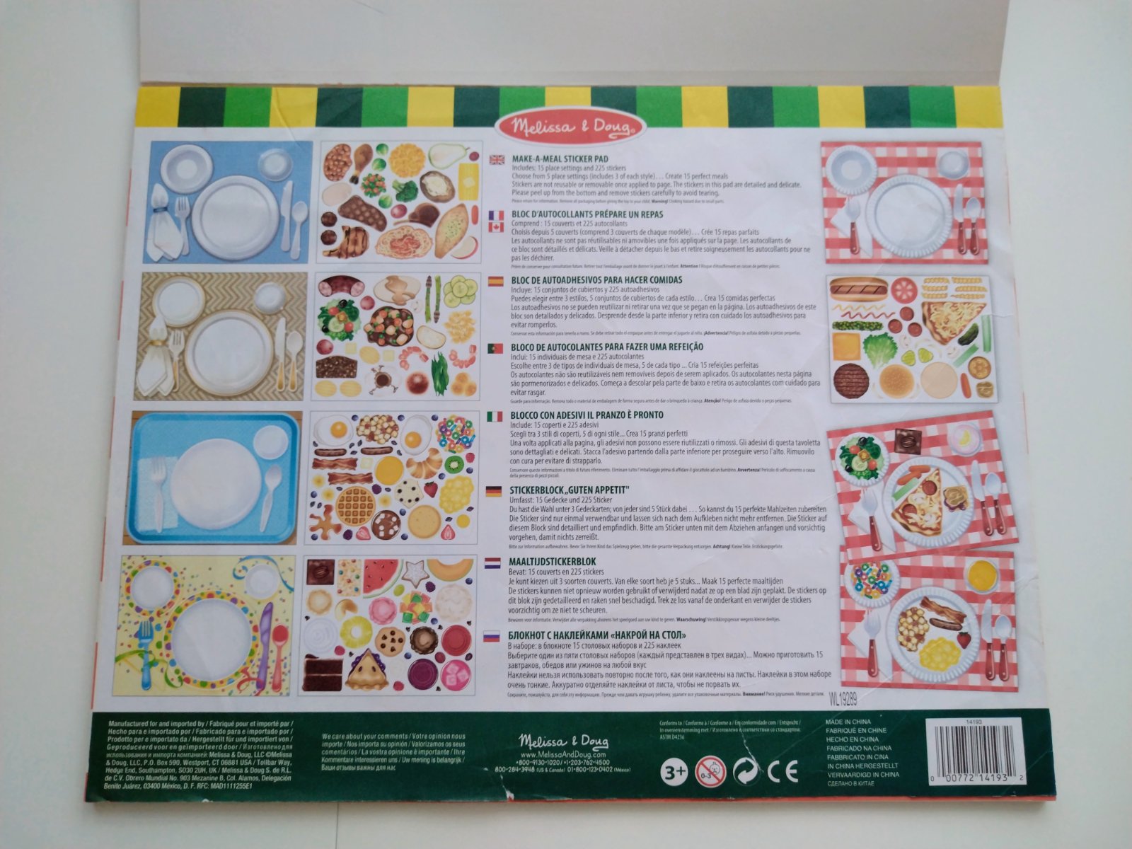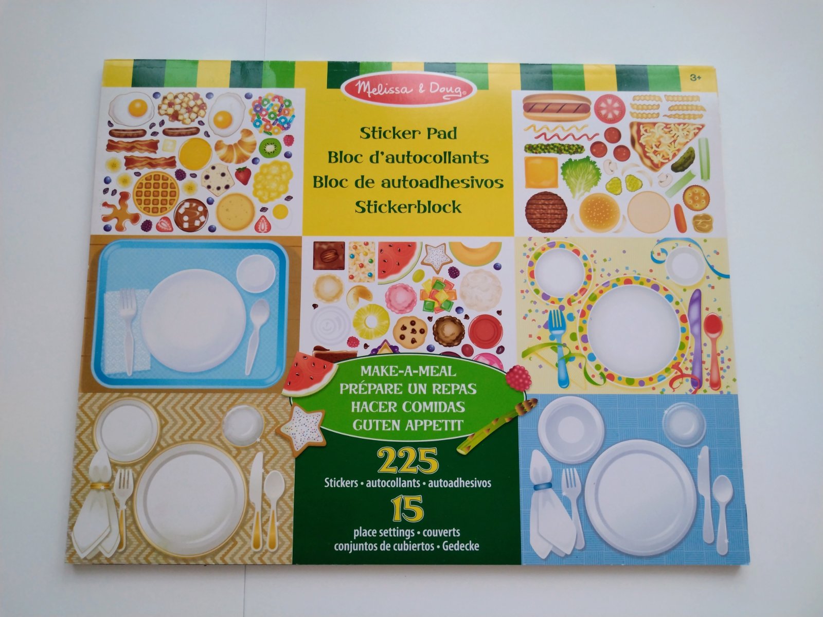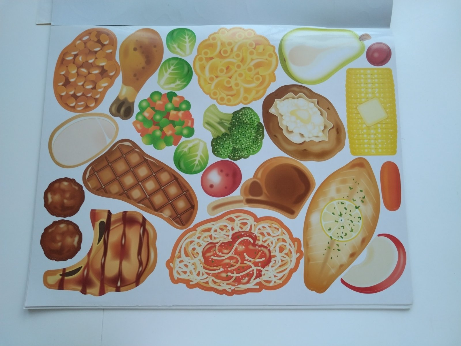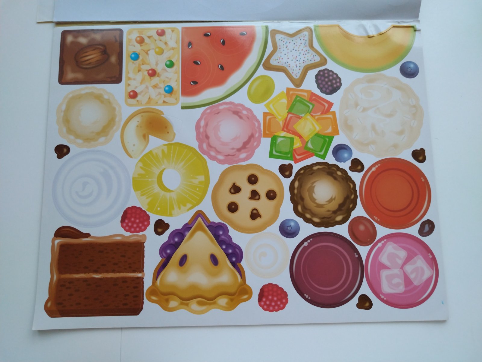 Balenie obsahuje 12 farebných hracích plôch s rôznymi prestieraniami a viac ako 172 samolepiek s motívom jedál (raňajky, obedy, dezerty atď.).