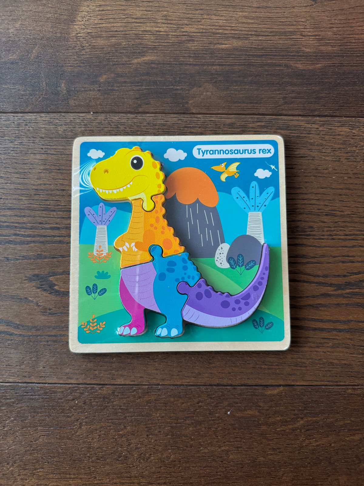 Drevene puzzle pre najmensich s motivom tyranosaurus Rex. Rozmer uvedeny na foto.