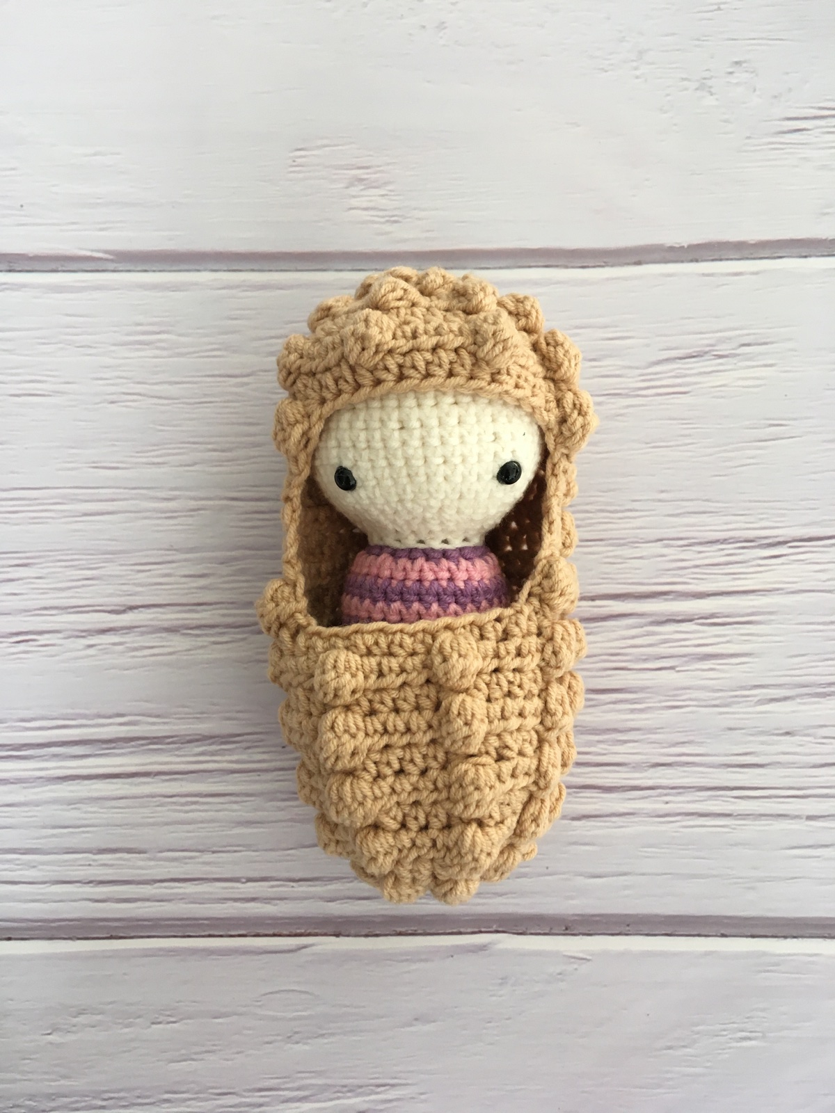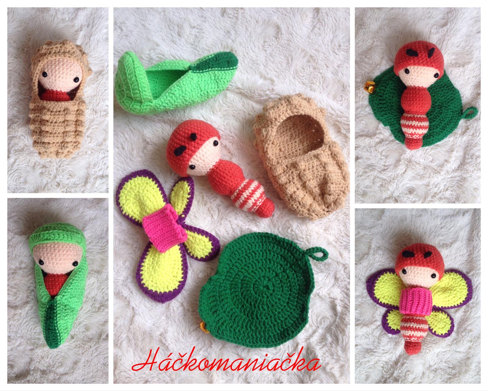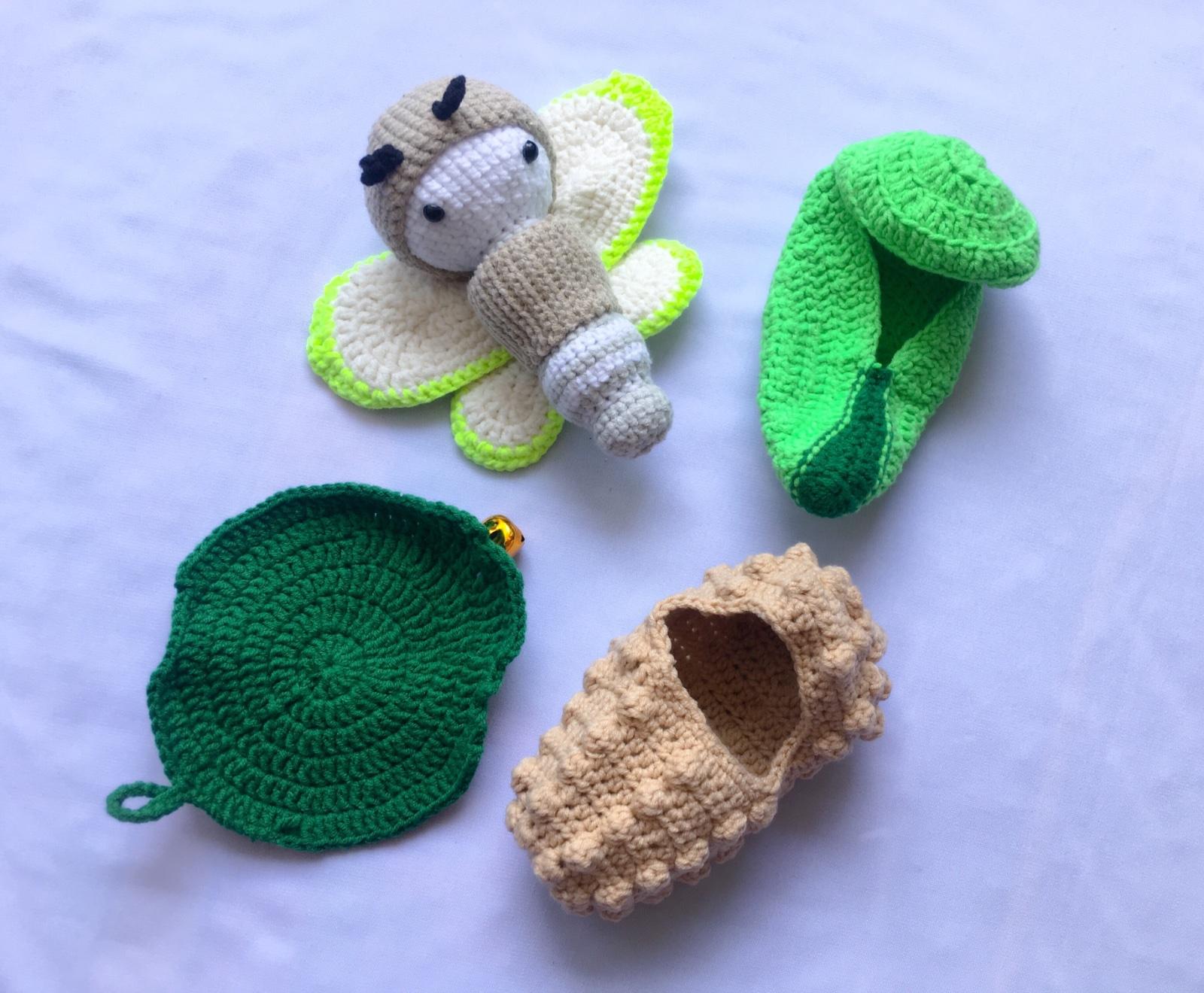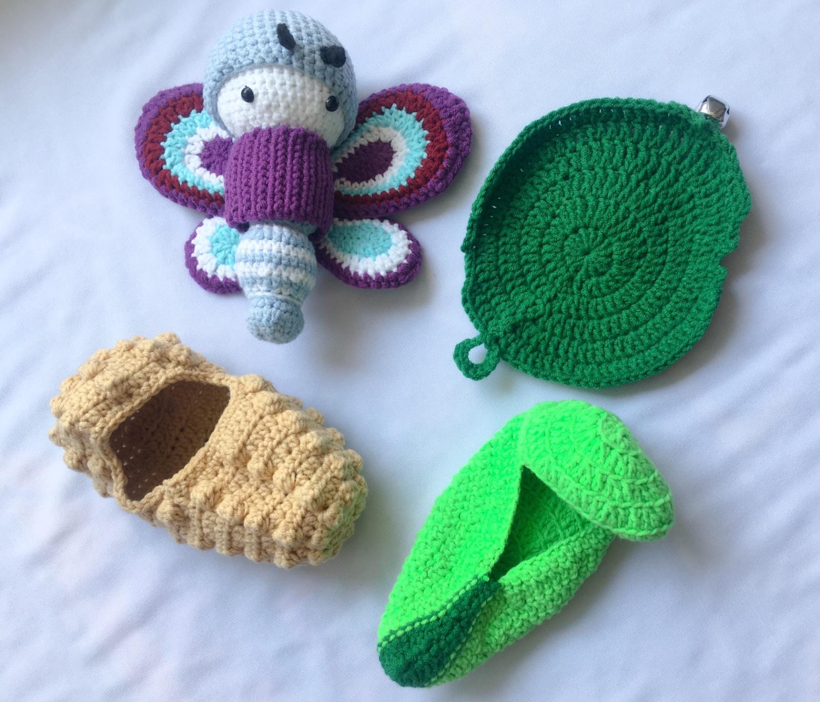 Háčkovaný vývoj motýla obsahuje húsenku, čepičku, vajíčko, krídla, kokon na zakuklenie a list, do ktorého sa môže húsenička zabaliť.