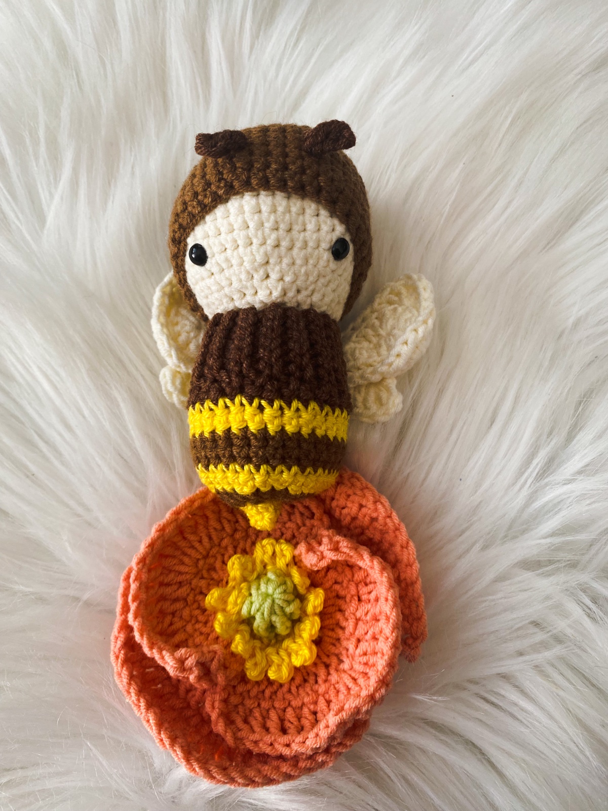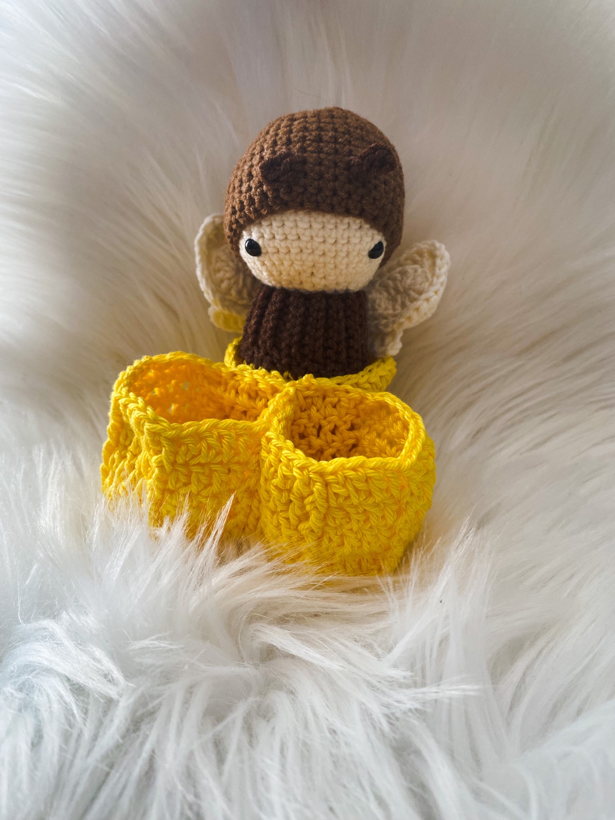 Húsenička je dlhá 11cm. Plnená dutým antialergickým vláknom, bezpečnoatné očká, na liste je rolnička. Uháčkové z príjemnej zmesovej vlny.