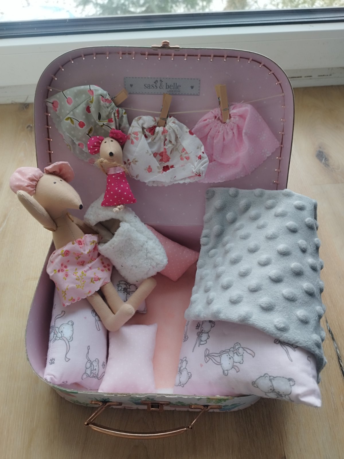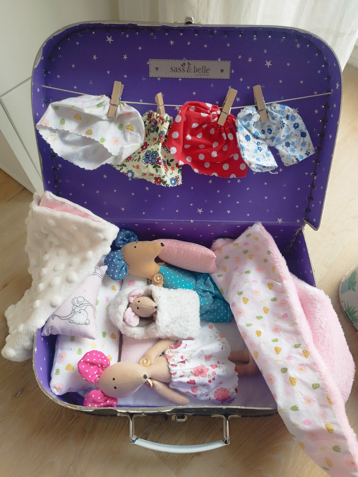 Menší bledý kufrík obsahuje myšaciu rodinku mama a bábätko v spacáčiku, sukničky na prezliekanie a kopu vankúšov a prikrývok....20 eur.