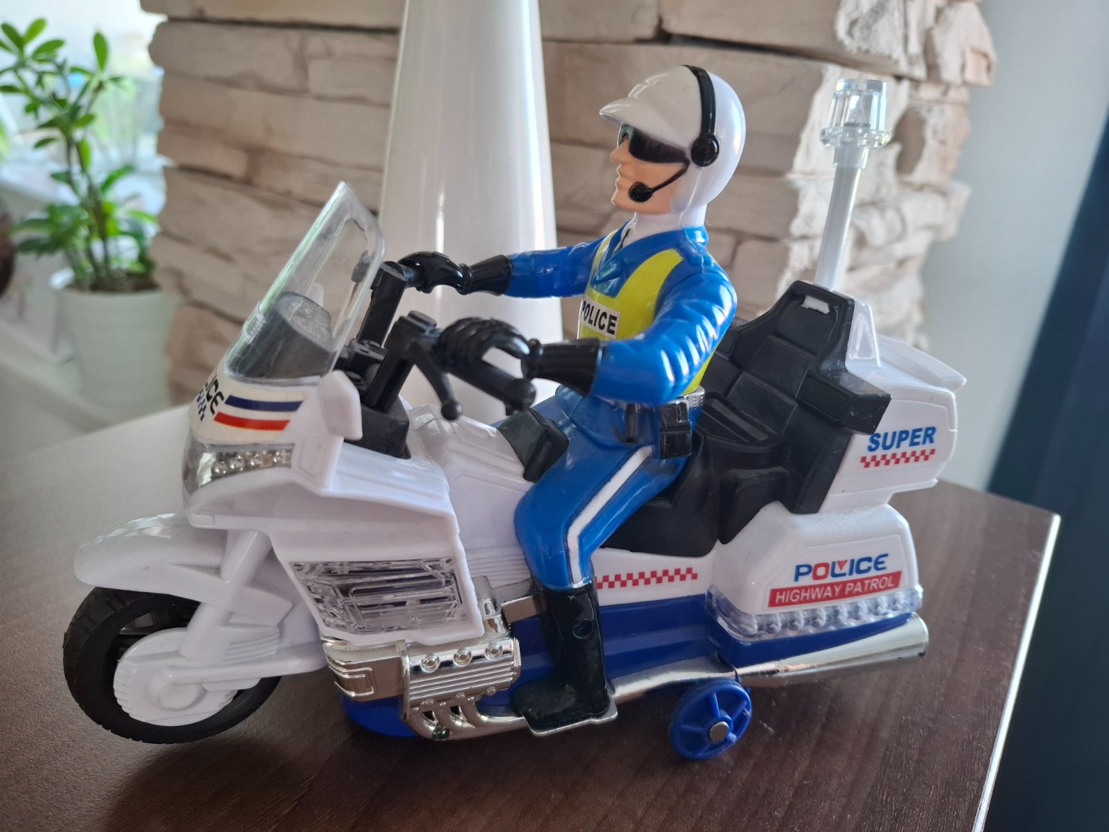 Policajná motorka na baterky, po zapnutí sa pohybuje, točí, vydáva zvuky a svieti, bliká . Je ako nová.