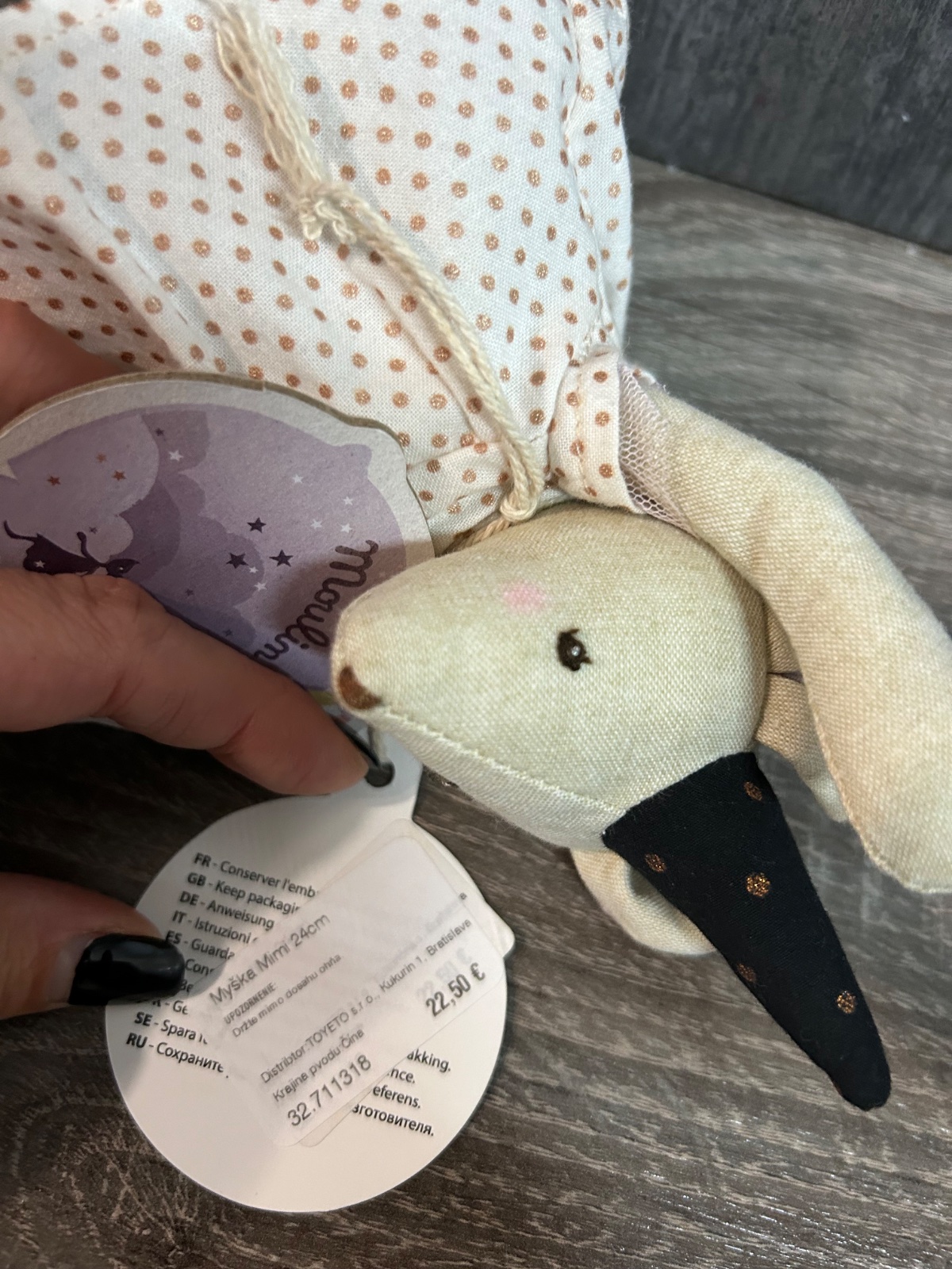 28P8K.Mimi je látková myška, ktorá môže byť milou hračkou aj tým najmenším dievčatkám. Jej svetlé šatičky sú zdobené jemným vzorom, rovnako ako jej ušká.