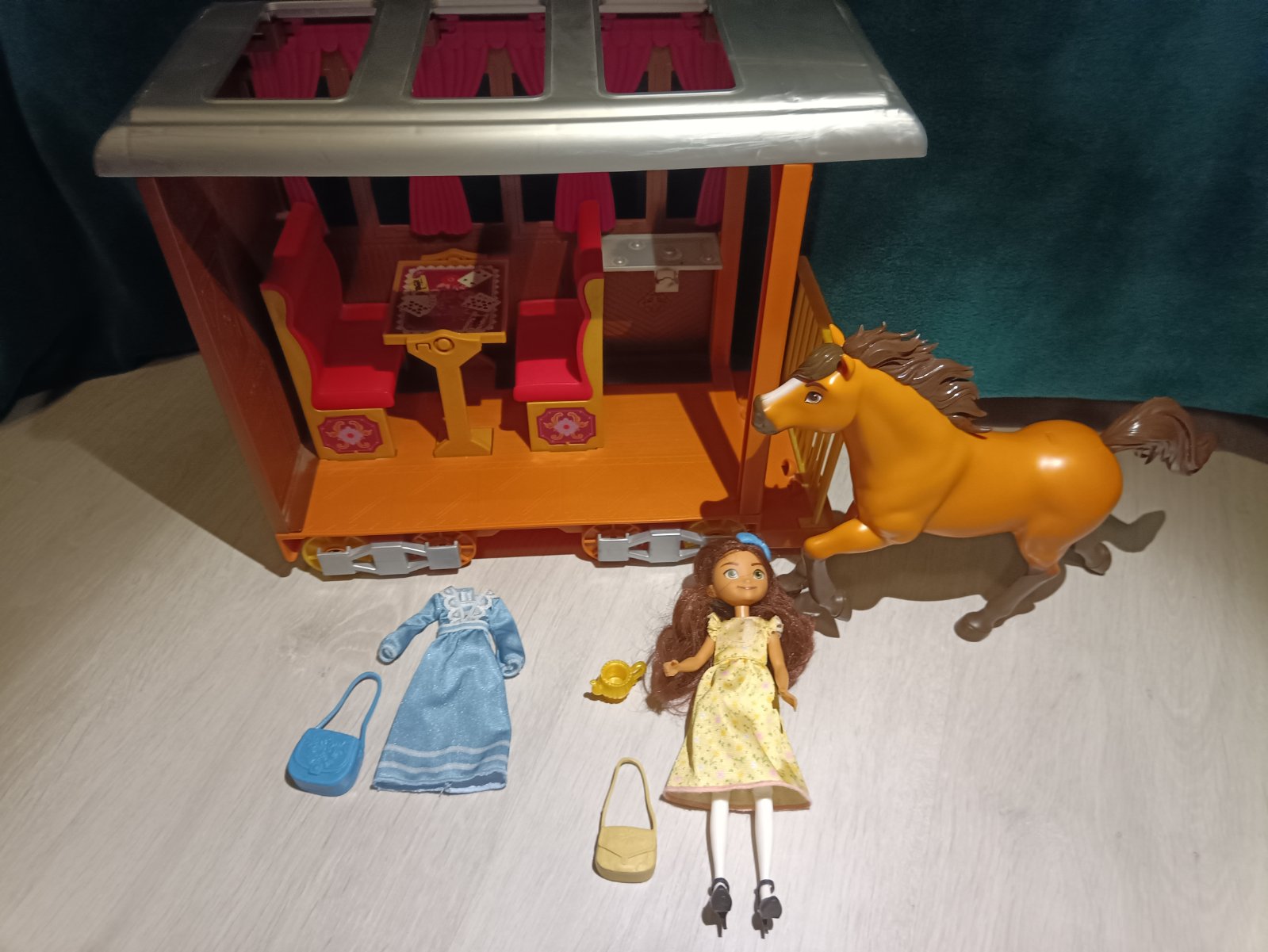 Hracia súprava Dobrodružstvo vo vlaku s Luckym a Spiritom obsahuje bábiku Luckyho (cca 18 cm) v krásnych dlhých šatách so zodpovedajúcou taškou, kôň Spirit (cca 20 cm). Očarujúci vláčik má štyri pojazdné kolesá, nástupište so zábradlím, štyri sedadlá a stôl, ktorého otočná doska má po jednej ploche na pitie čaju a hranie. Luckyho tašku možno zavesiť na háčik. Dve bábiky môžu počas jazdy bezpečne stáť v držiakoch na topánky (štyri) vonku na plošine! Náhradné oblečenie s kabelkou.