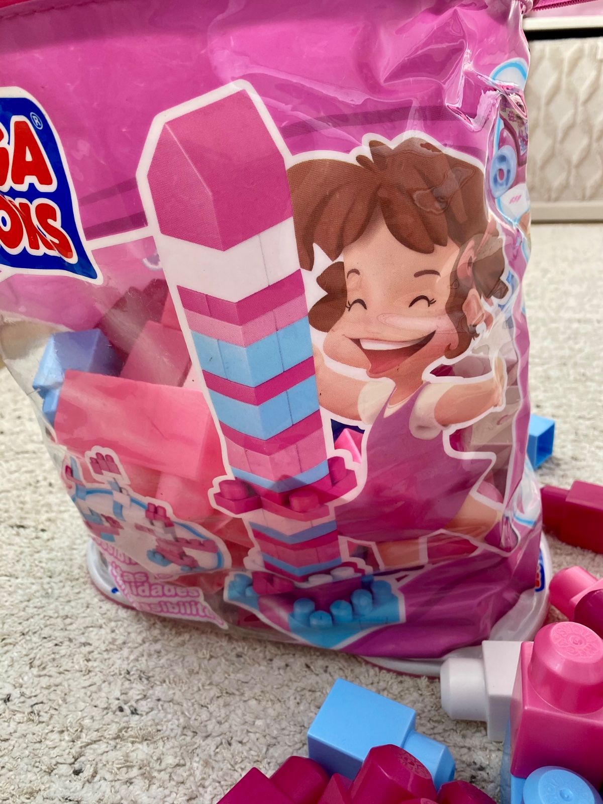 Jednoduchá stavebnica v praktickom vrecku. Velke kocky. Od 1 roka. Velmi dobry hrany stav.
