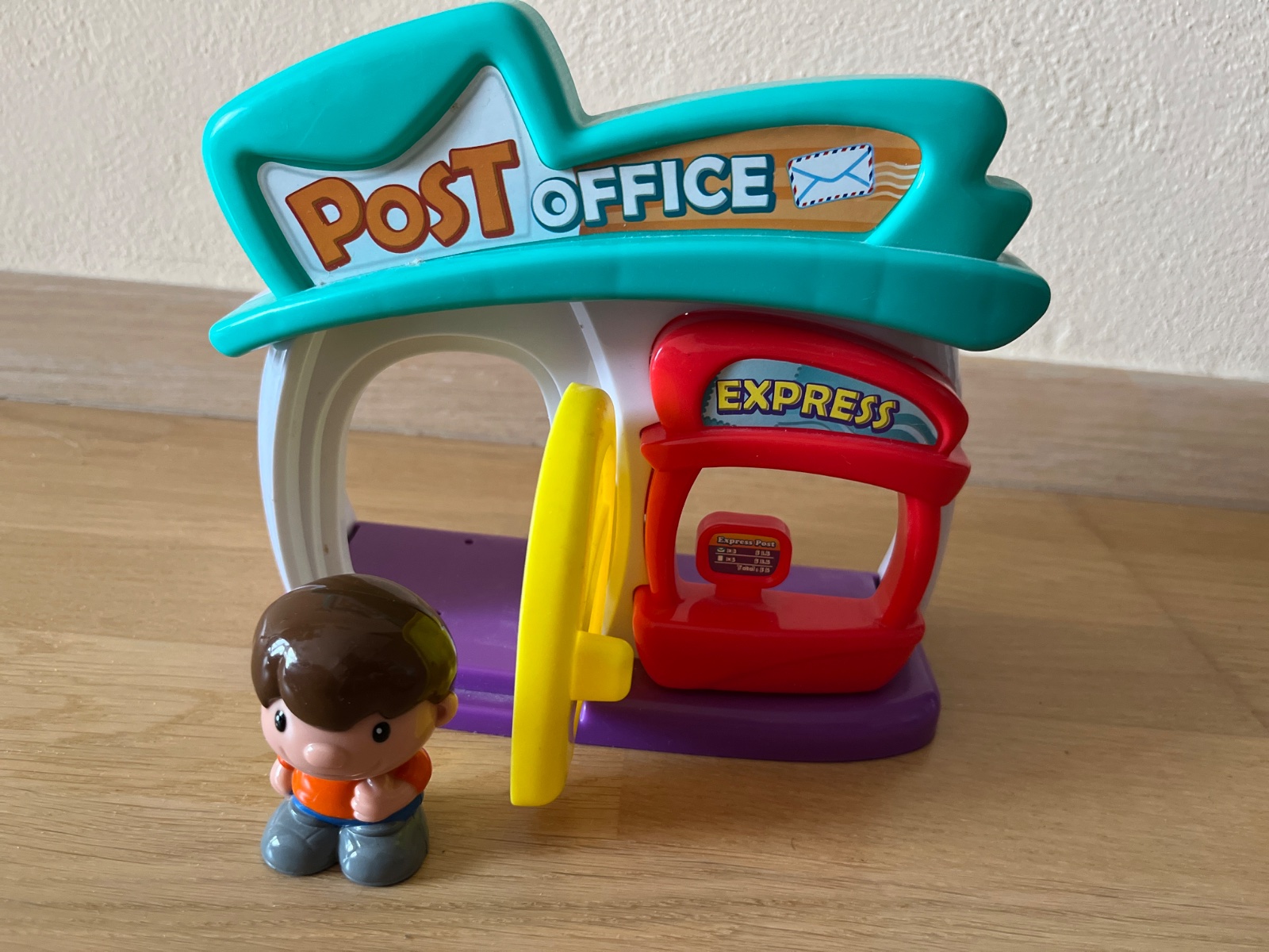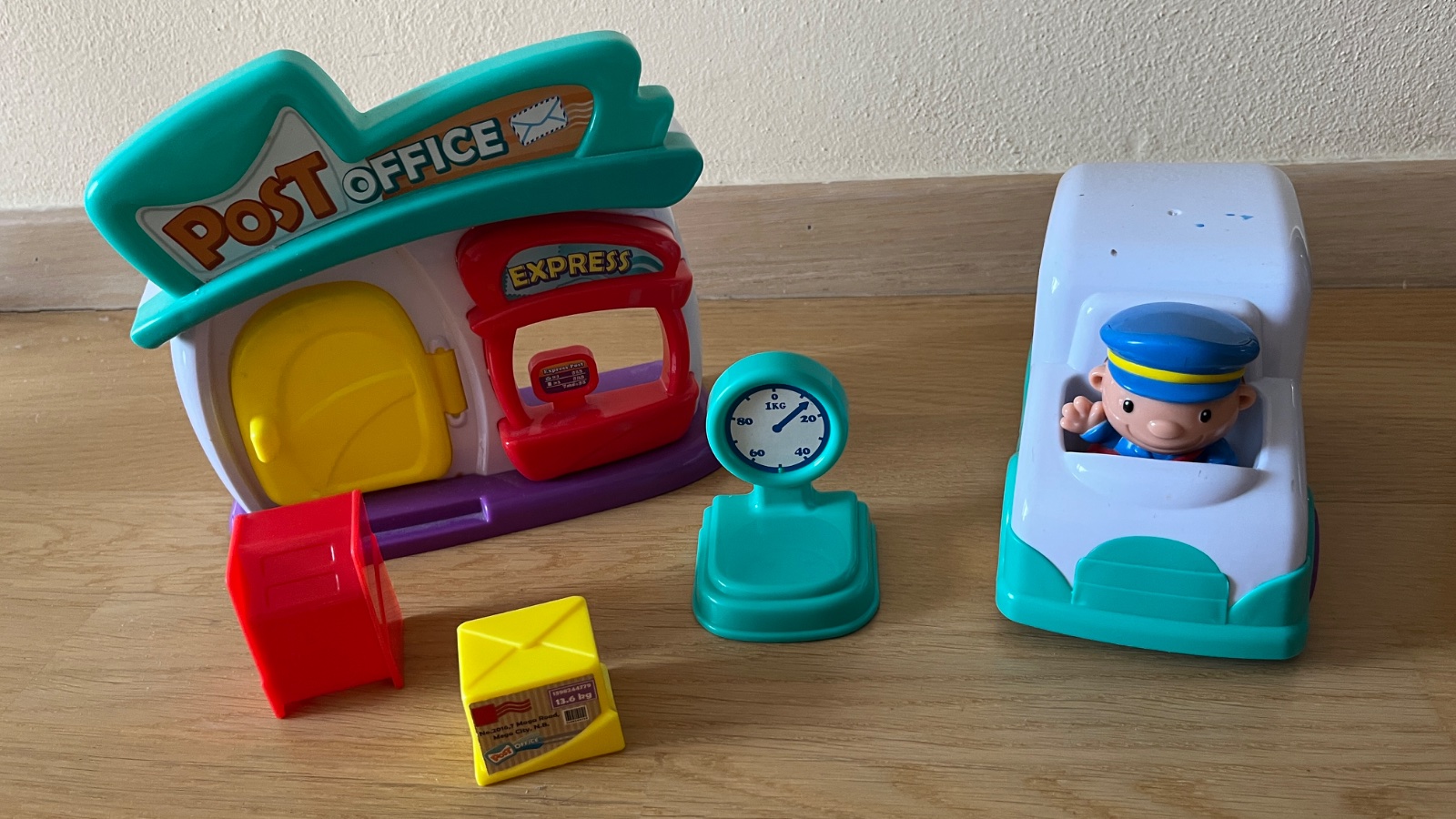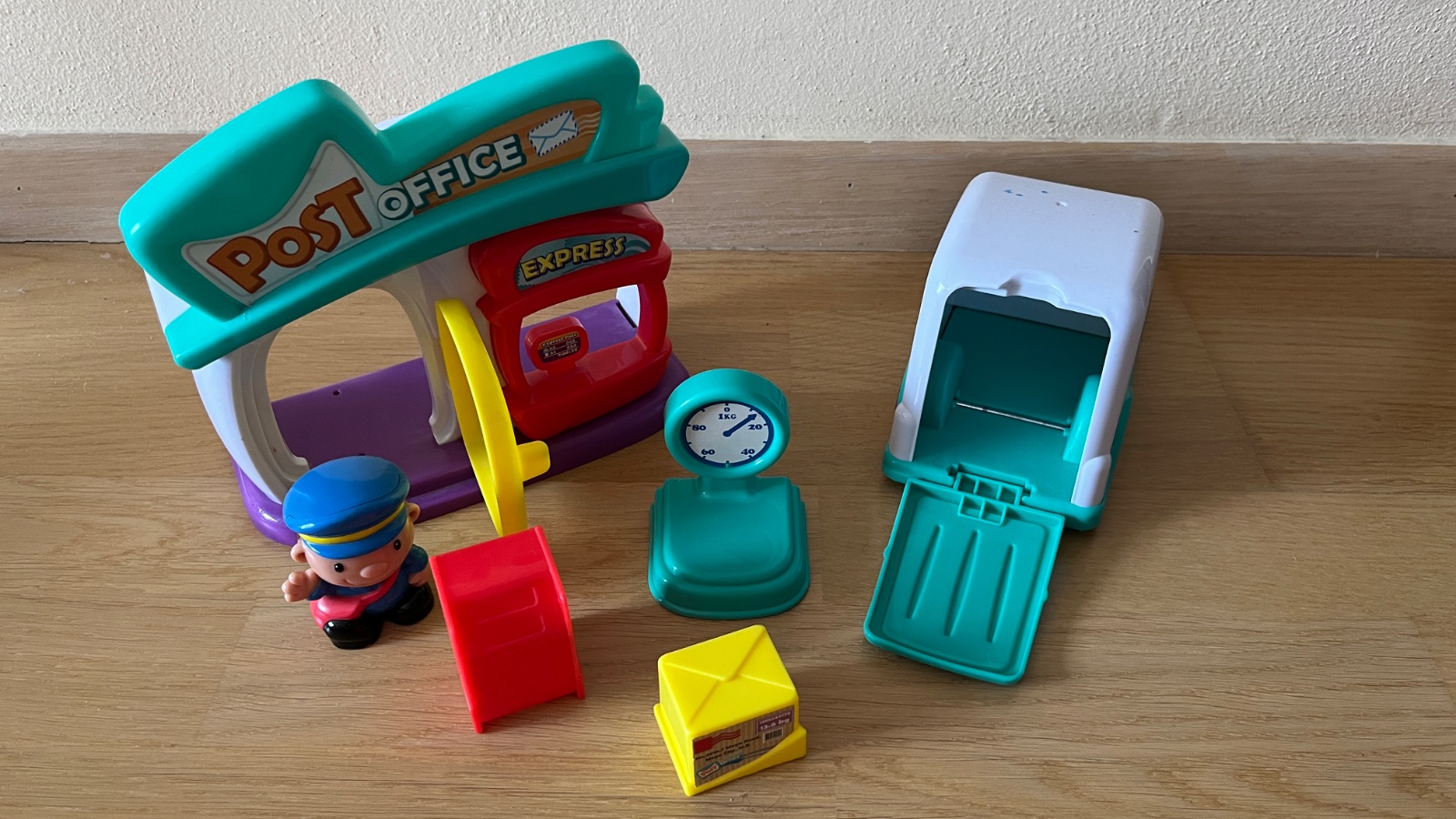 Plastové poštárske auto s dvomi panáčikmi,poštou vrátane príslušenstva (balík,váha a pod.).