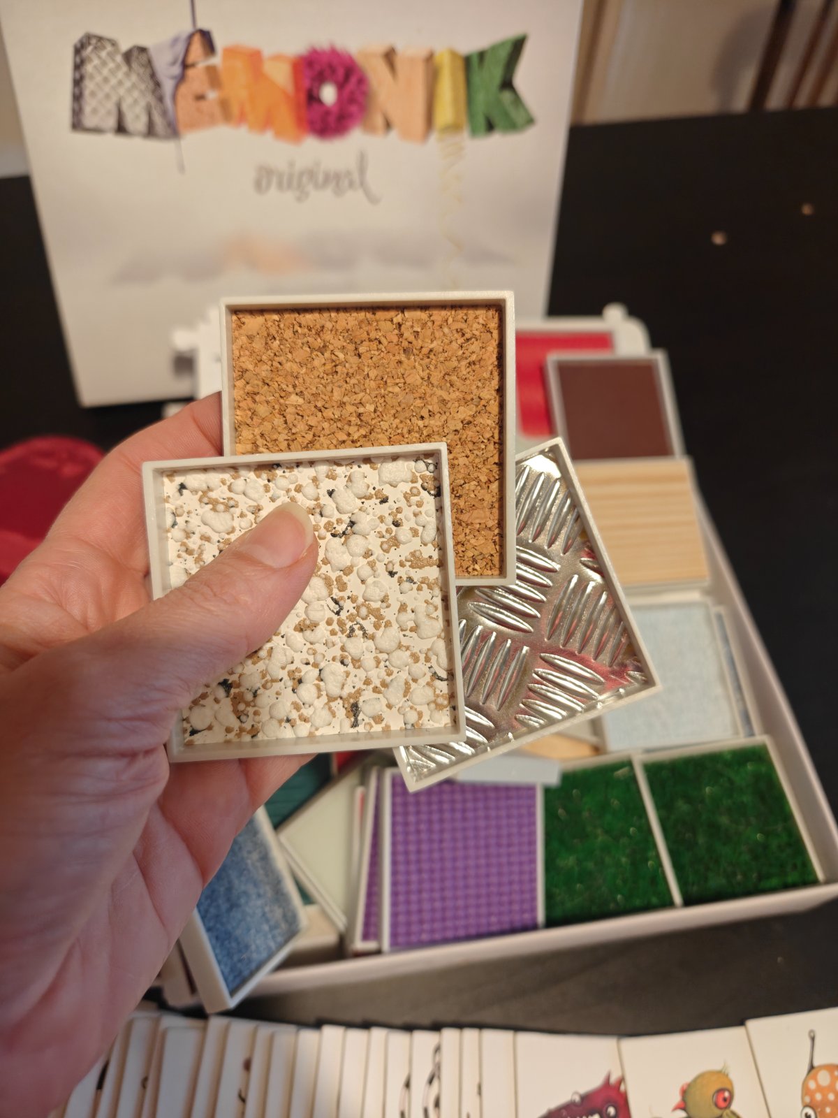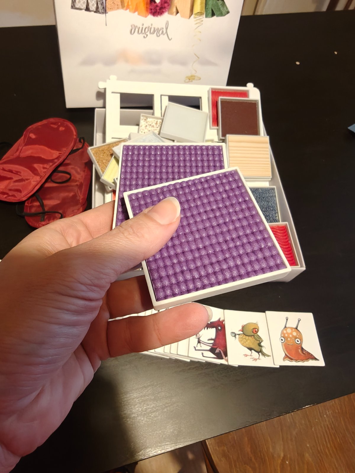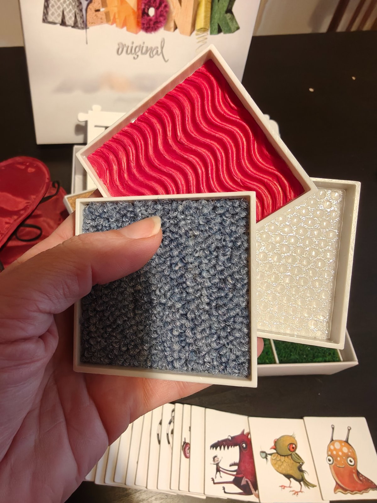 Spoločenská hra, hmatové pexeso, je určená pre senzorické hľadanie dvojíc materiálov nalepených na doštičkách. Je to výborná aktivita pre deti. Ukazuje im možnosti sveta nevidiacich a zároveň rozvíja ich zmysly. Hru som si kúpila v rámci croundfundingovej kampane na Startlabe a odvtedy sme ju hrali veľakrat. Momentálne je vo všetkých predajniach nedostupná. Doštička s koženkou sa v rohoch už trošku odliepa, dá sa to ľahko prilepiť. Ostatné su v perfektnom stave. K hre boli 4 "klapky na oči", ostali nám už len dve. V DMke sa dajú dokúpiť za pár euro, keby ste chceli hrať štyria.K hre je priložené aj ich autorské pexeso s milými postavičkamiJe klasicky kartónové, má väčšie rozmery ako bežné pexeso.