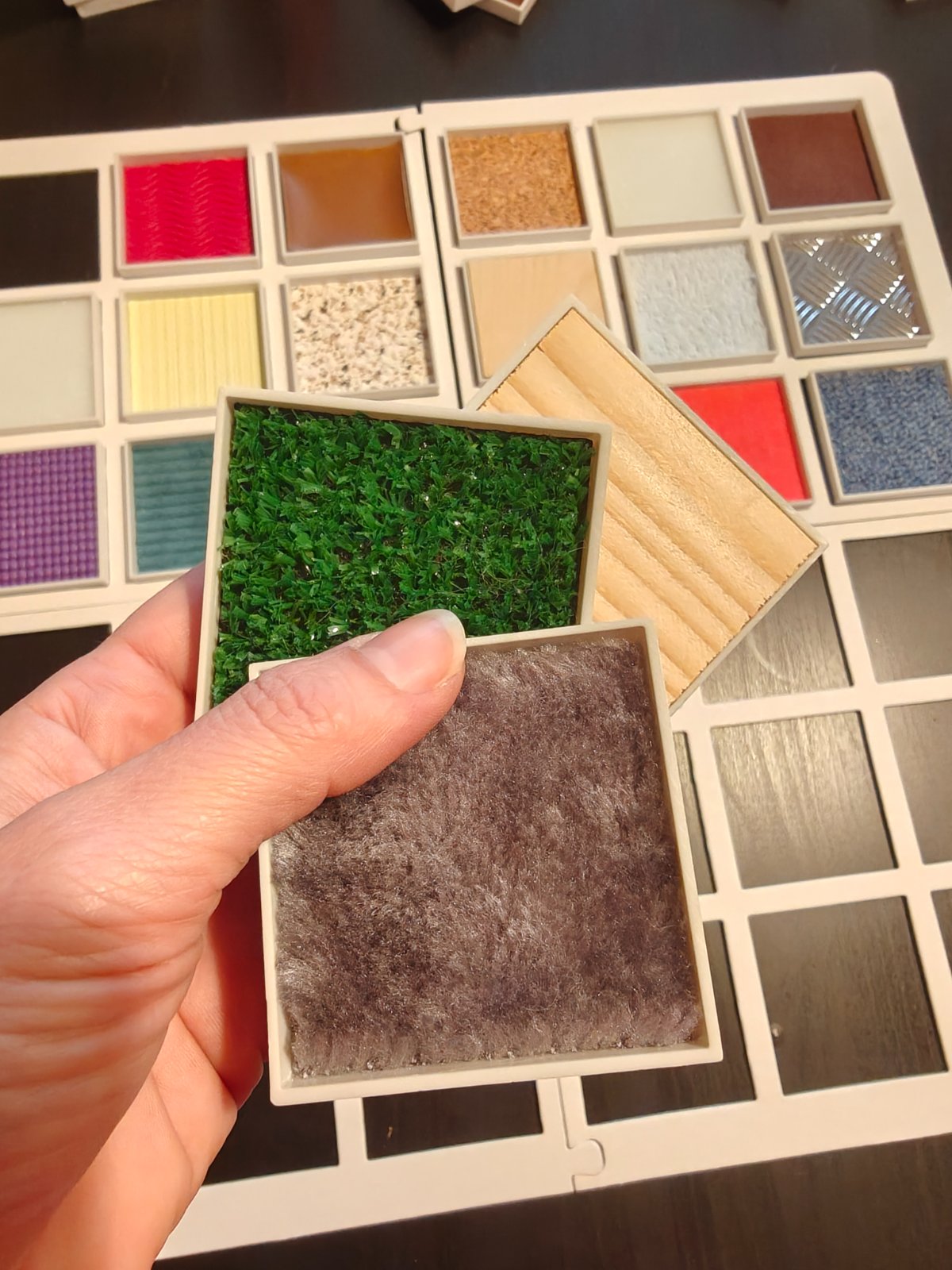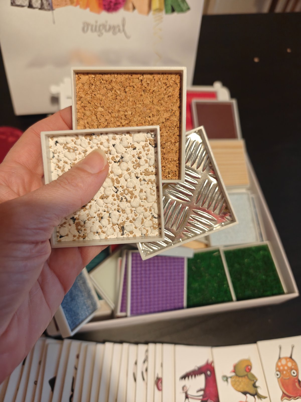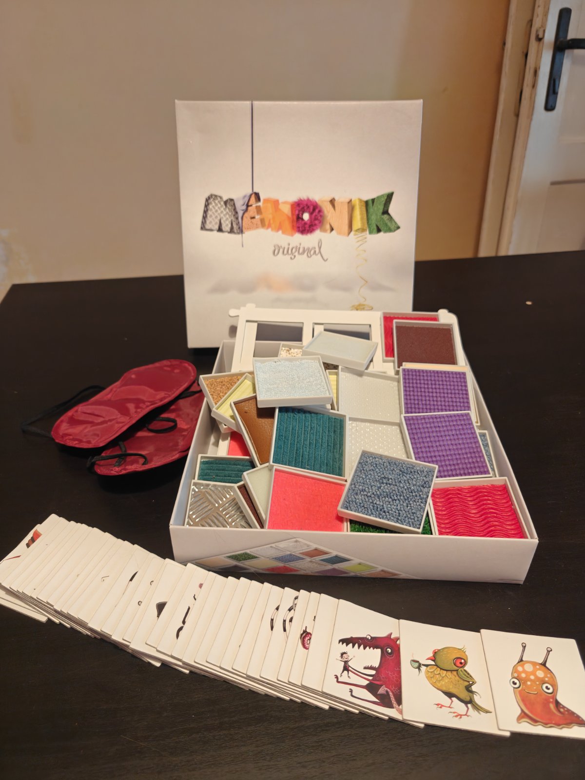 Spoločenská hra, hmatové pexeso, je určená pre senzorické hľadanie dvojíc materiálov nalepených na doštičkách. Je to výborná aktivita pre deti. Ukazuje im možnosti sveta nevidiacich a zároveň rozvíja ich zmysly. Hru som si kúpila v rámci croundfundingovej kampane na Startlabe a odvtedy sme ju hrali veľakrat. Momentálne je vo všetkých predajniach nedostupná. Doštička s koženkou sa v rohoch už trošku odliepa, dá sa to ľahko prilepiť. Ostatné su v perfektnom stave. K hre boli 4 "klapky na oči", ostali nám už len dve. V DMke sa dajú dokúpiť za pár euro, keby ste chceli hrať štyria.K hre je priložené aj ich autorské pexeso s milými postavičkamiJe klasicky kartónové, má väčšie rozmery ako bežné pexeso.
