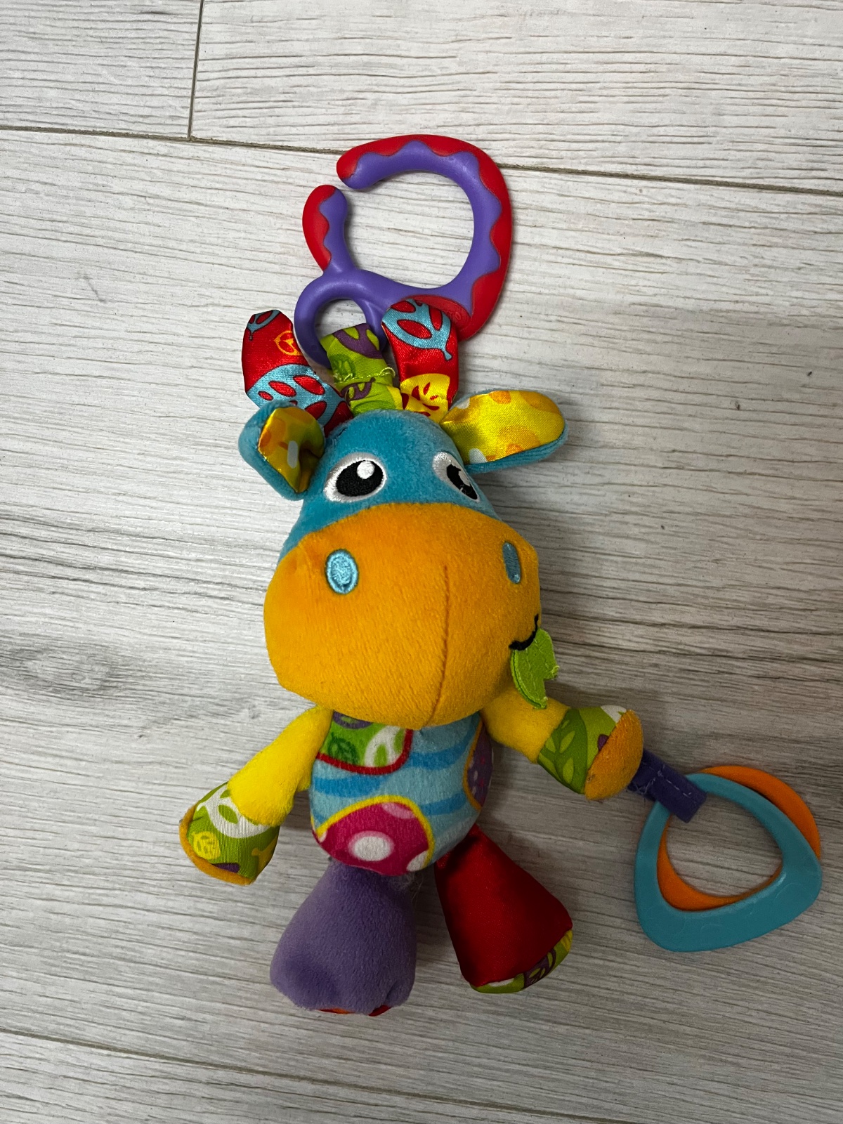 Hračka je opatrená závesným klipom, ktorým je možné hračku zavesiť na postieľku, kočík alebo autosedačku.