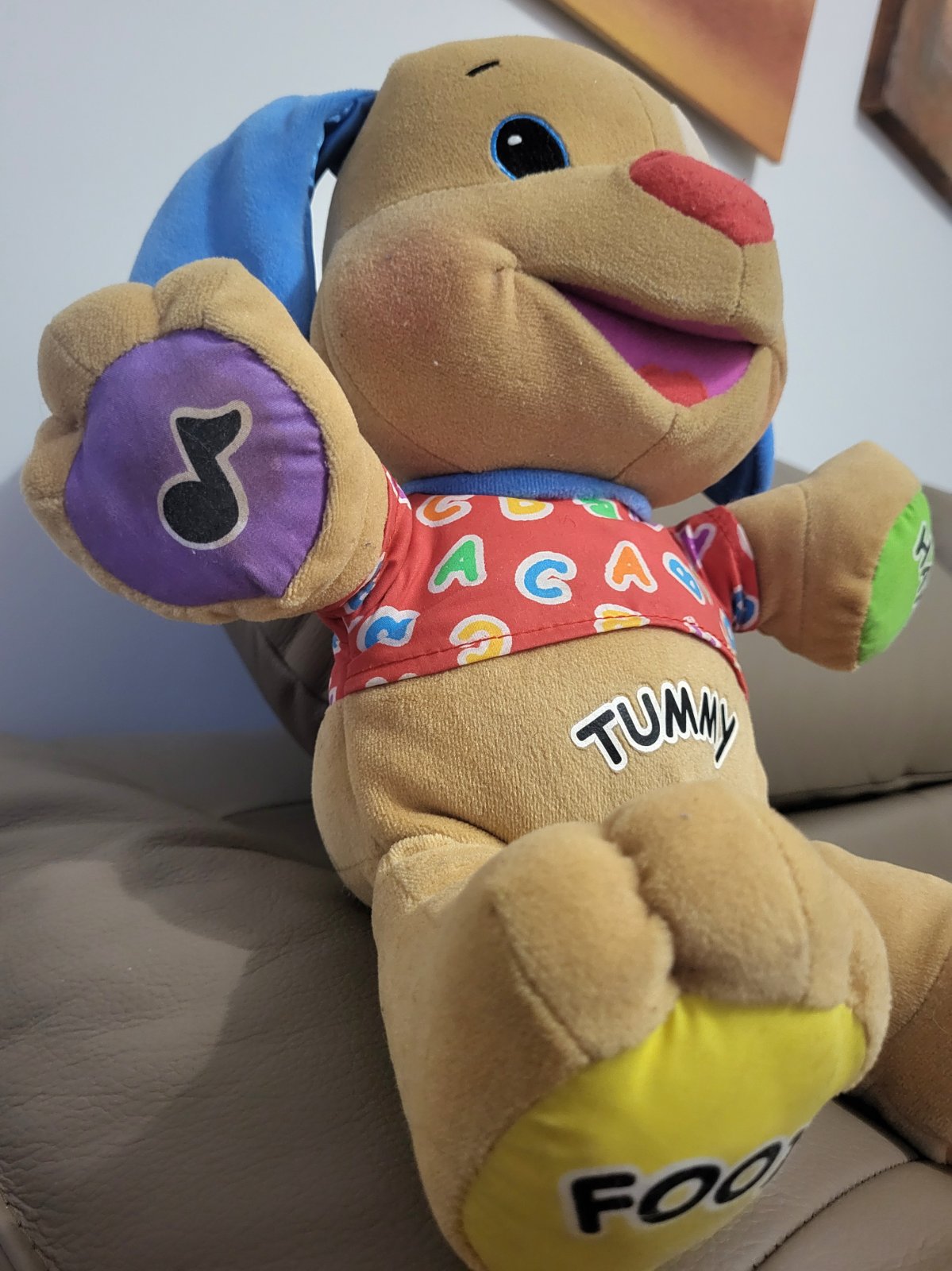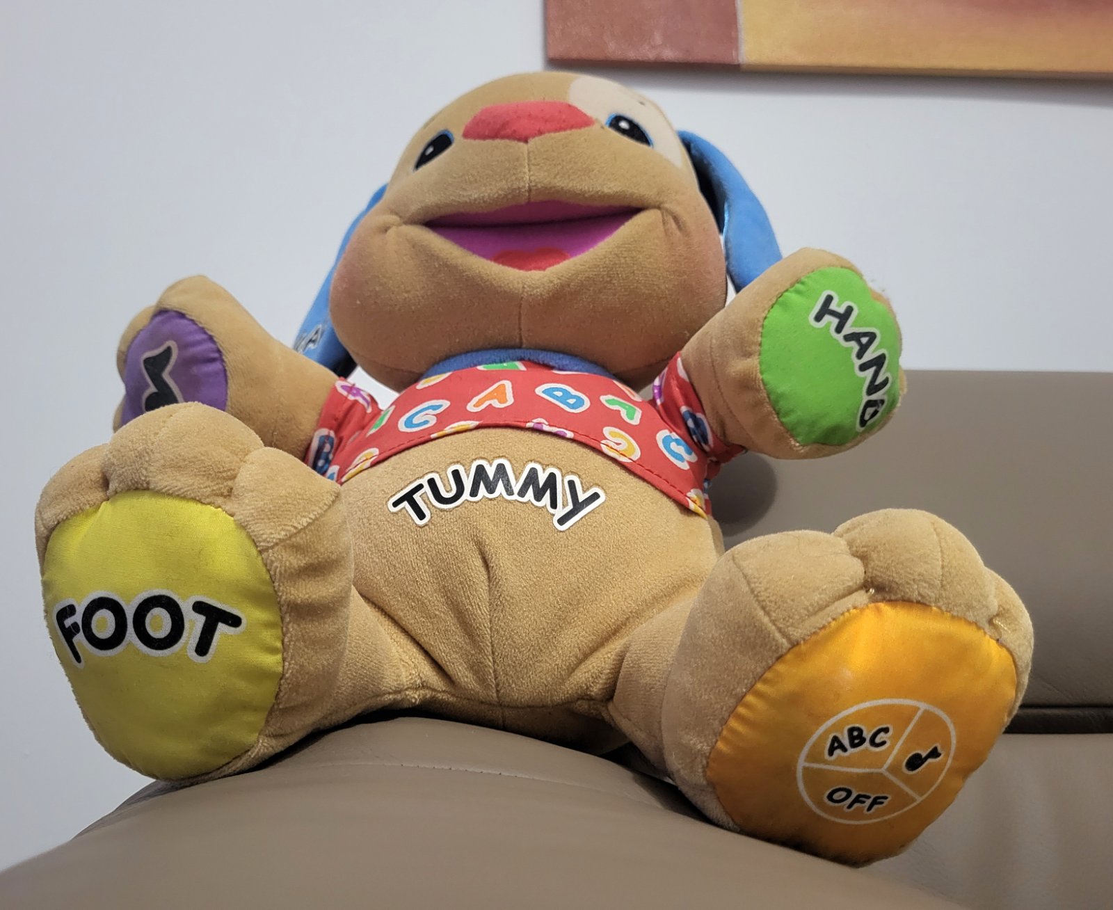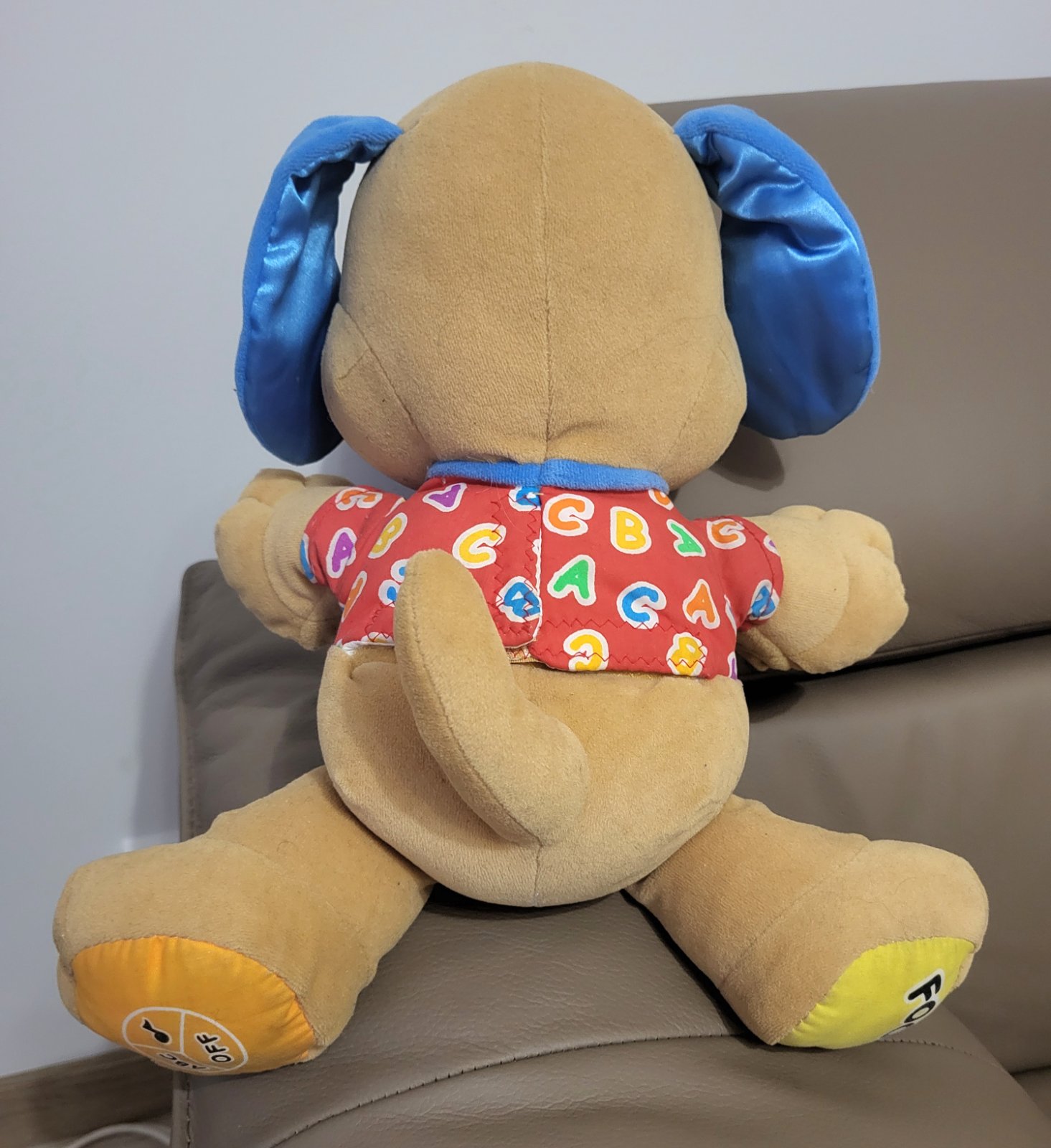 Hovoriaci psík od značky Fisher-Price z edície Laugh & Learn (Smej sa a poznávaj), navrhnutý na vzdelávanie detí prostredníctvom hry, hovorí angličtinou.