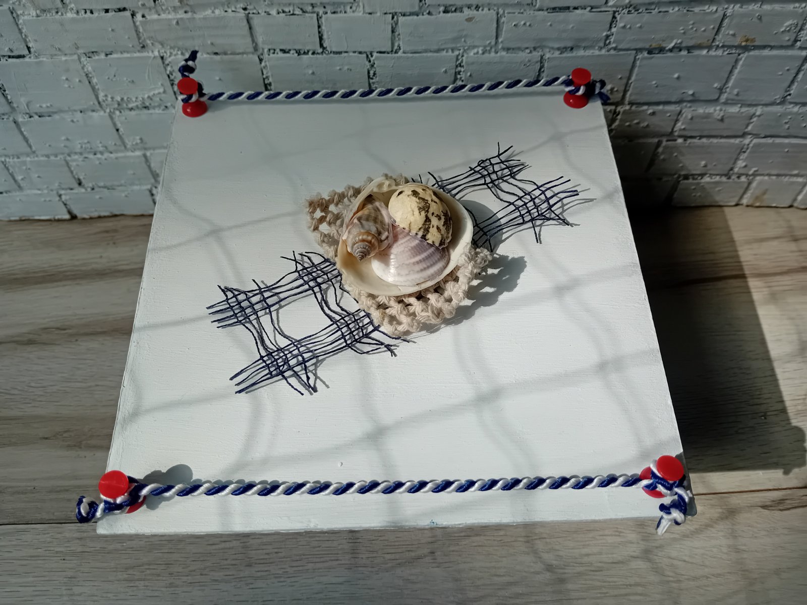 Doplnky tvoria veľká mušľa 🐚, v ktorej sú menšie mušle a dve dekoračné sieťky na stole.