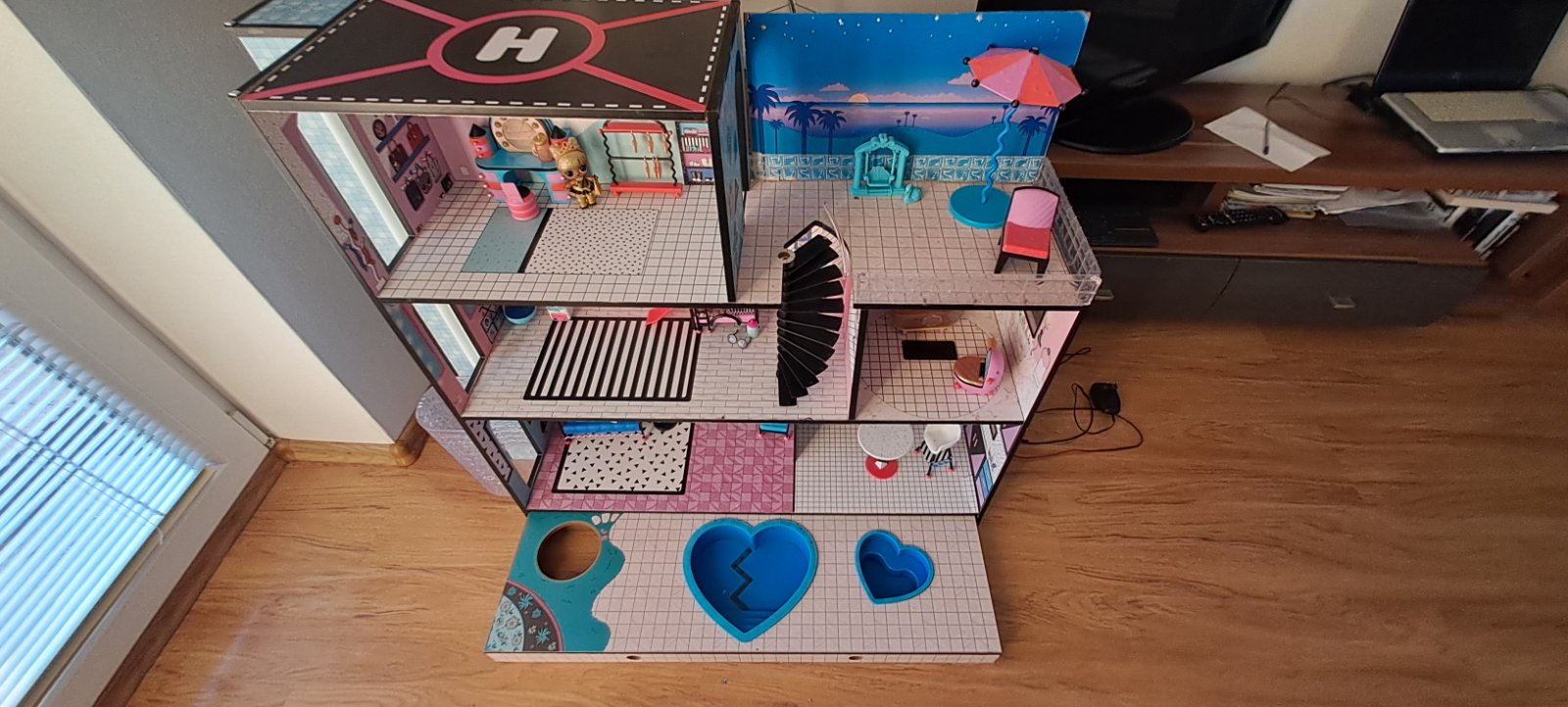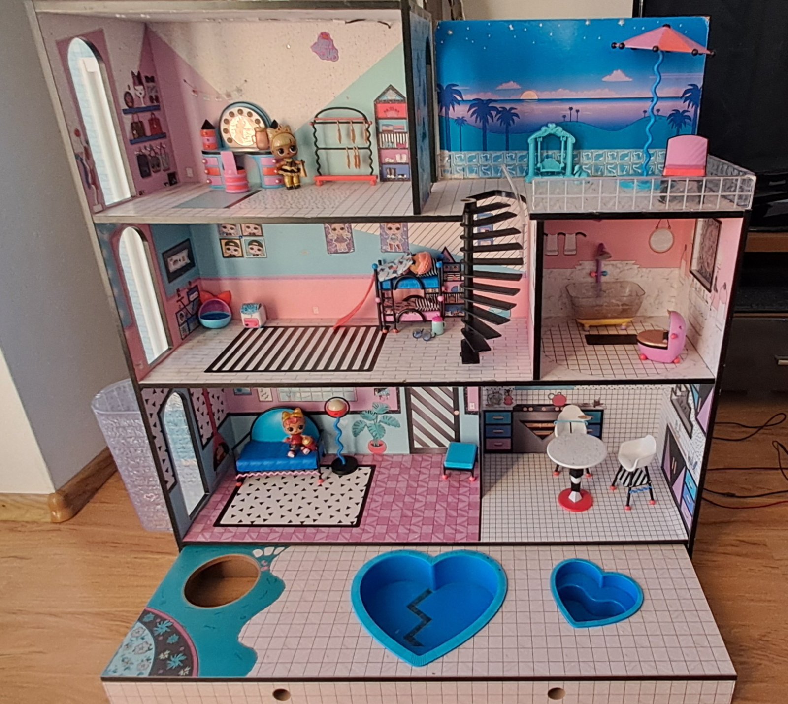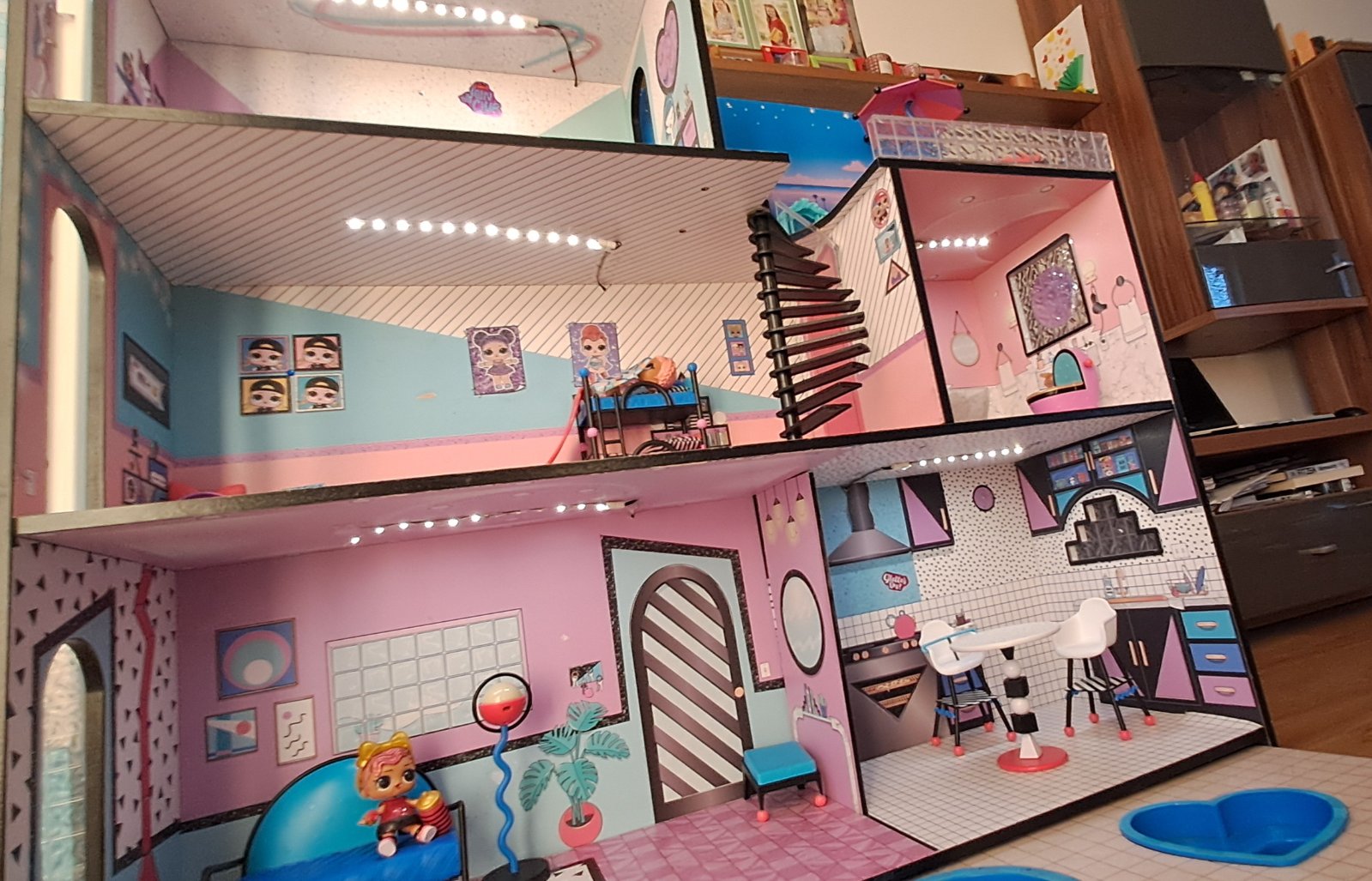 Ponukam hrany domcek pre babiky LOL v super stave. Dorobili sme na domceku osvetlenie. V kazdej izbe je LED pasik a ked sa trafko zapne do elektriny, cely domcek svieti (vid. posledna fotka).