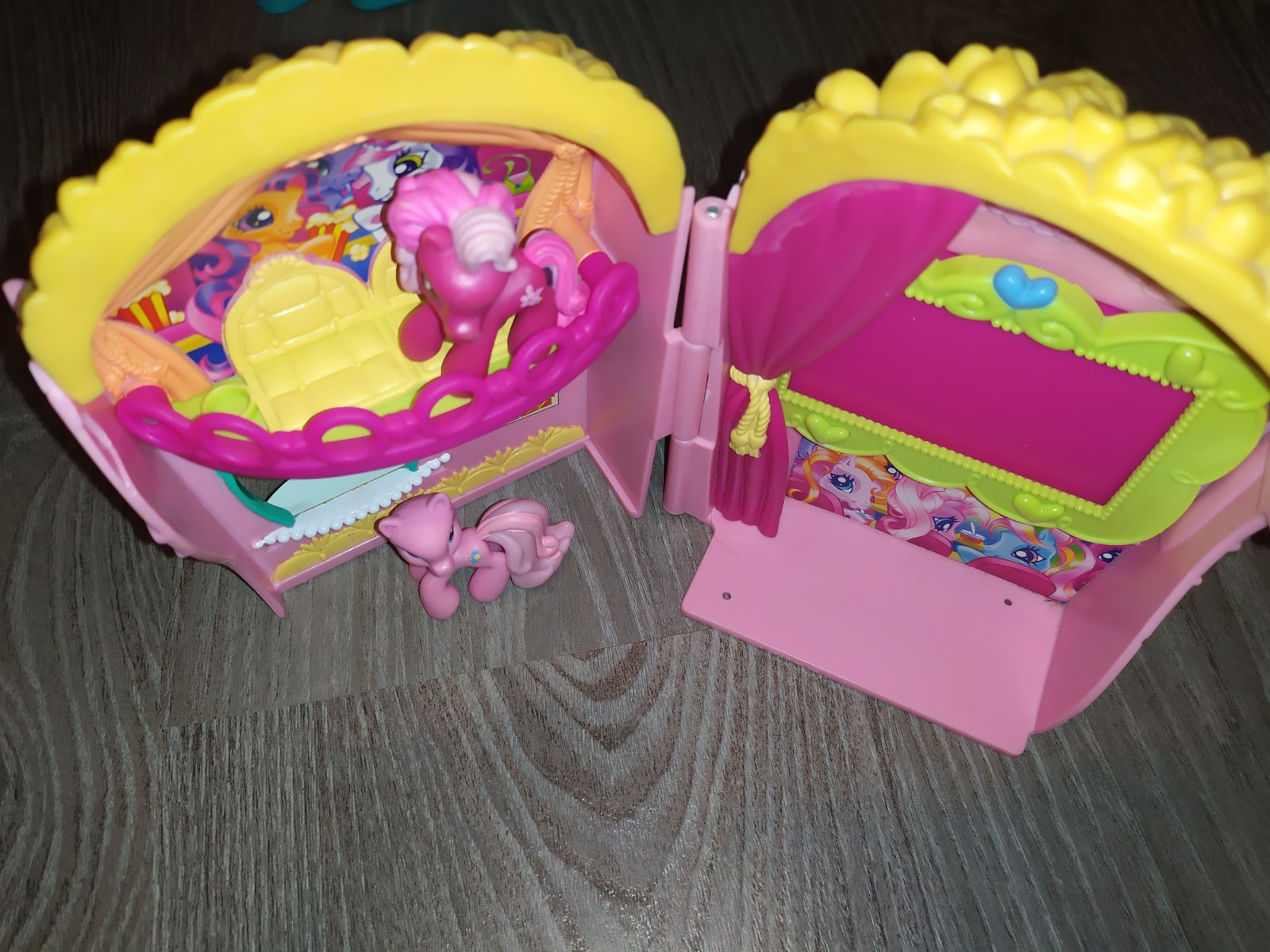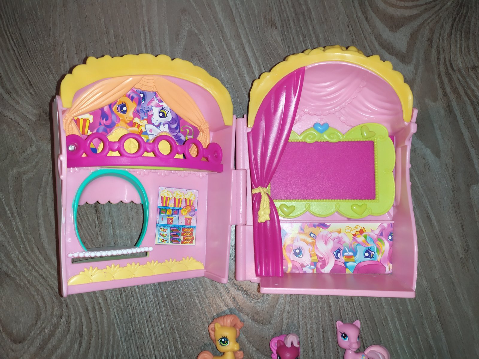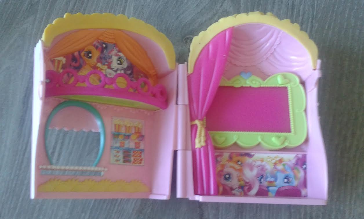 Predam domcek pre poniky my little pony. Kino v tvare popcornu, kde vase poniky mozu sledovat tie najuzasnejsie filmy :) Pekny hrany stav. Pridávam k nemu 3 nahodne ponicky, z mojich inzeratov. Ponici sa zmestia aj do uzatvoreného domu a tak ich viete aj prenášať.