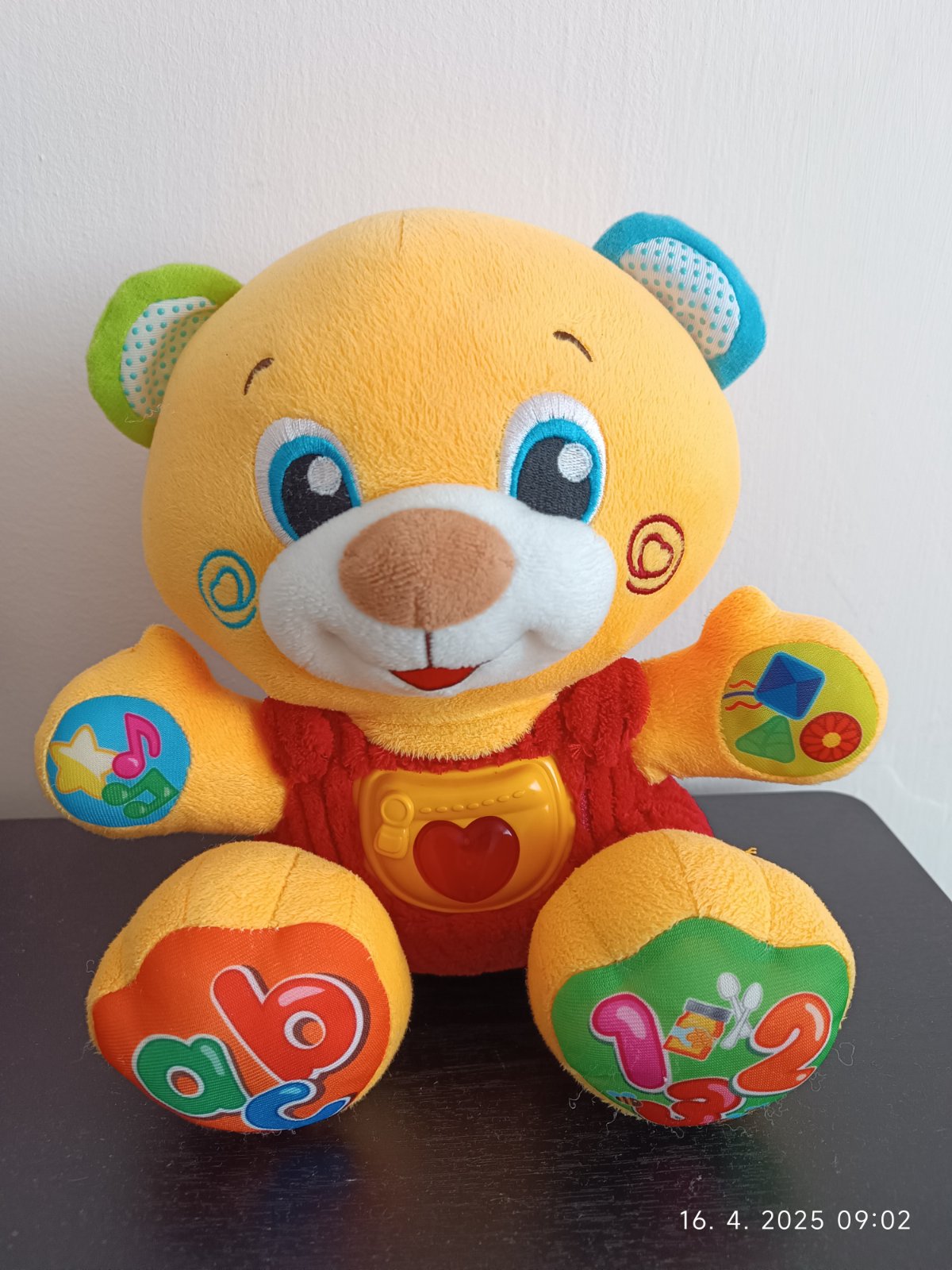 Mäkký, plyšový medvedík s 5 interaktívnymi tlačidlami na učenie prvých číslic, tvarov a písmen. Prítulný medvedík deti naučí mnoho nových slov pomocou zábavných piesní a riekaniek. Srdiečko na hrudi svieti.
