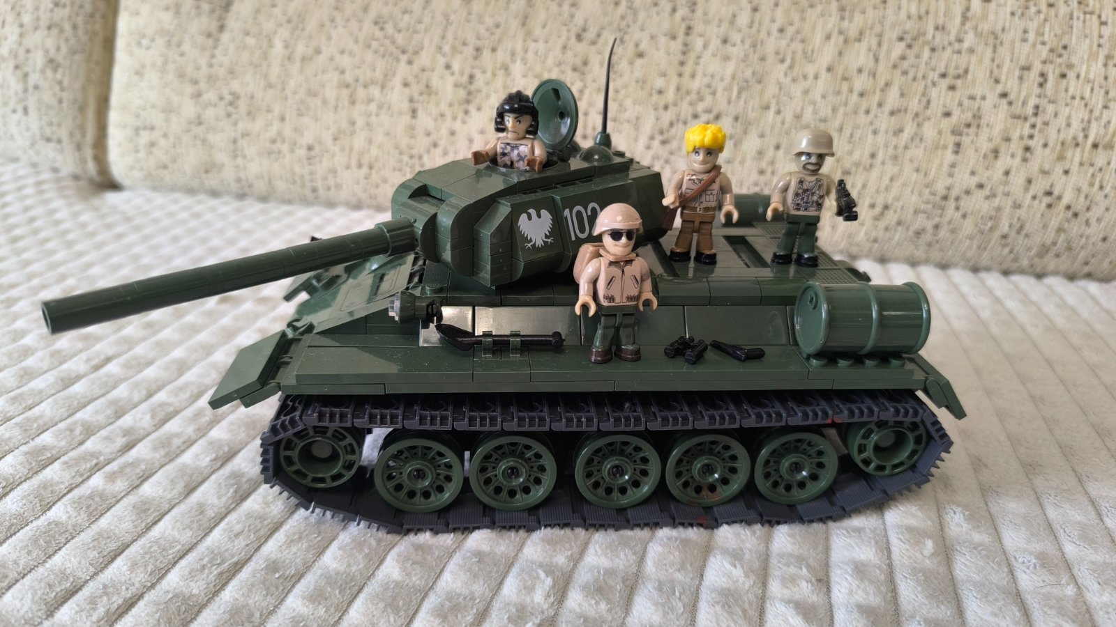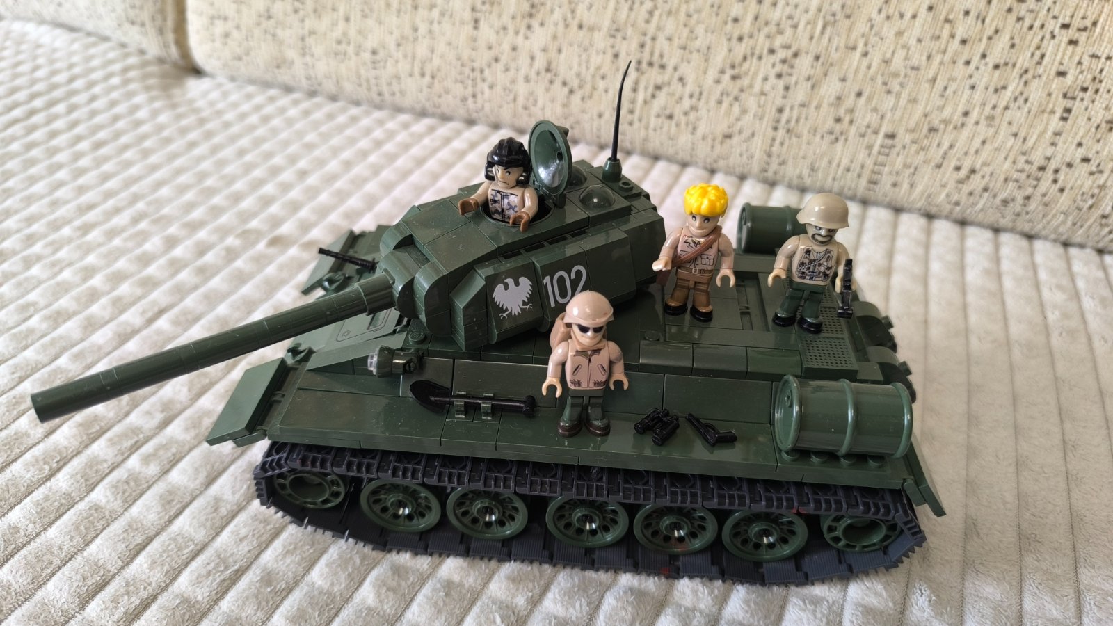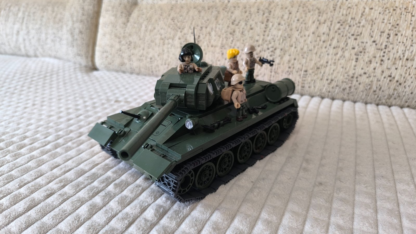 Ponúkam hranú stavebnicu, ruský tank T-34 od Cobi. Figúrky vojakov sú iné, keďže ide o hranú stavebnicu a syn panáčikov preskladával. Iné môžu byť aj zbrane a náradie, ktoré sú v stavebnici. Potešilo by ma, ak by táto vojenská stavebnica ešte niekomu poslúžila na hru.