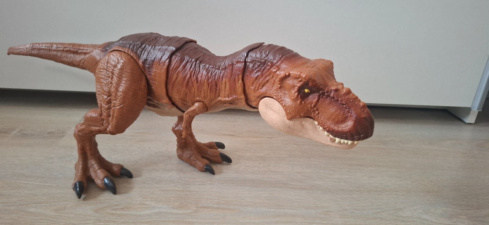 Dinosaurus so zvukom, otváranie úst a hýbanie krkom pomocou chvosta. Bez poškodenia, výborný stav. Dĺžka 58 cm, výška 19cm.