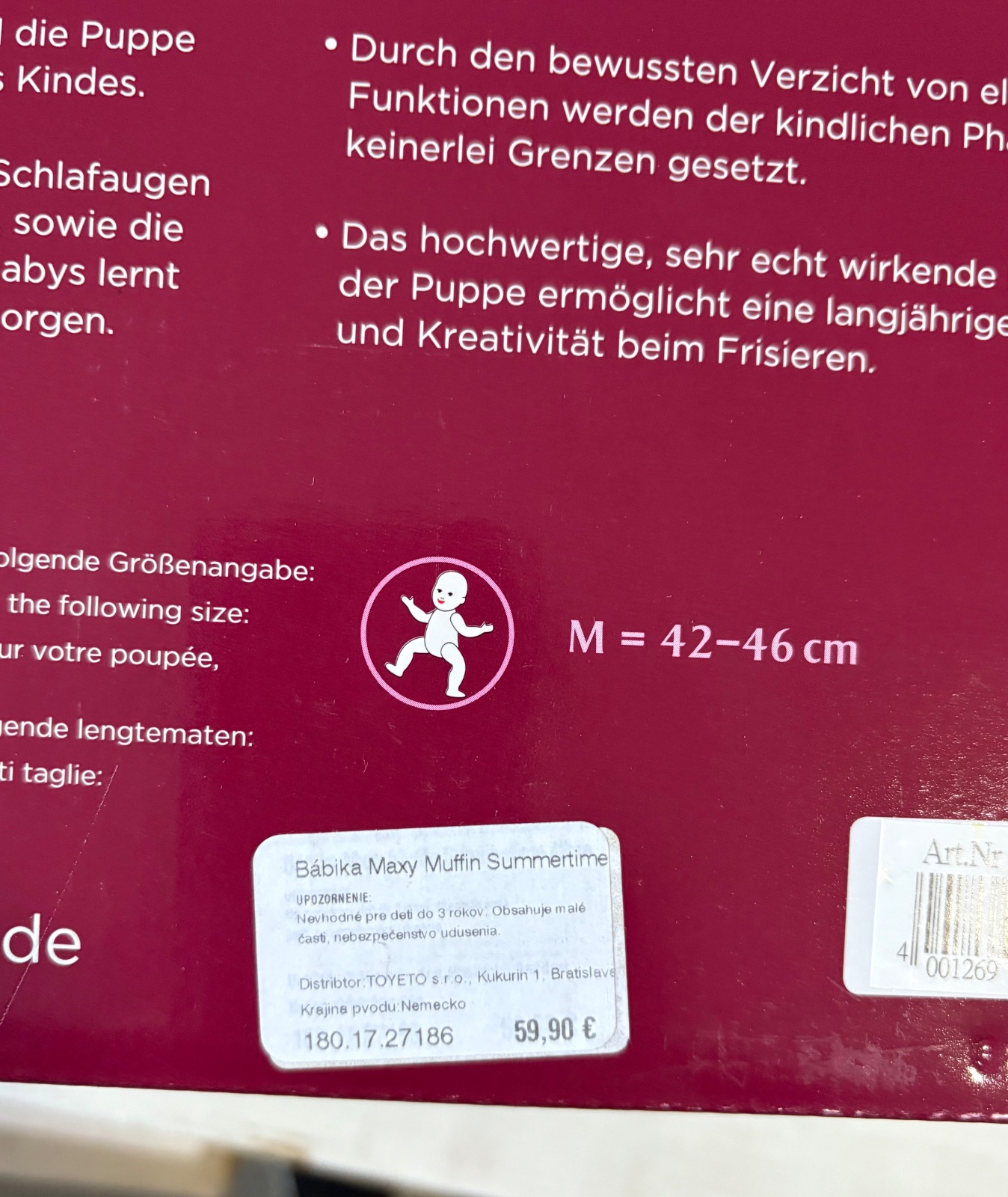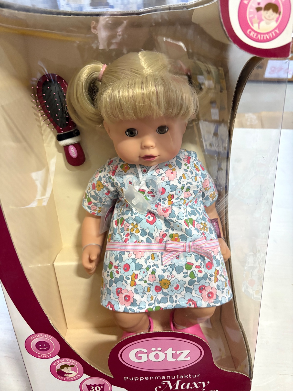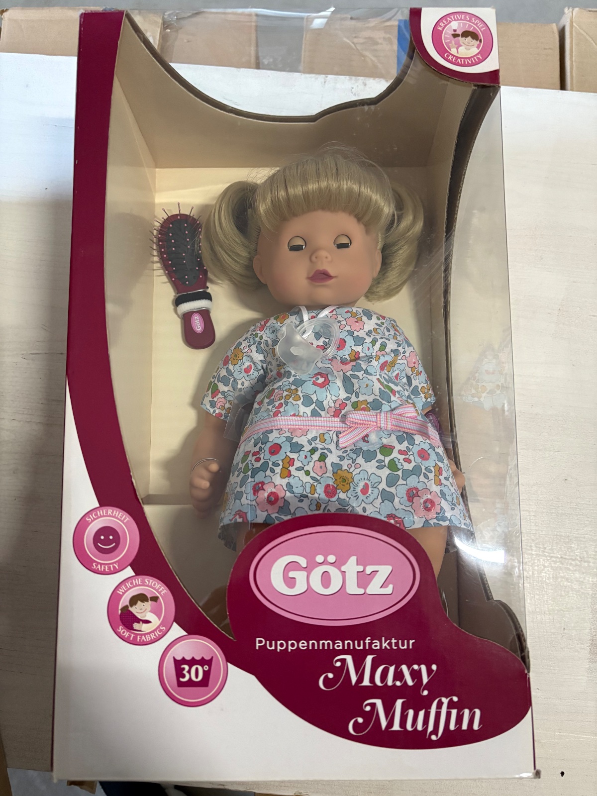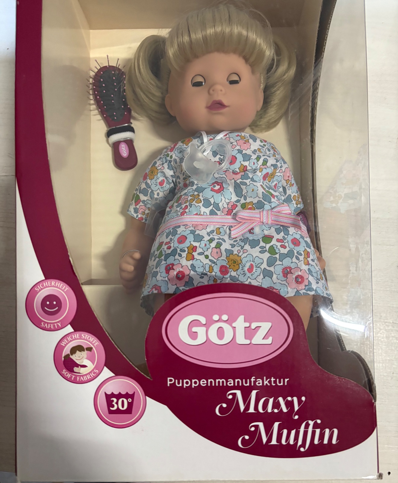 Bábika Maxi Muffin „Summertime“ od nemeckej značky Götz má na sebe letné šaty cez spodnú bielizeň. Na nohách má ružové kroks. Jej blond vlasy sa dajú upravovať rôznymi spôsobmi pomocou kefy na bábiky.