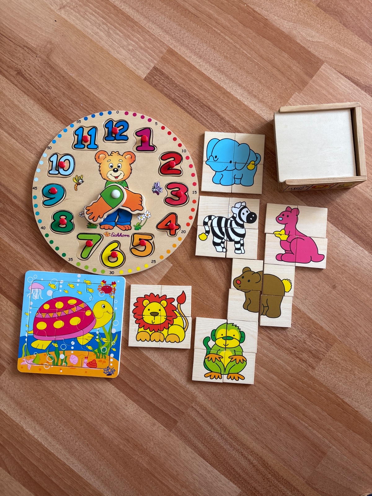 Rôzne drevené vkladacky na učenie: Zvieratká, Hodiny
