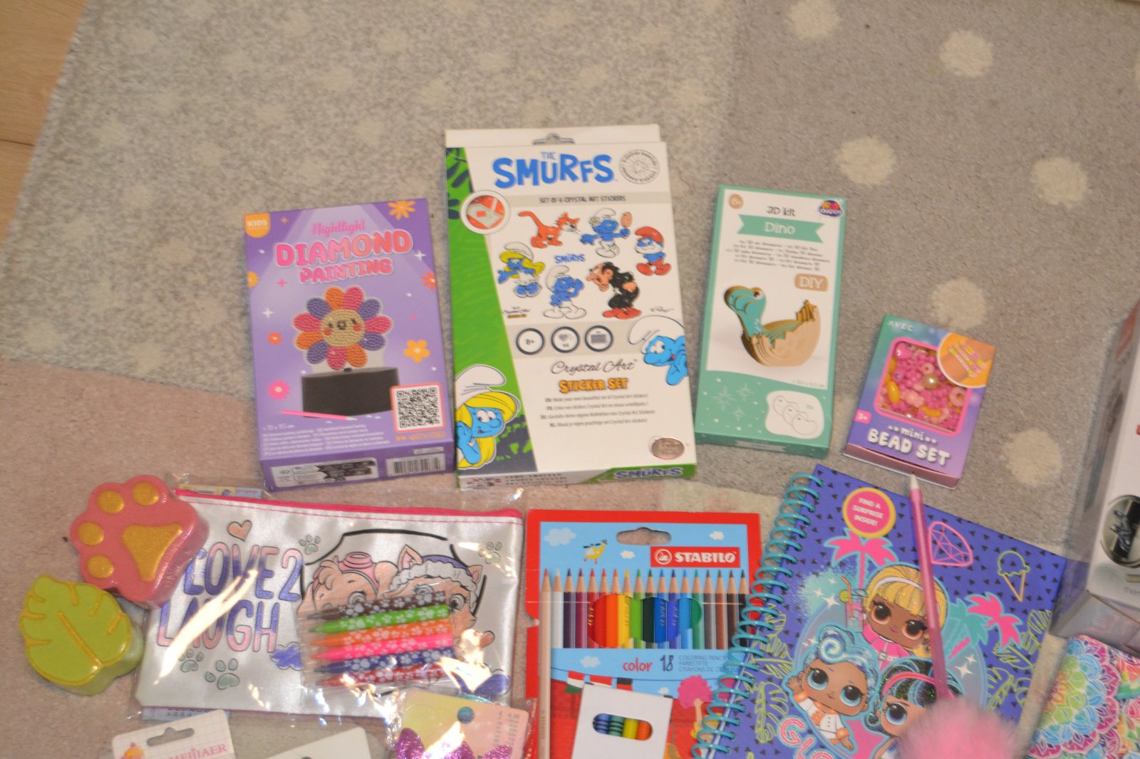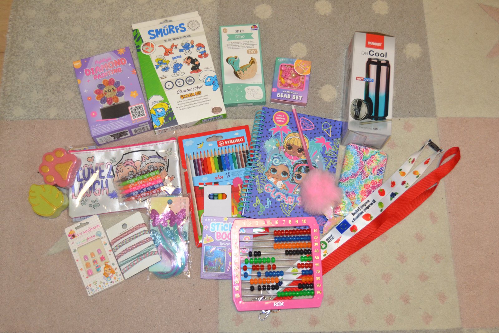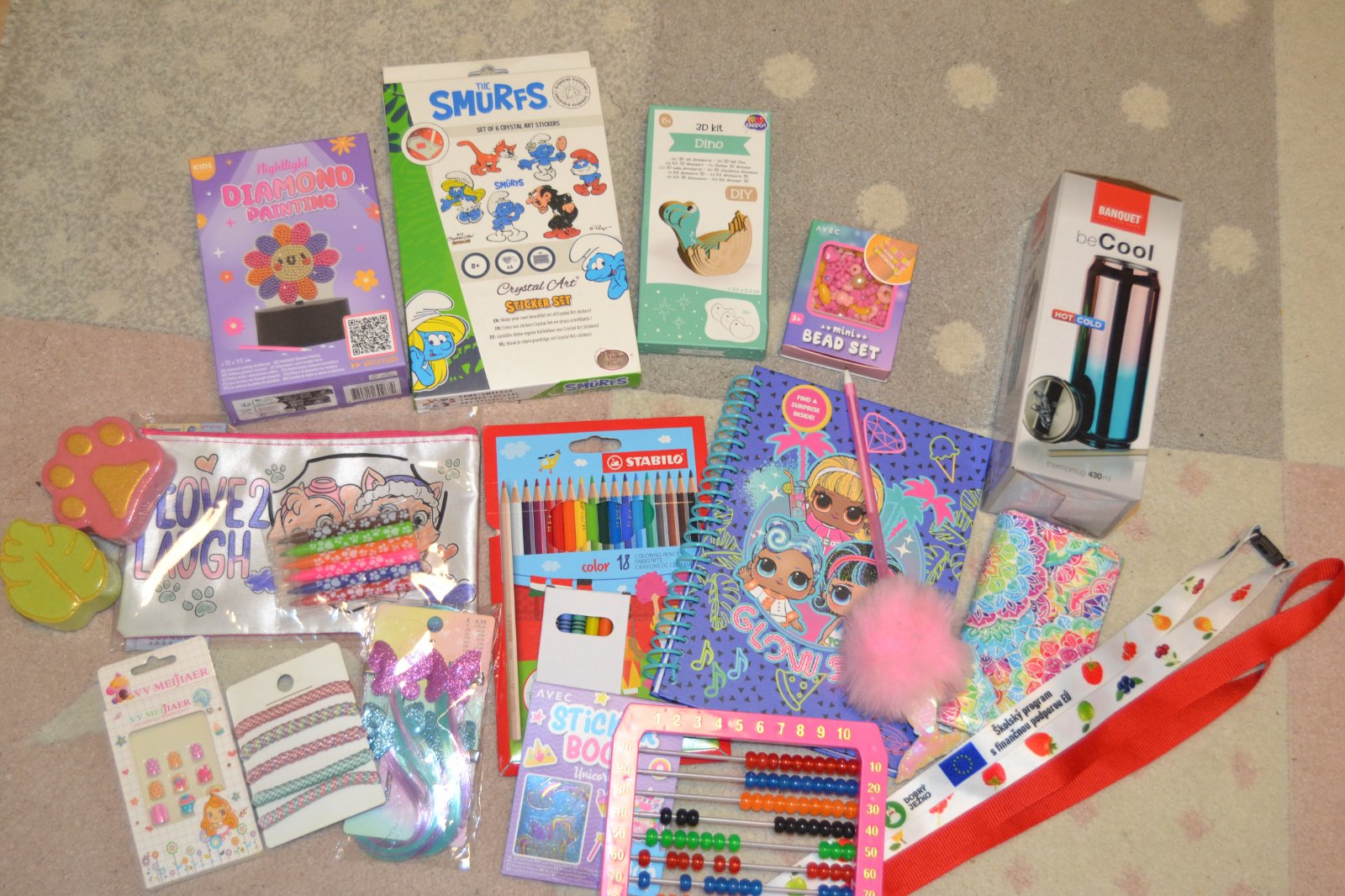 Písacie potreby, farbičky, pero, peračník s fixami, tvorivé sady, drevené 3D zvieratko, peňaženka, šnúrky, voskovky, nálepky, korálky, termoska, počítadlo, sponky, gumičky, šumivé bomby do kúpeľa, svietiaca kvetinka, ai ..