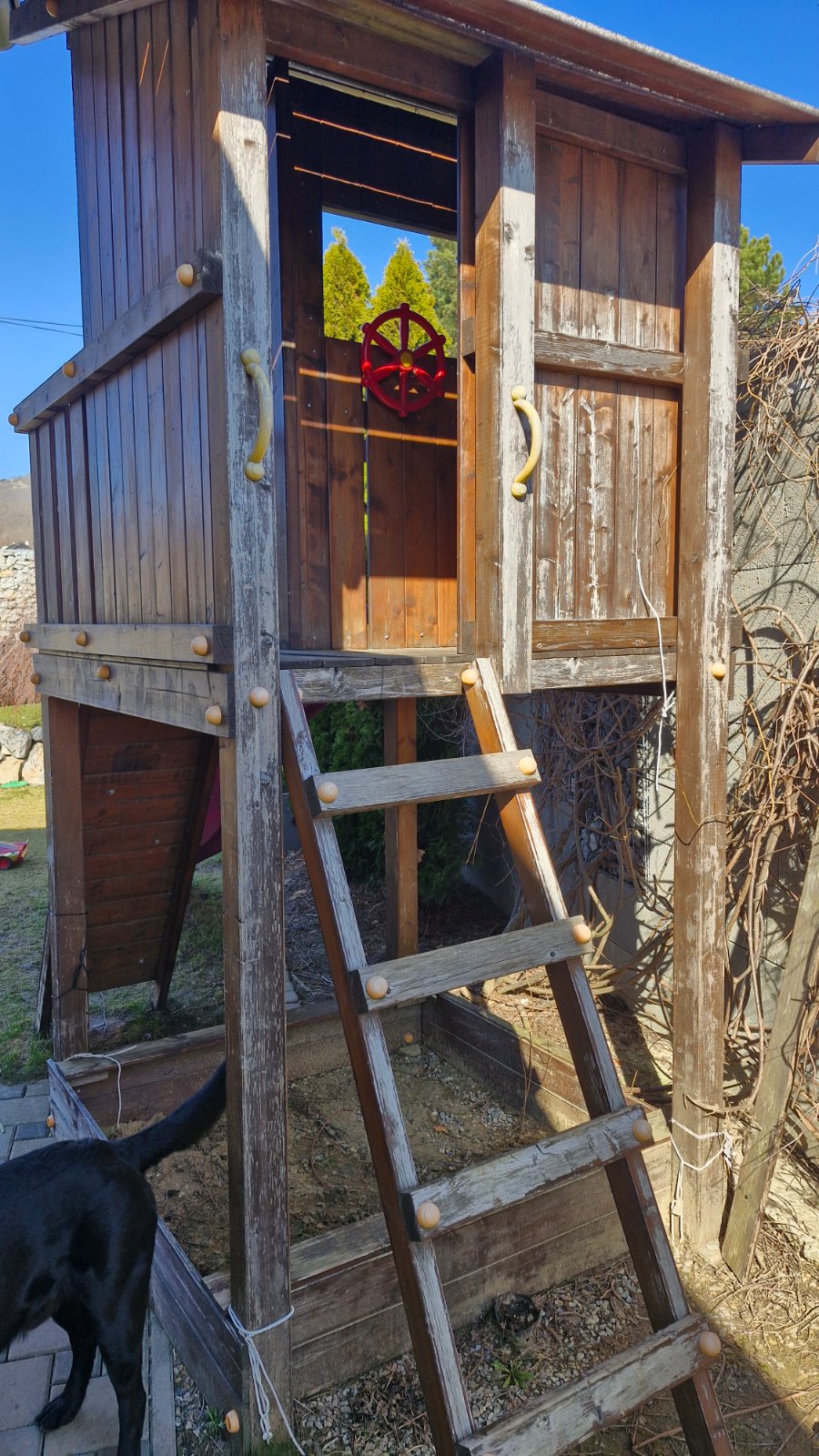 Dole pieskovisko,hore posed,šmýkala,rebrík a lezecká stena sa dajú premiestniť podľa potreby. Treba si ho iba prebrúsiť a pretrieť. Iba osobný odber.