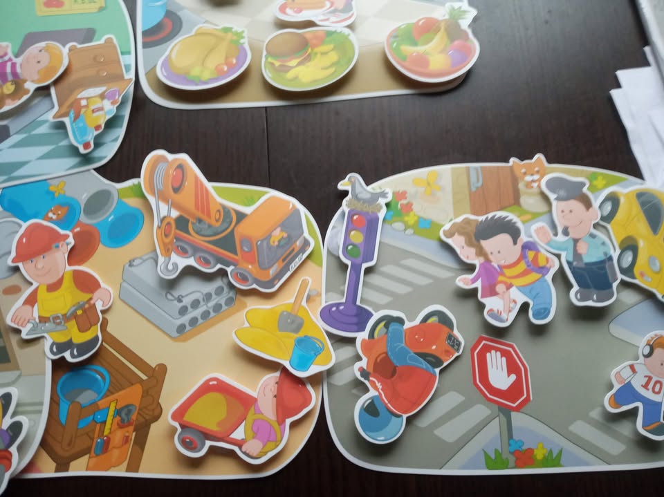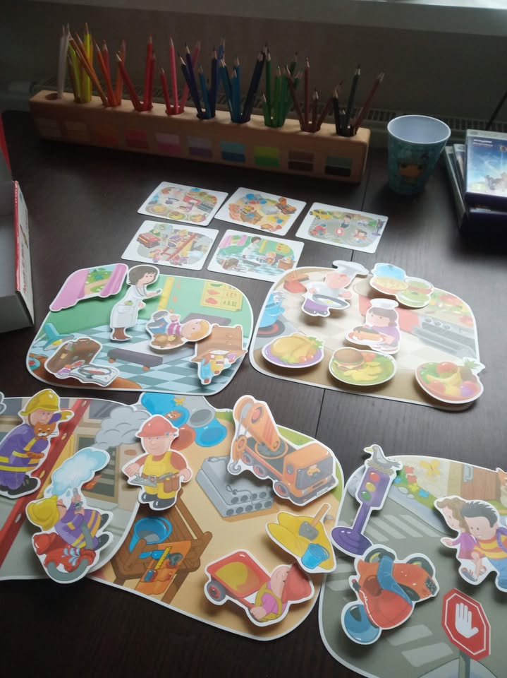 Hra na rozvoj jemnej motoriky, rozlišovanie profesií a triedenie komponentov k nim prislúchajúcich, (jednotlivé dieliky sú na suchý zips).