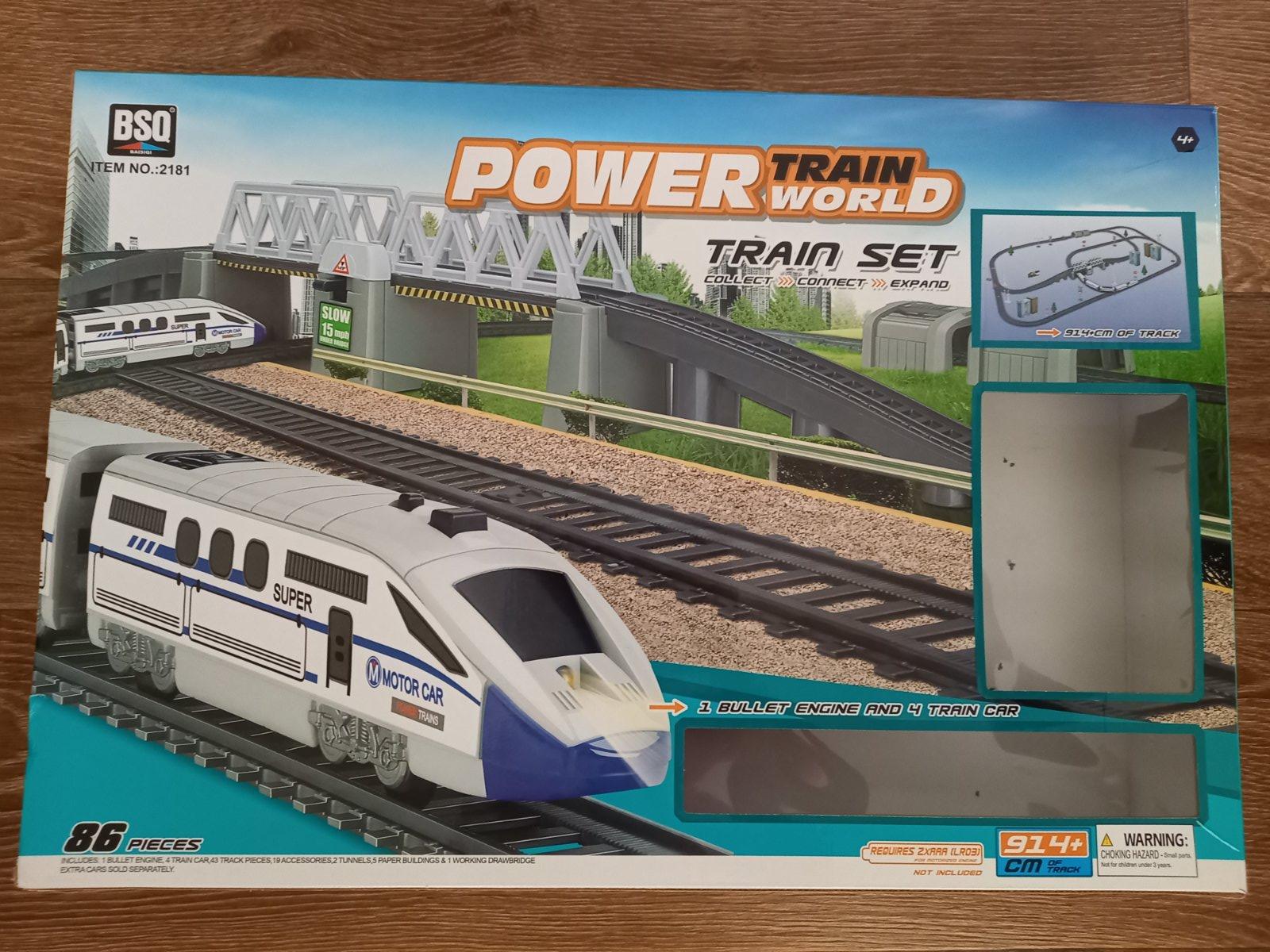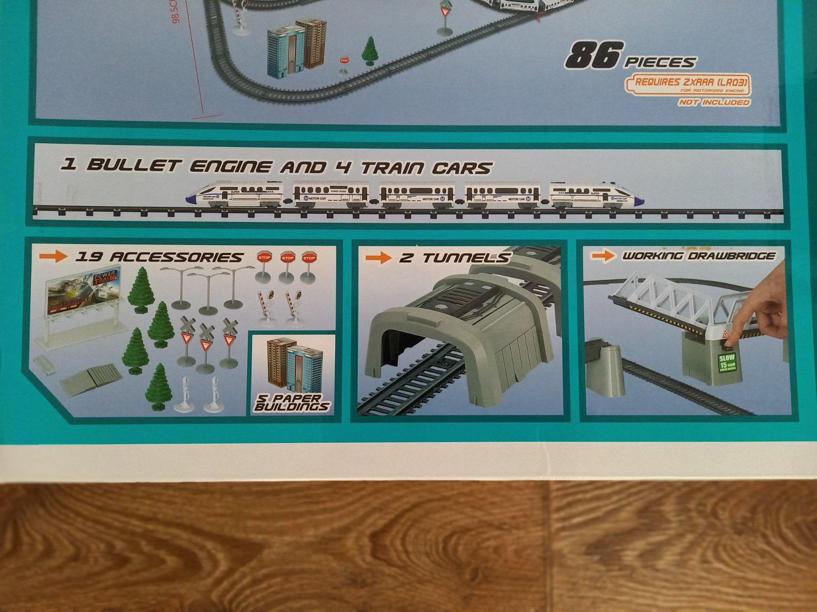 koľajnice s výhybkami,lokomotíva s riadenou rýchlosťou,4vagony,2veľké tunely ,pohyblivý most,stromy,budovy,značky,naviac koľajnice z rovnakej sady