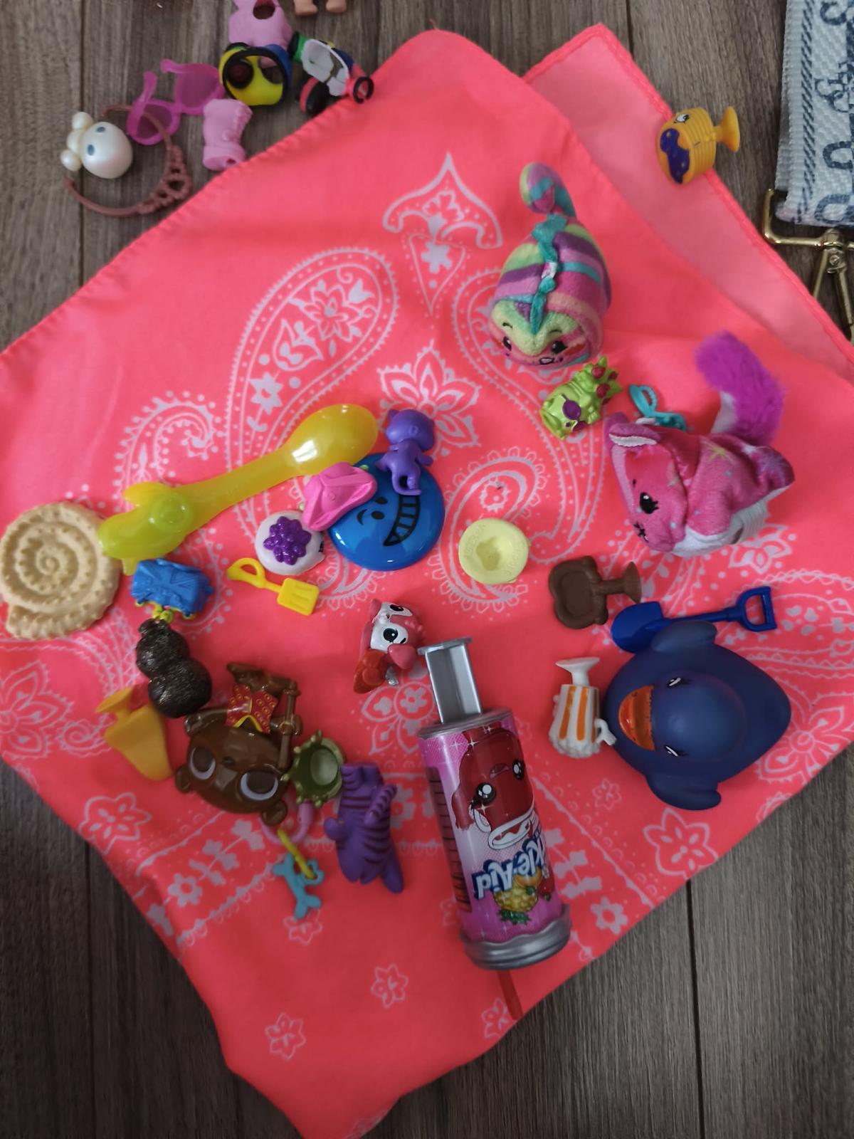 mix vecí, všetko čo je na foto. LOL aj Hatchimals kupované v dráčiku. Stitch su ozdoby na kroxy, neonovo ružová šatka...