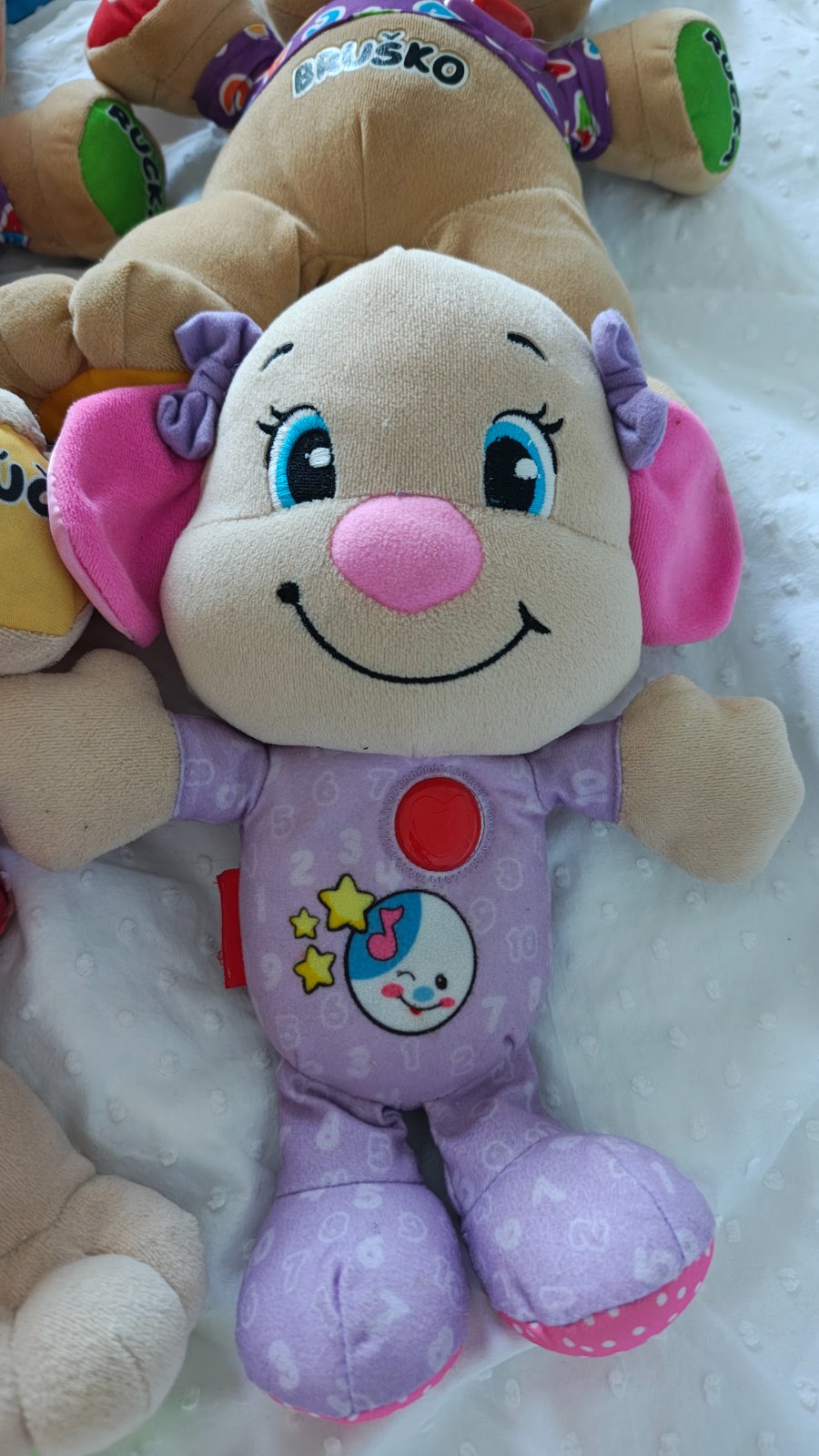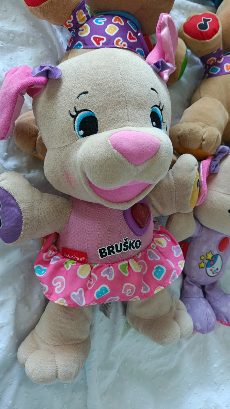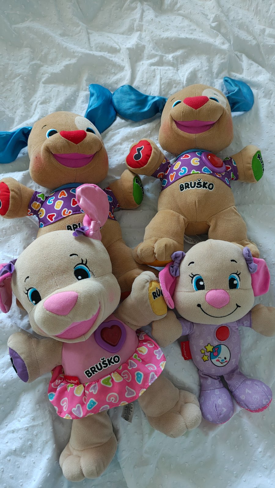 Predám všetky 3 plne funkčné hračky spolu (ten jeden pes štvrtý rovnaký nefunguje, tak toho prihodím zadarmo) Je to pes chlapec, pes dievča a starší typ psíka, ktorý hrá uspávanky.