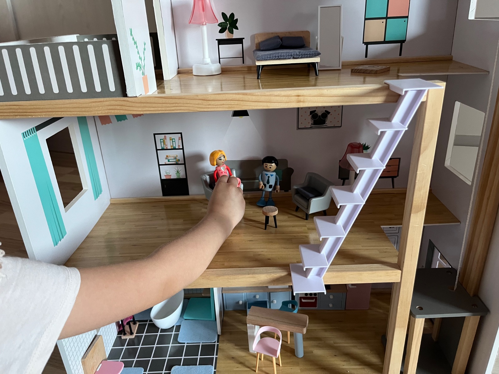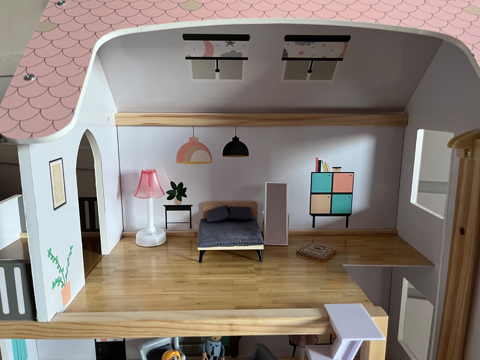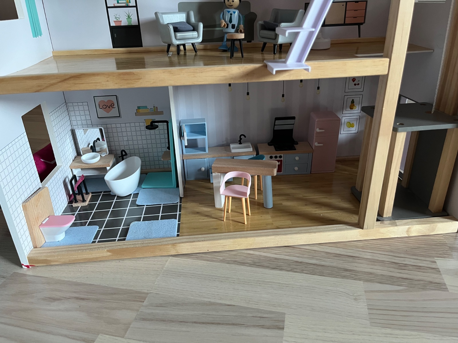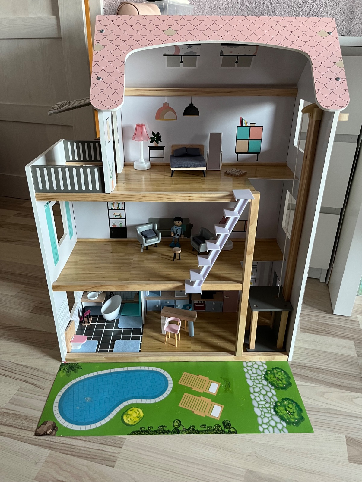 Dreveny domcek na hranie, komplet zariadenie, akurat vytah sa neda zaseknut, snurkou sa taha ale neda sa zafixovat na poschodi, opravit sa to da my sme to neriesili…
