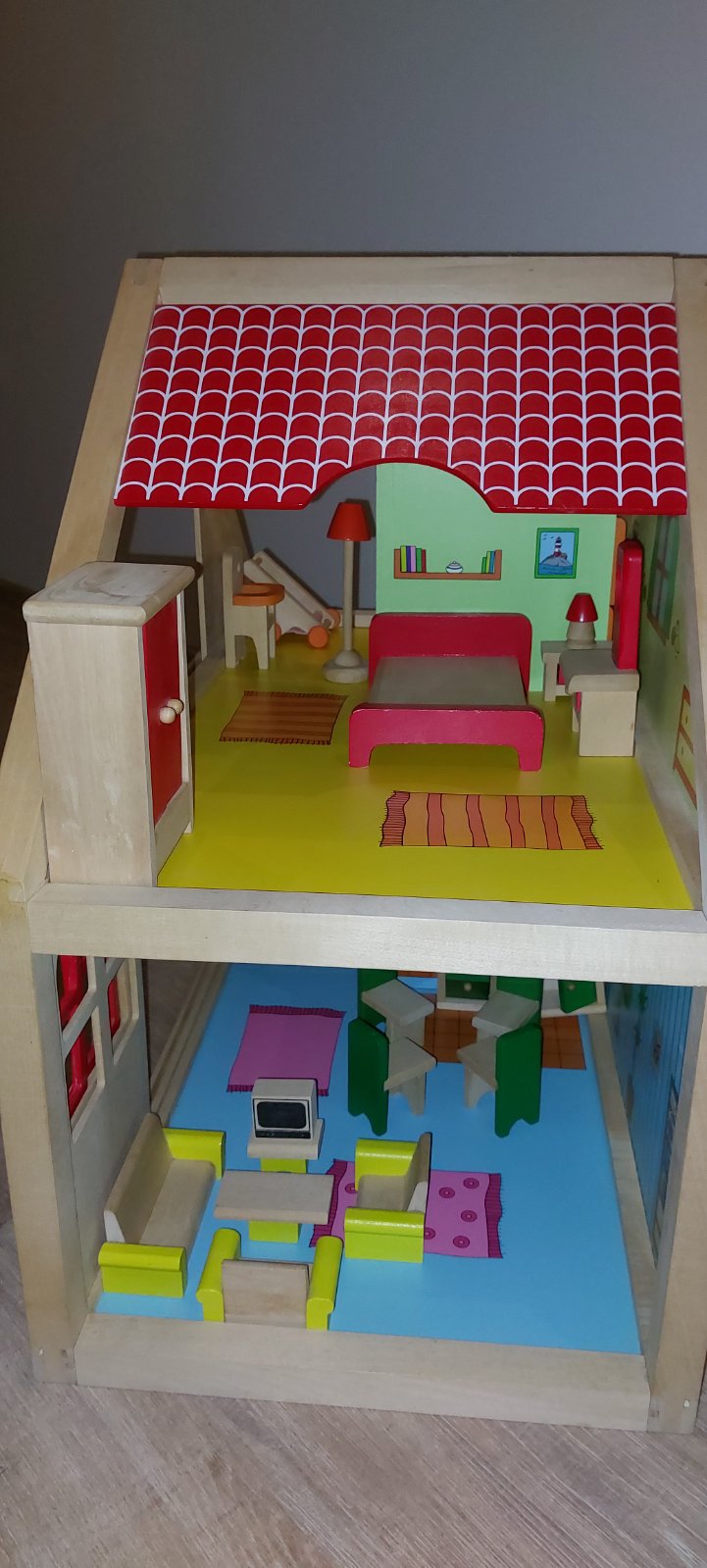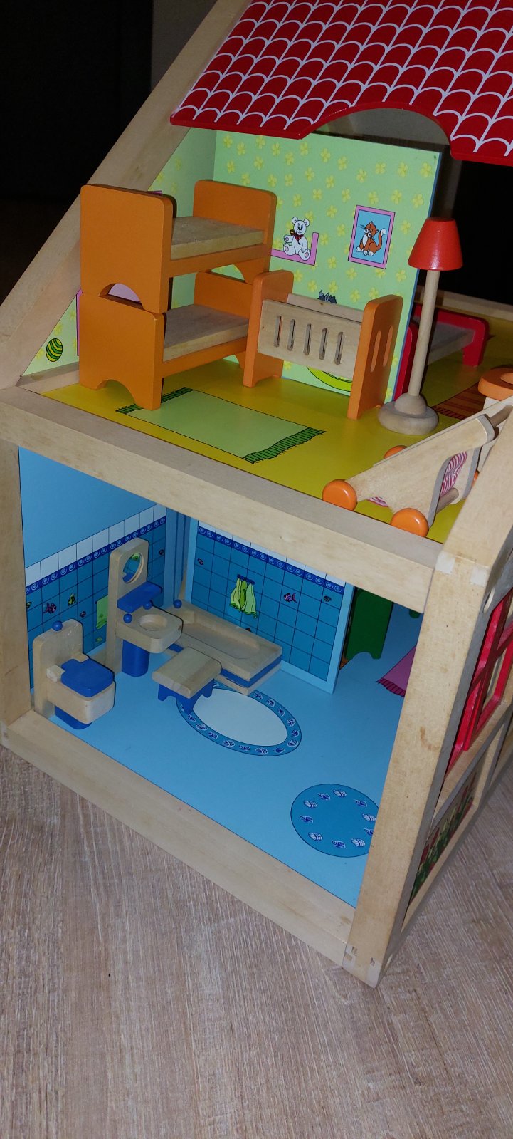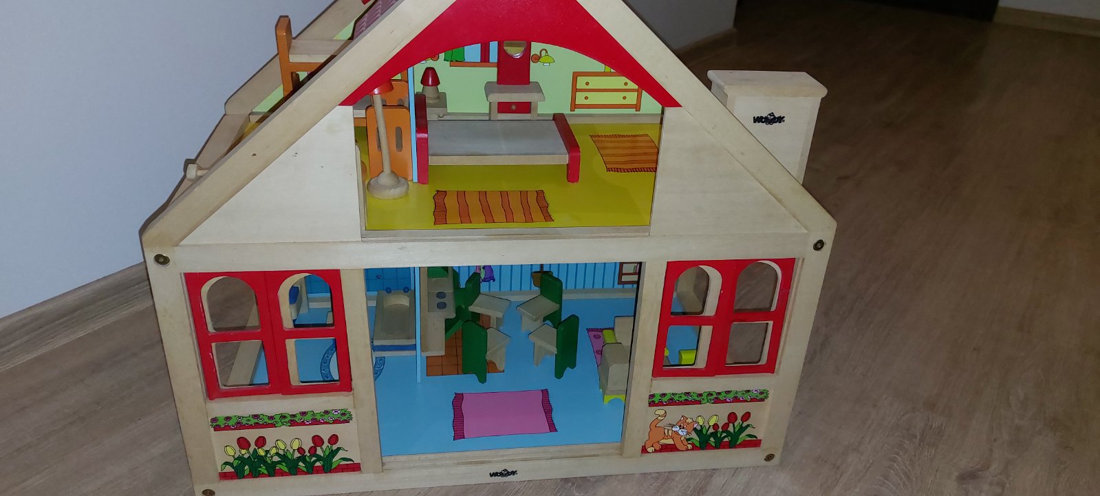 Krasny dreveny domcek Woody s prislusenstvom a rodinkou.