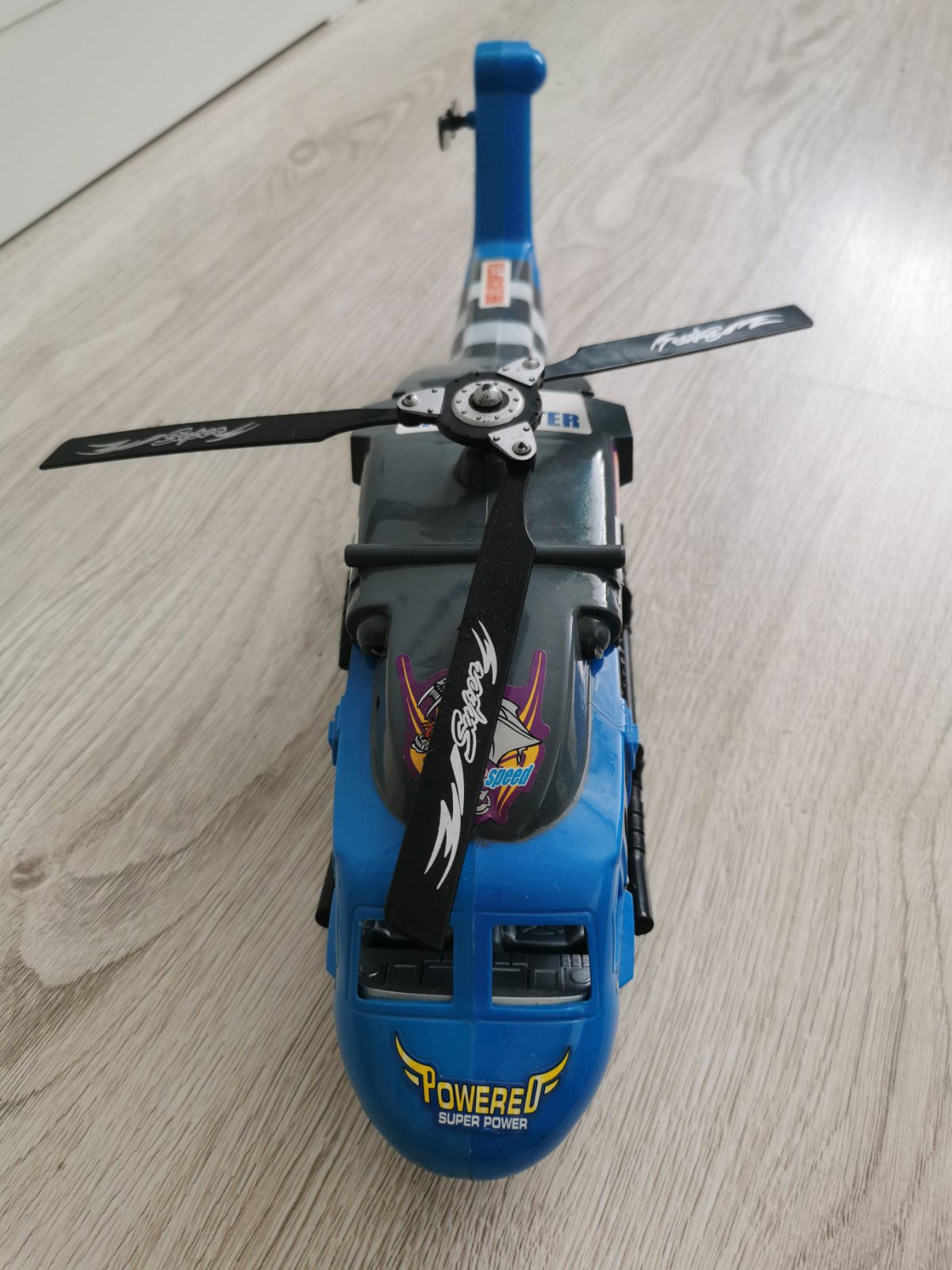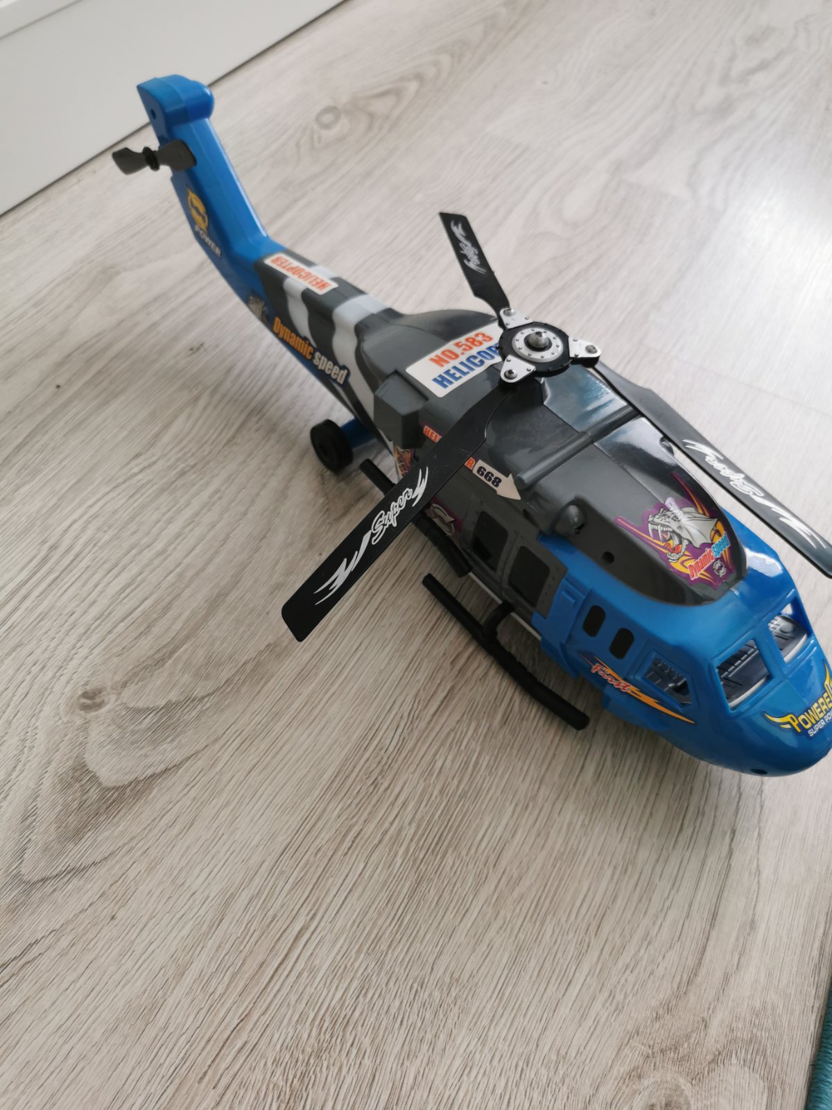 Vrtuľník, ktorý bliká, pohybuje sa po zemi, keďže dole je koliesko, hrá hudba. Top stav, bez poškodenia. Dĺžka cca 43cm, výška cca 14cm, šírka cca 10cm.V