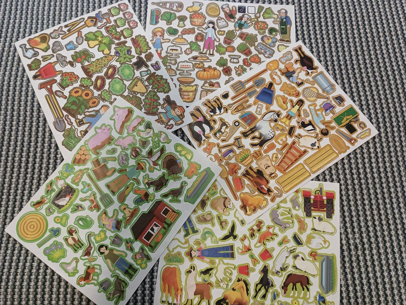 Predám nálepky farma. Sú tam veľkoformátové podklady, na ktoré sa lepia nálepky. Tie sú vinylové a dajú sa preliepať opätovne donekonečna. Chýba zo všetkých možno jedna, čo som si všimla. Veľmi pekný hraný stav. Deti táto hra dlho baví.