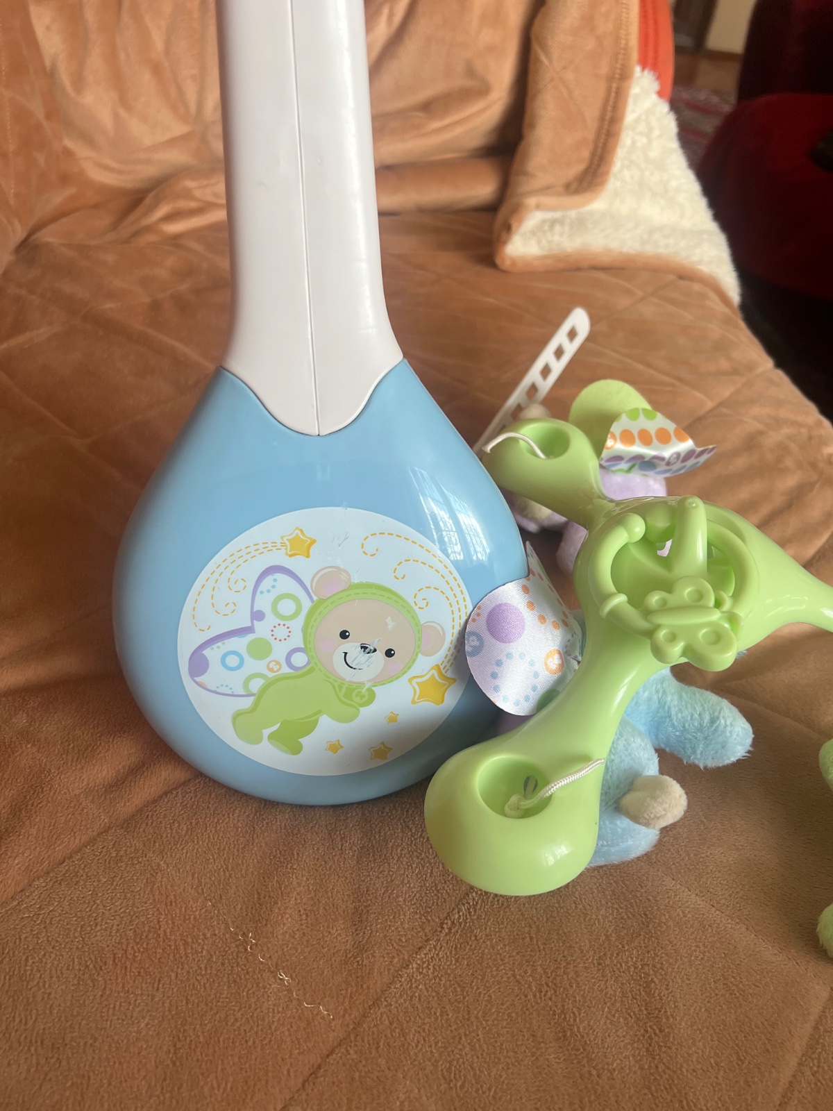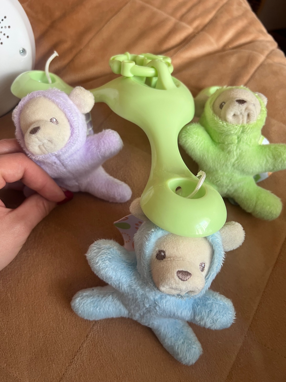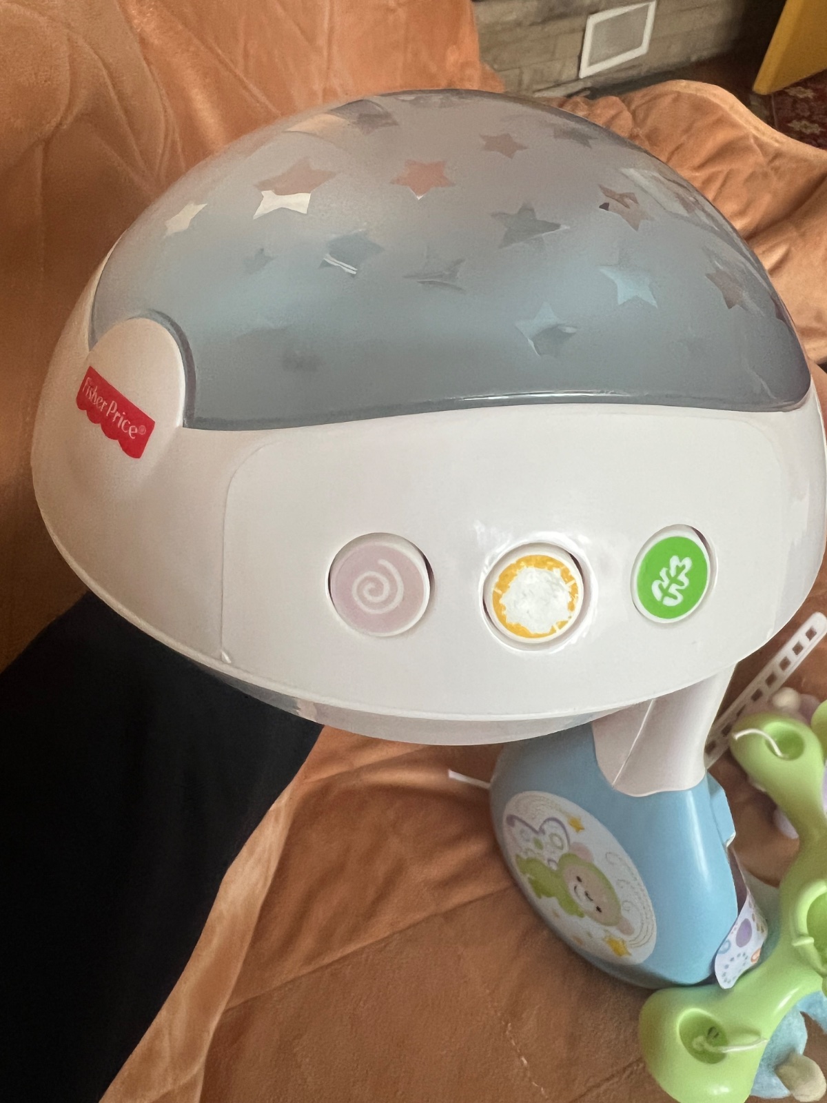 Krasny kolotoč nad postieľku. Ma 3 rôzne prepínače plus svetielko hore kde idú hviezdy. Krásne jemne melódie, je tam aj šum plus vtáčiky.