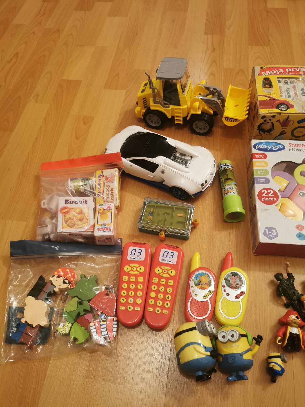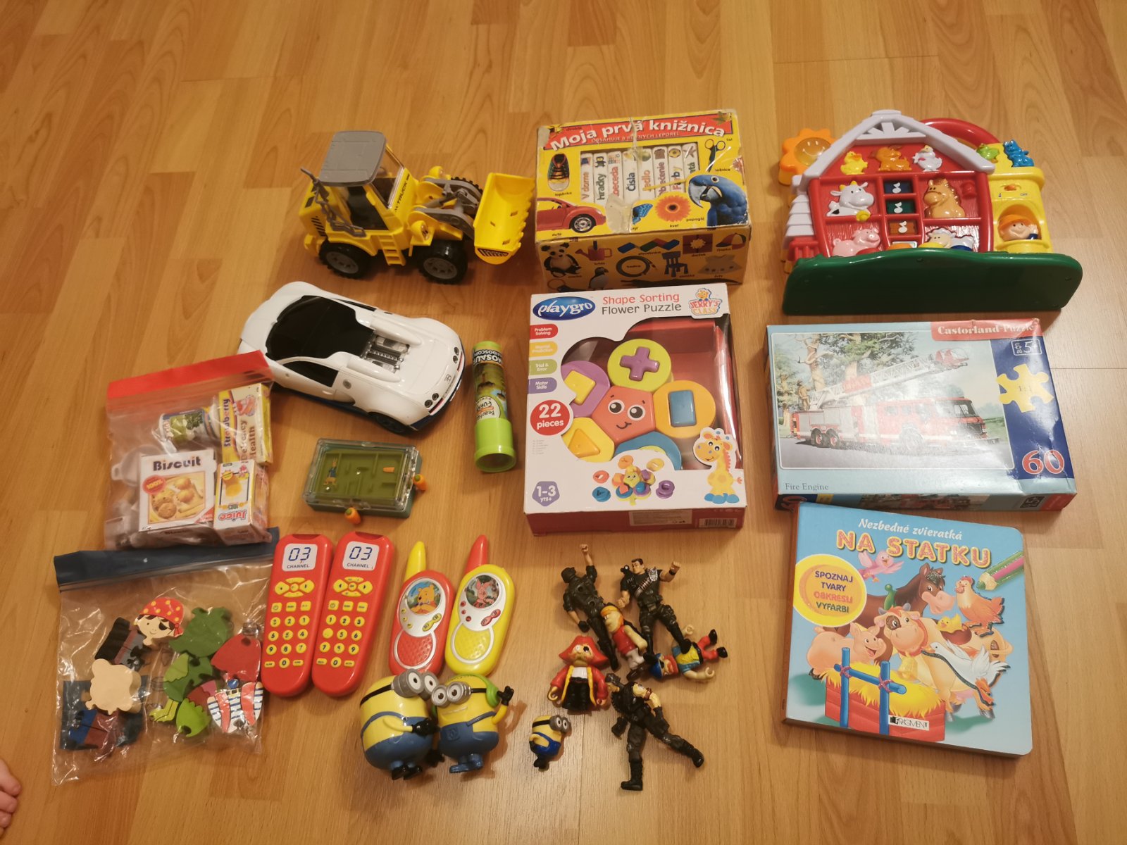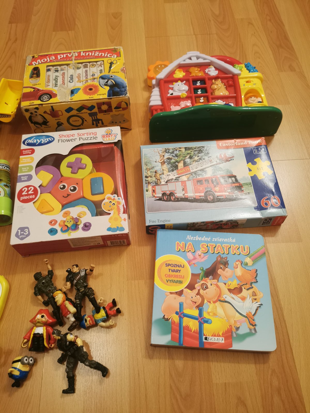 Predám balík hračiek a knižiek. V balíku sa nachádza auto, bager, puzzle z rôznych tvarov, hrací klavír, puzzle s obrázkom hasičského auta, kniha Na statku s vyberateľnými šablonami zvierat, kaleidoskop, figúrky pirátov a vojakov, postavičky mimoňov, vysielačky, diaľkové ovládače, drevená skladačka z 3 postavičiek, blúdisko, kuchynský mini set.