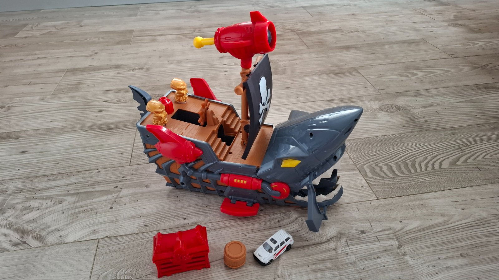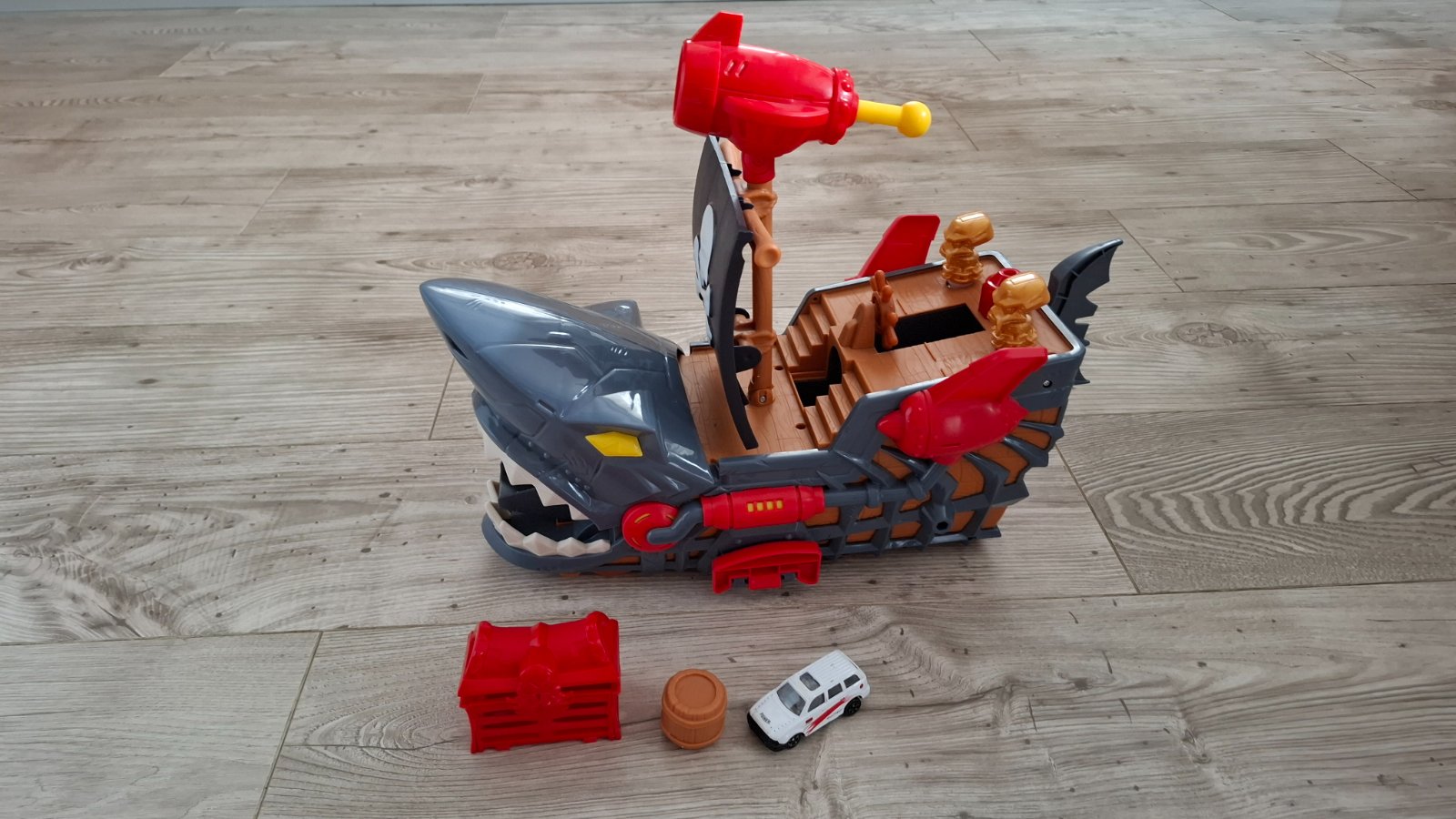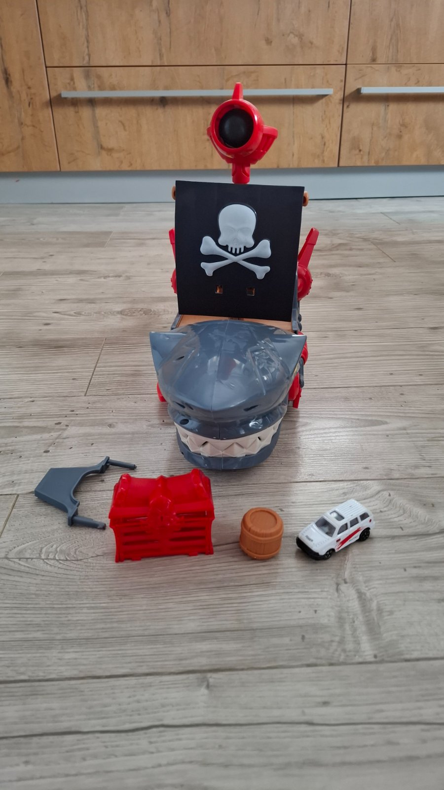 Hrané pár krát autíčko som dala k tomu iné nemôžem nájsť to čo tam bolo ale autíčka tam pasujú hociaké malé.Lod je na kolieskach keď snou dieťa hýbe otvára zralok papuľu a autíčko vinde cez papuľu.