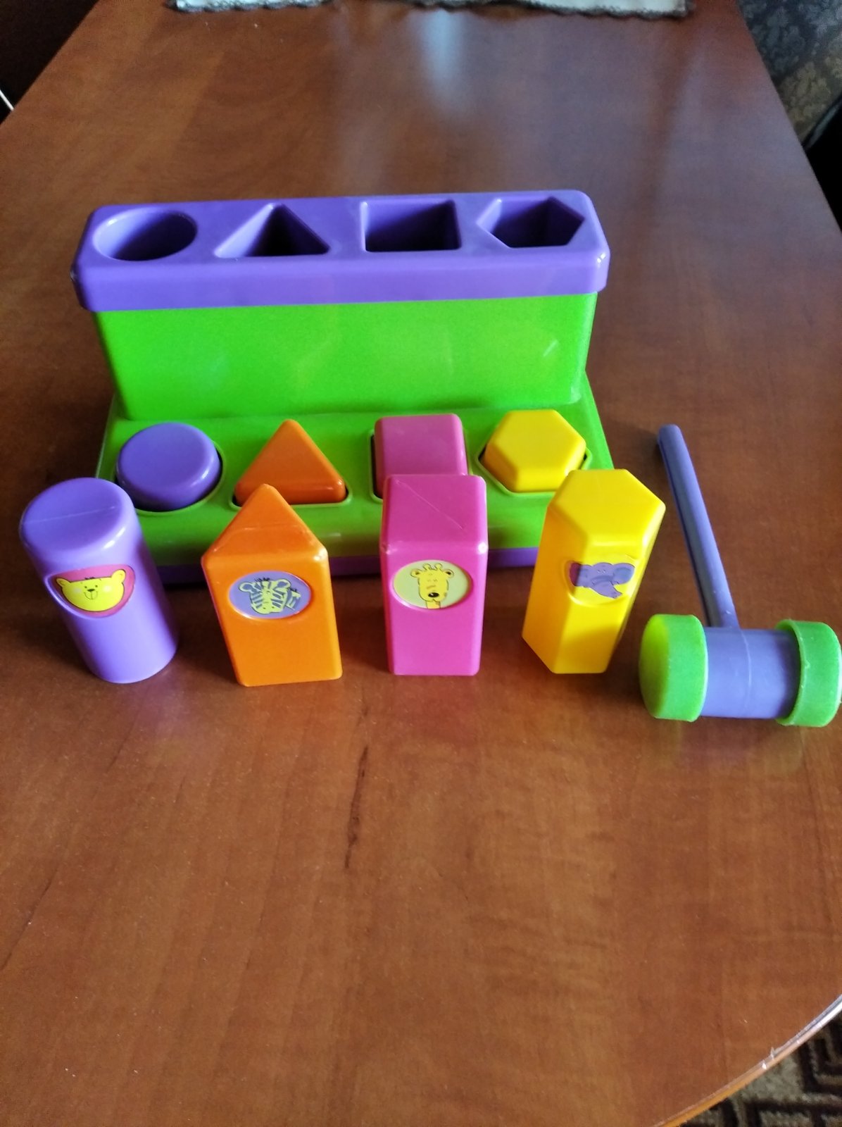 Plastová vkladacka. Pozostáva zo 4 geometrických tvarov s obrázkami zvieratiek, ktoré sa vkladajú podľa farby a tvaru. Pomocou kladivka sa vybijaju vonku. Vkladacka je v dobrom stave.
