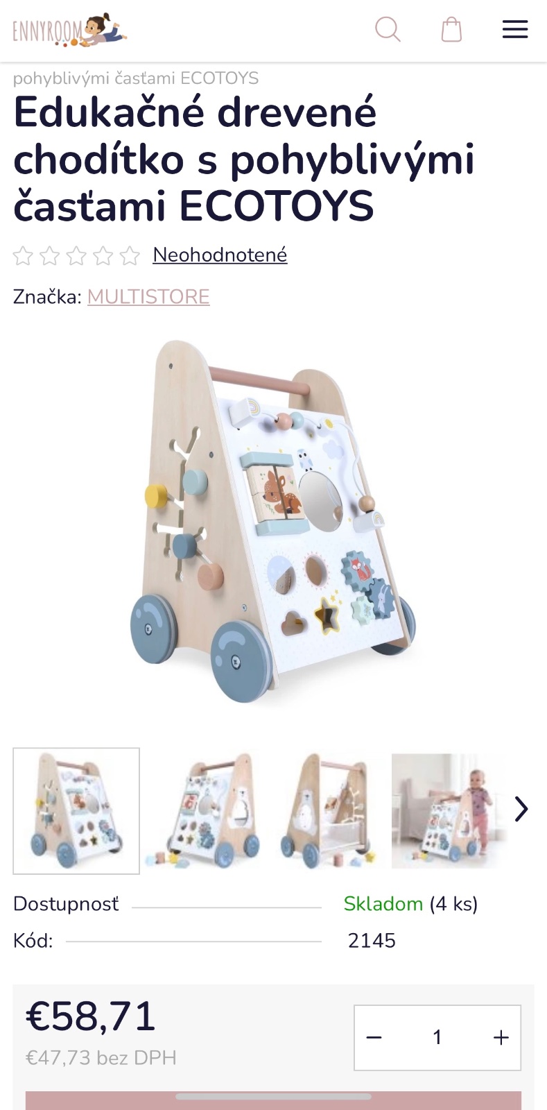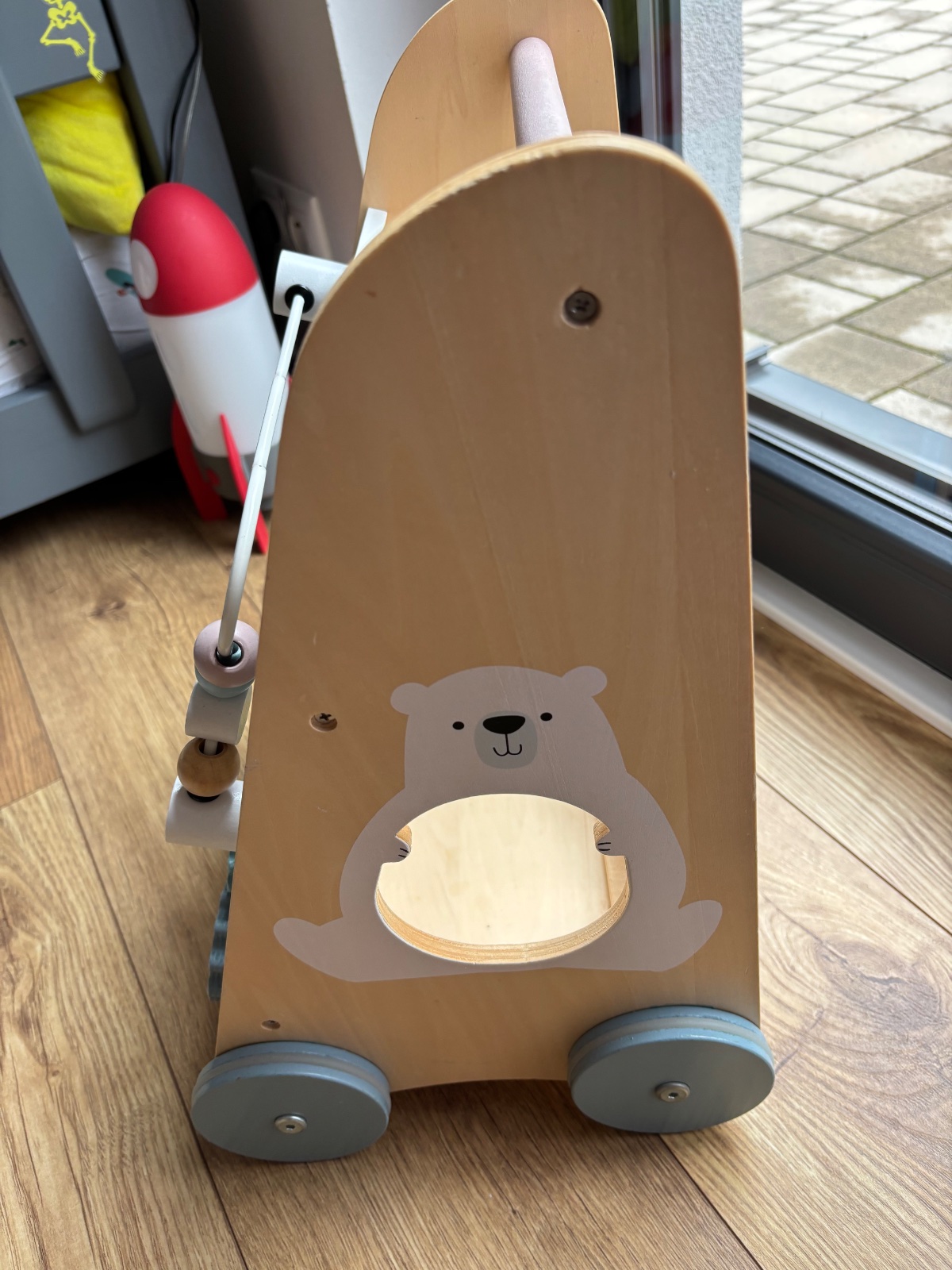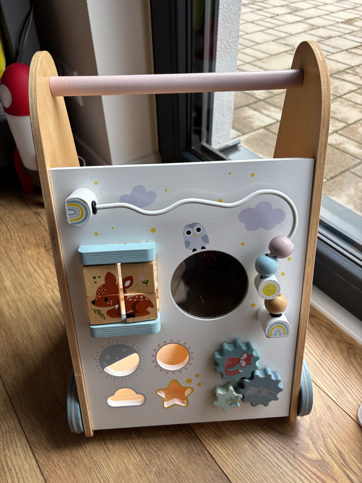 Predám edukačné drevenné chodítko s pohyblivými časťami ECOTOYS. Chodítko je po 1 dieťati, na kolieskách má gumičky, aby nehrkotalo. Drevenná kocka a kovový pásik trošku zošuchnutý (viď foto). Inak vo veľmi dobrom stave.