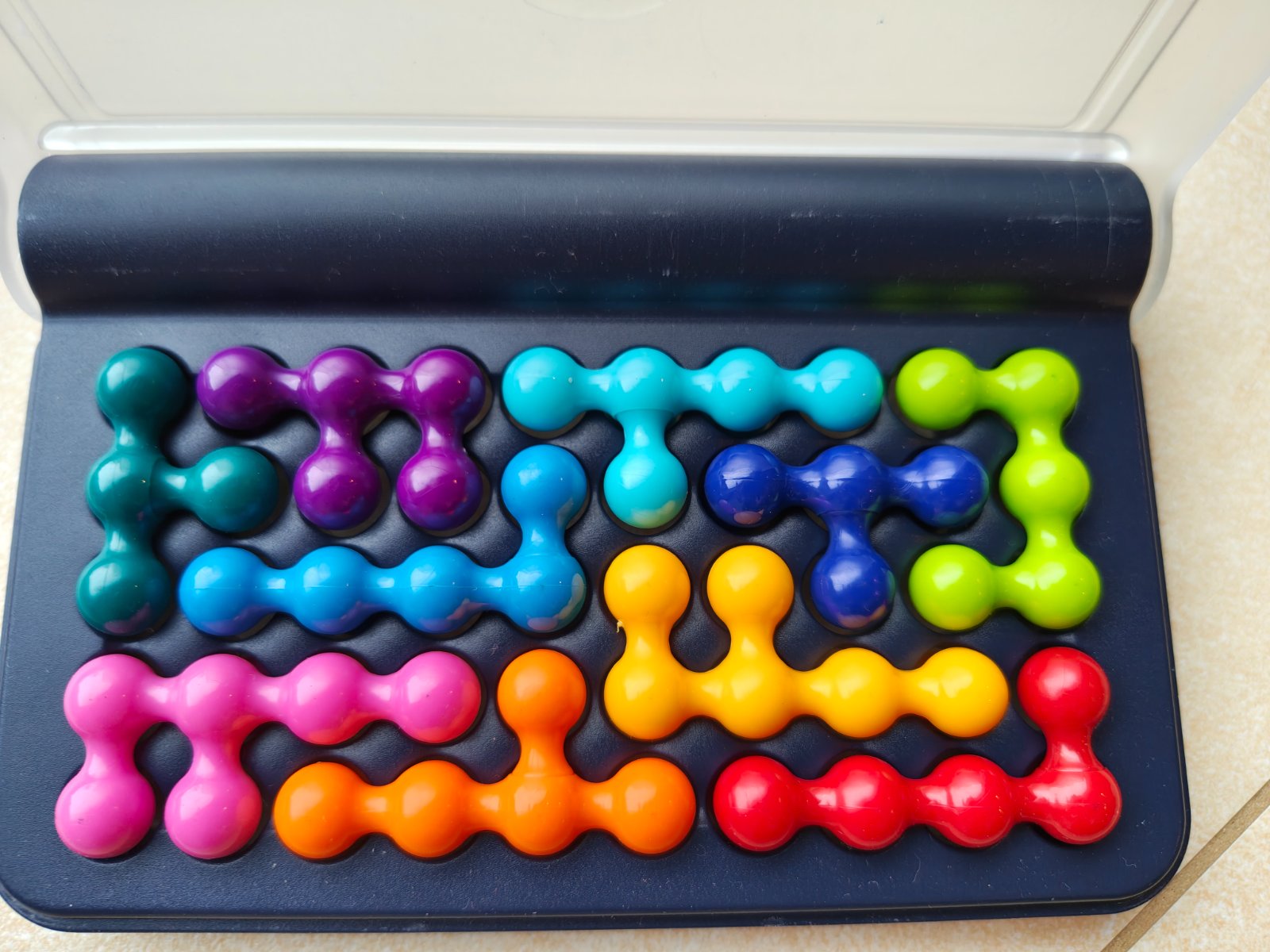 Predáme hlavolam s rozličnými náročnosťami. Vhodný od 6 rokov až po dospelých. Vhodný aj na cestovanie, keďže plastová krabička je veľmi praktická. Je k tomu návod aj zadania. Pôvodný kartónový obal je už poškodený, inak je všetko plne funkčné a ponúka inšpiráciu pre rozvoj detskej inteligencie.